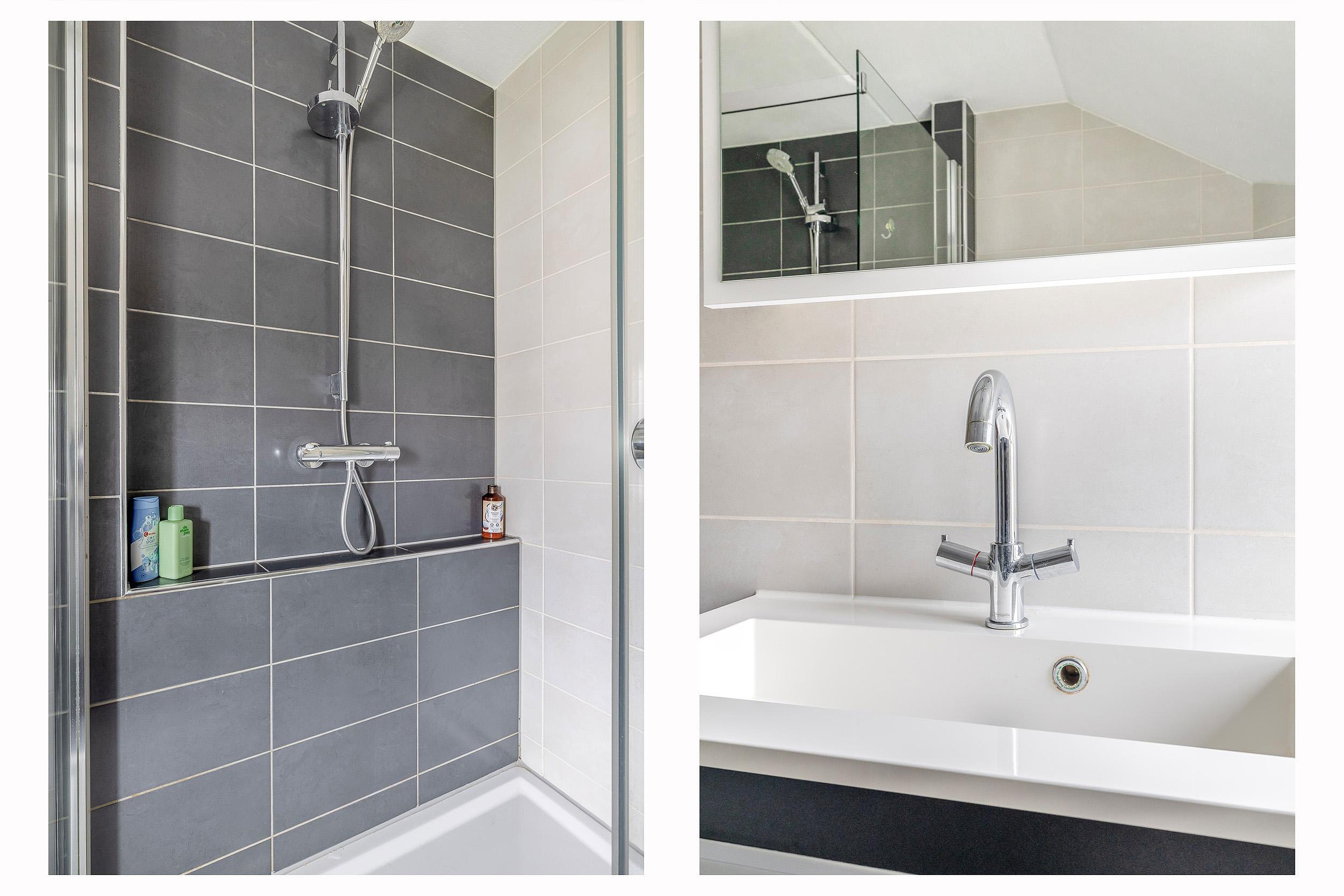 Eerste verdieping Via een vaste trap bereikt u de overloop op de eerste verdieping. Deze overloop biedt toegang tot drie ruime slaapkamers en de badkamer. De grootste slaapkamer ligt aan de voorzijde, deels boven de entree en de garage; hier is veel bergruimte onder de schuine zijde gecreëerd. De overige twee slaapkamers zijn eveneens ruim opgezet. De badkamer is volledig betegeld en voorzien van een inloopdouche met glazen scherm, een wastafelmeubel en een tweede vrijhangend toilet.