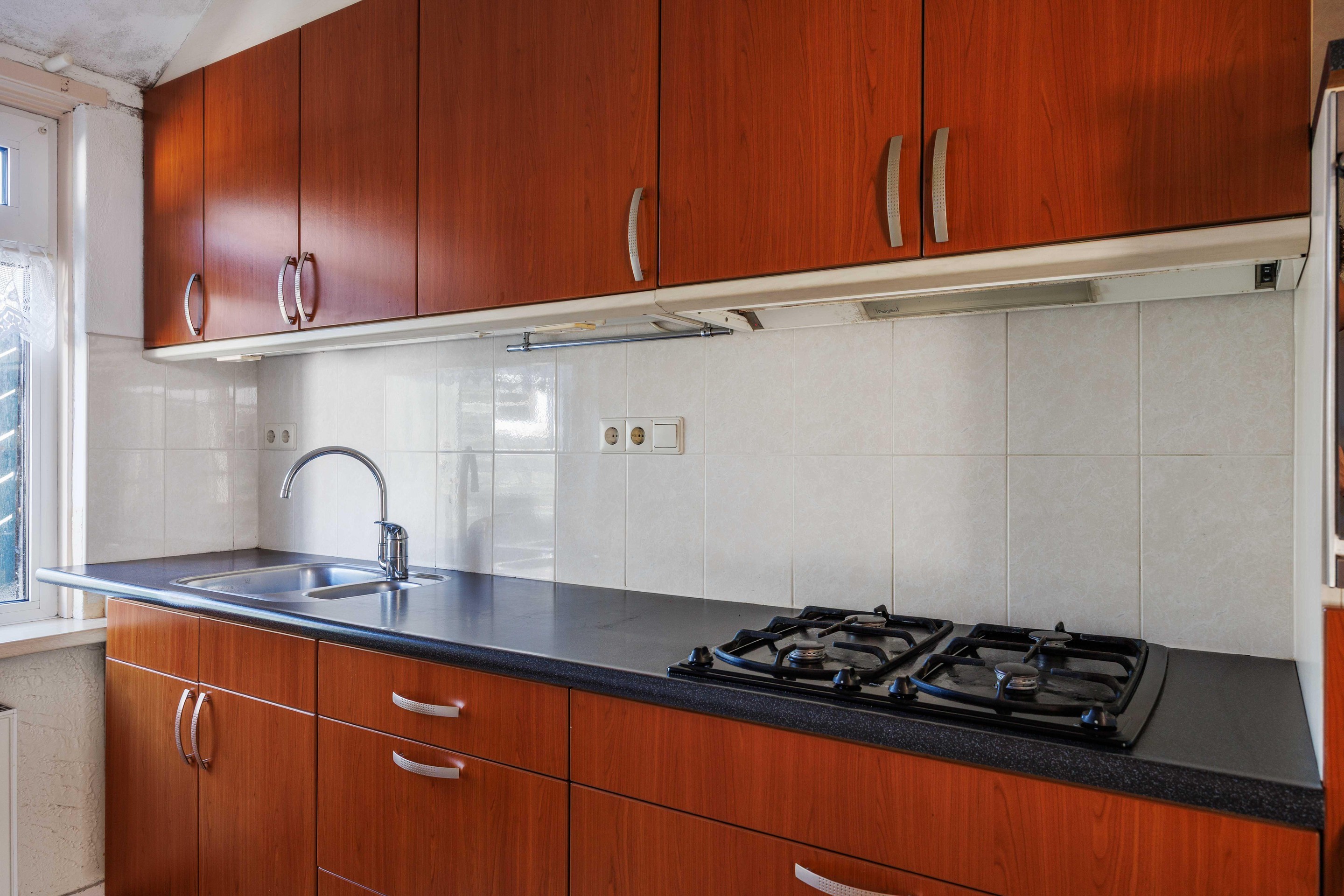 Vanuit de woonkamer is de verdiepte kelder aanwezig en tevens toegang tot de keuken met rechte opstelling, voorzien van koeler, combi magnetron/oven, spoelbak en 4-pits gaskomfoor met afzuiging.