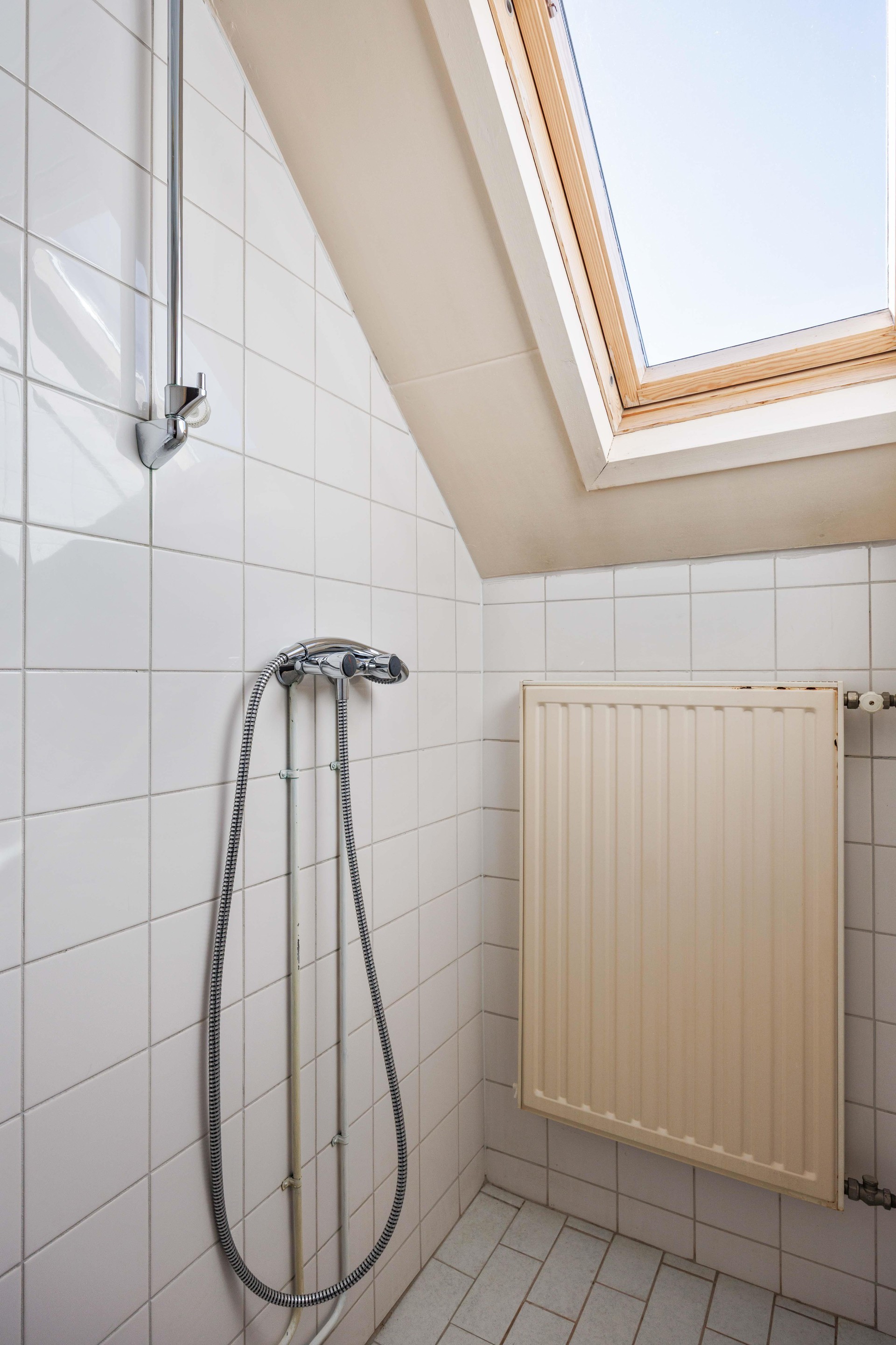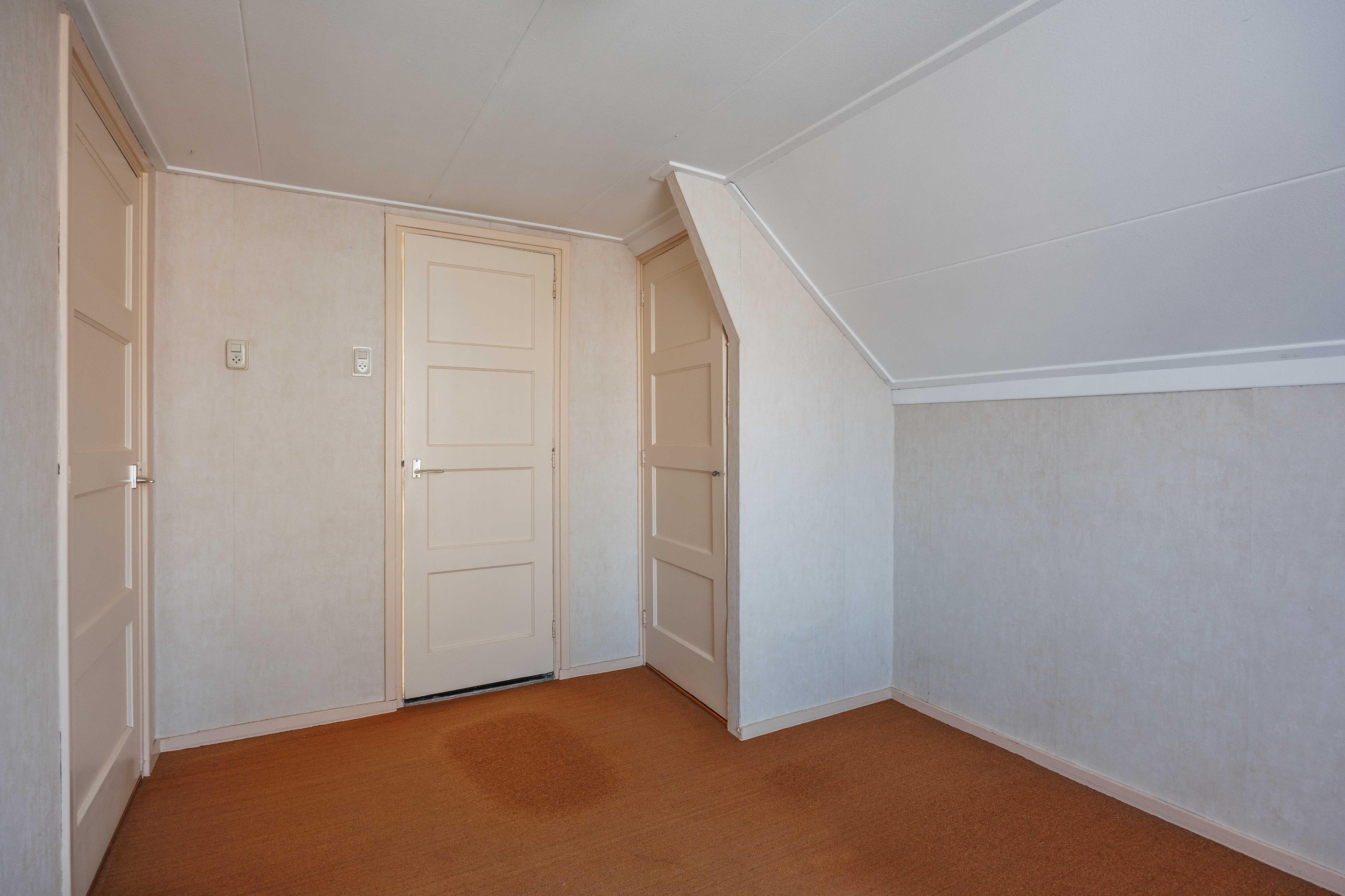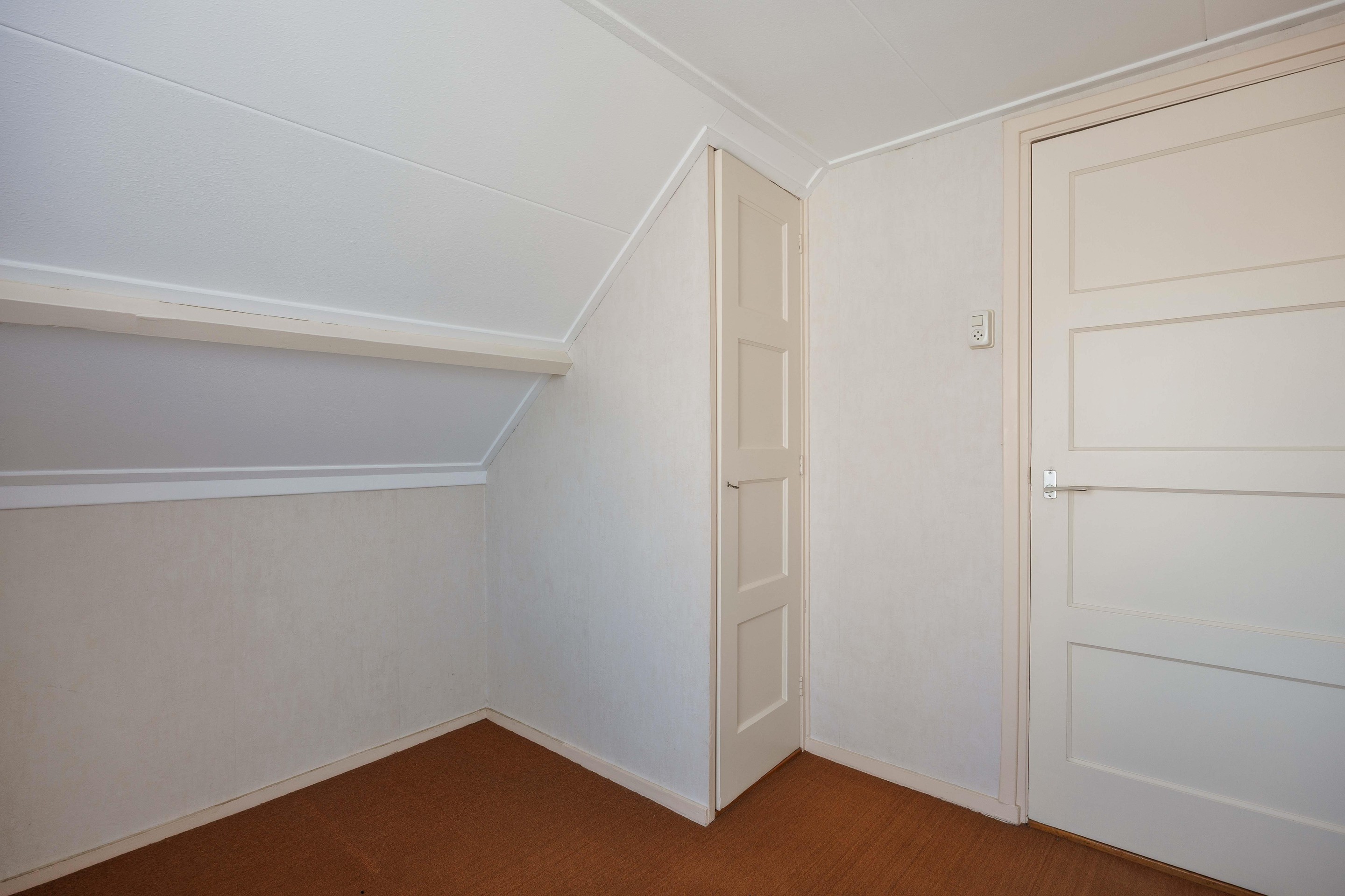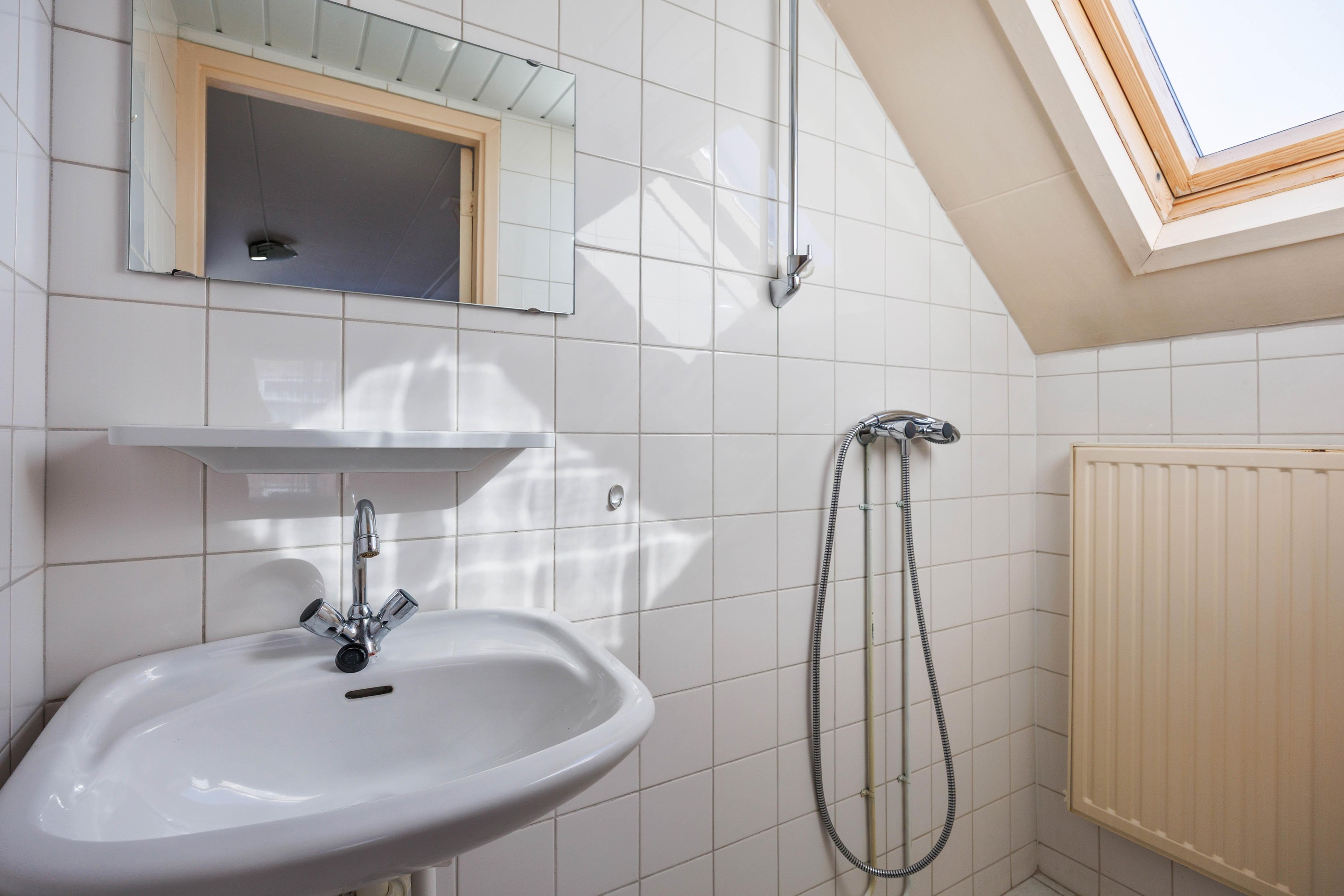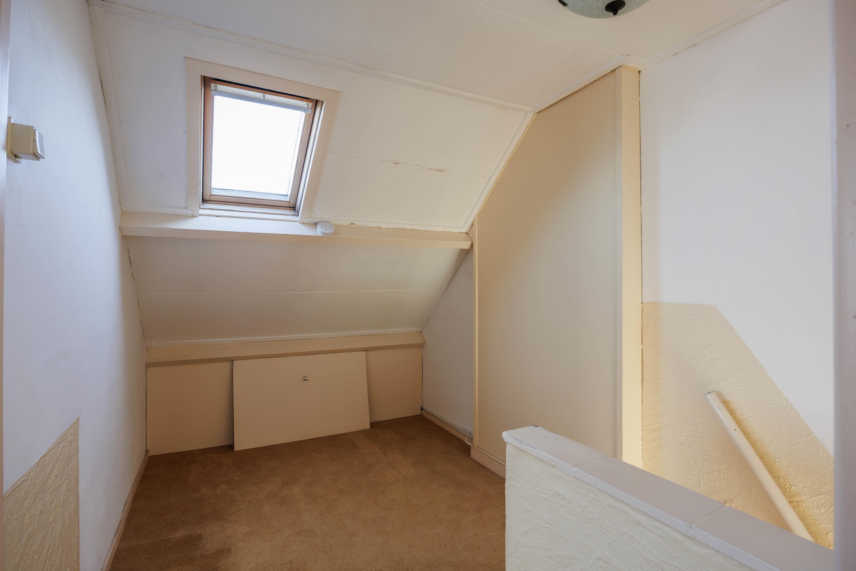 Middels vaste rechte trap toegang tot de verdieping met overloop met dakraam, twee slaapkamers met vaste kasten en een kleine badkamer met douche en vaste wastafel en ook voorzien van een dakraam.