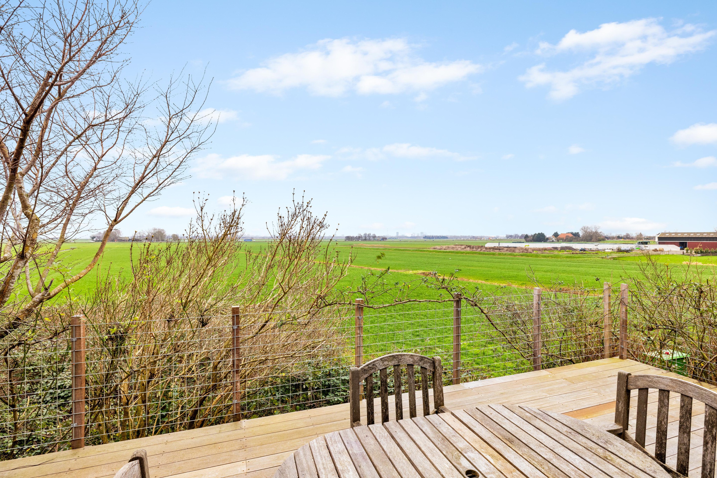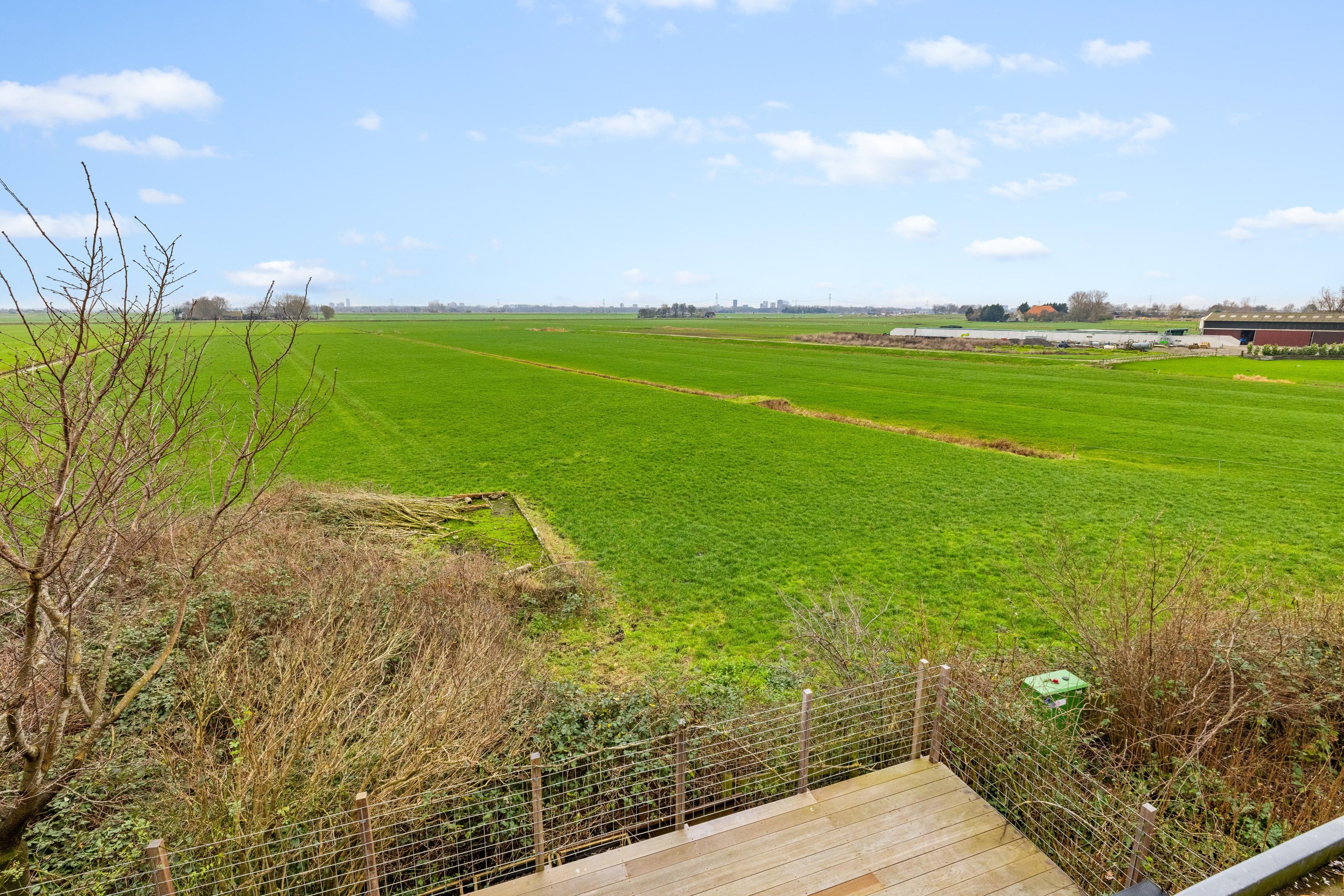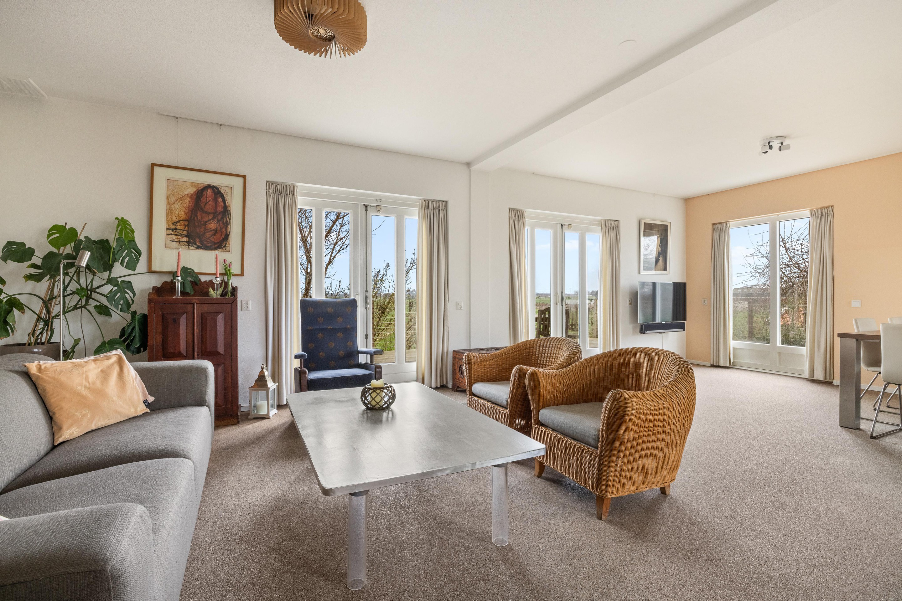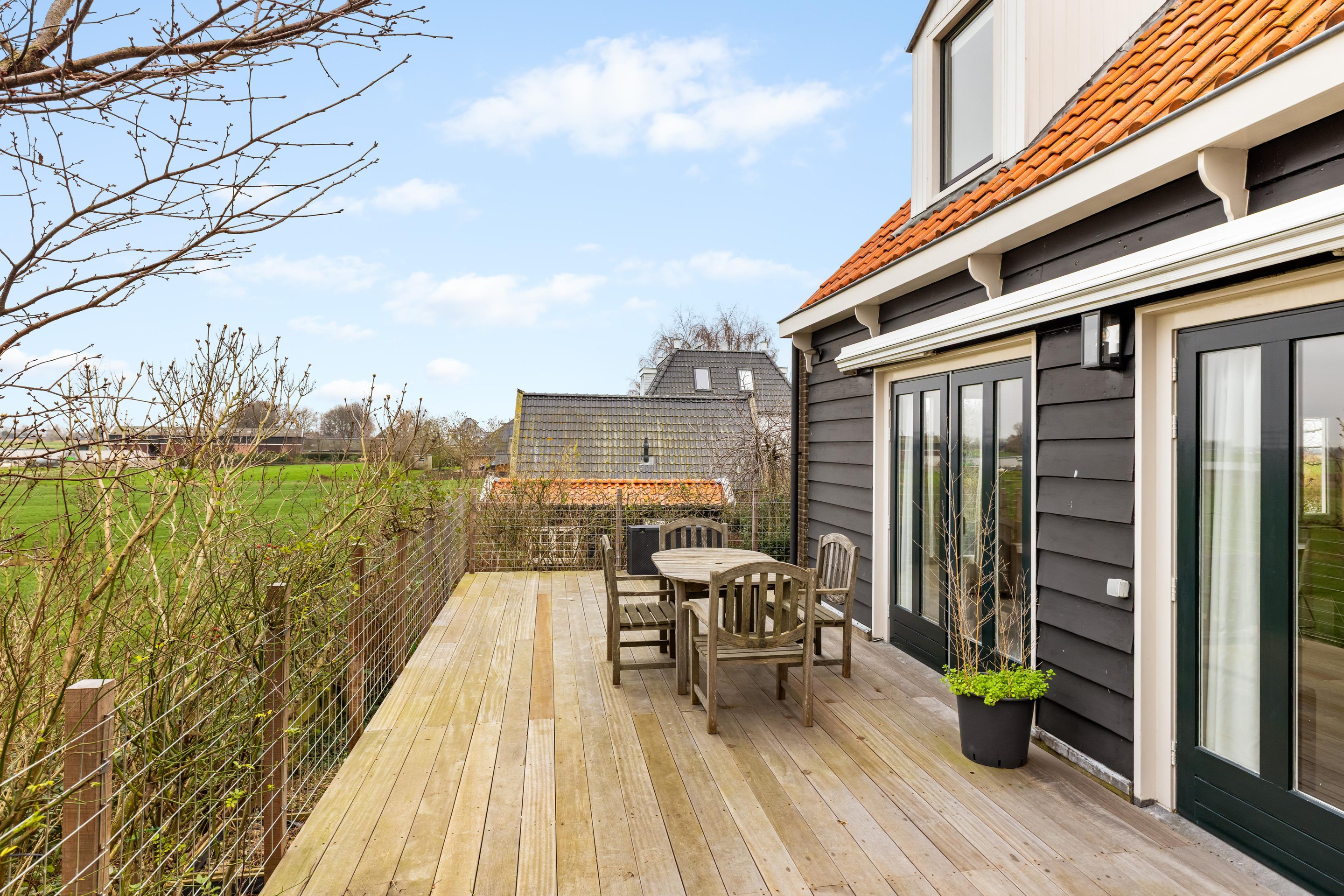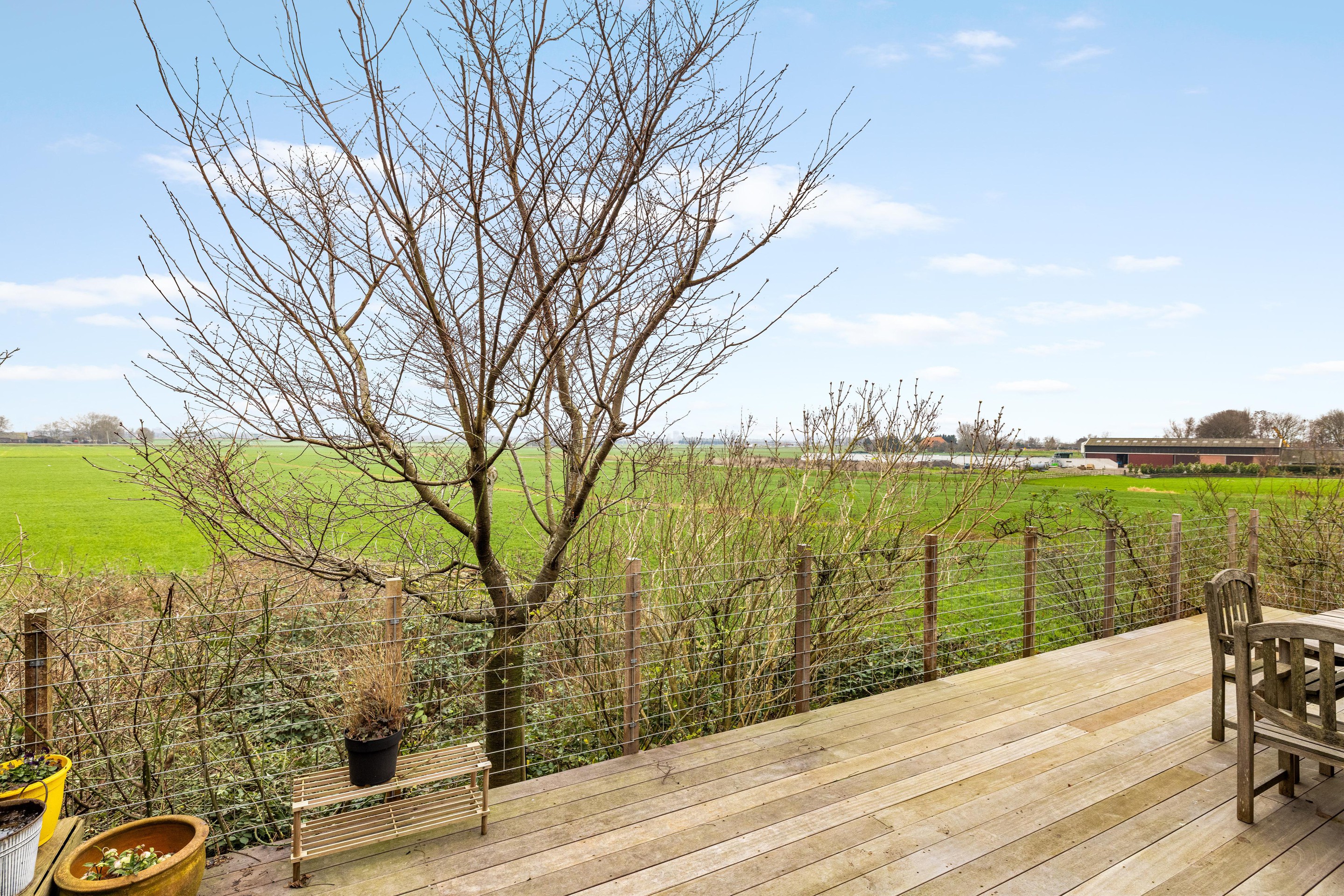Middels de openslaande deuren bereikt u het in 2025 aangelegde, royale terras/veranda van ca. 50 m2, gelegen op het zuiden. Hier geniet u de hele dag van de zon en van een adembenemend vrij uitzicht over de weilanden, een unieke plek om volledig tot rust te komen.