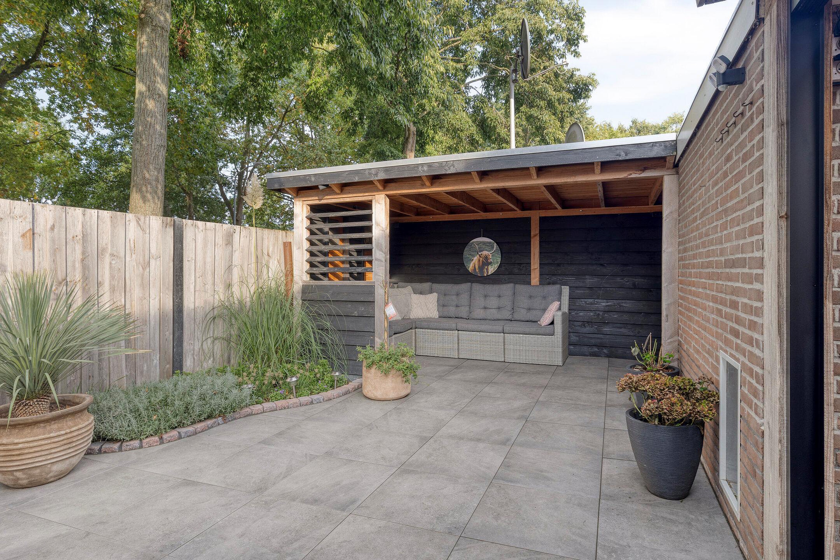 De tuin is gelegen op het noorden. Achter de woning bevindt zich een overkapping met glazen schuifwanden. Daarnaast heeft de woning een aangebouwde schuurruimte met overkapping. De tuin is tevens middels een achterom bereikbaar.