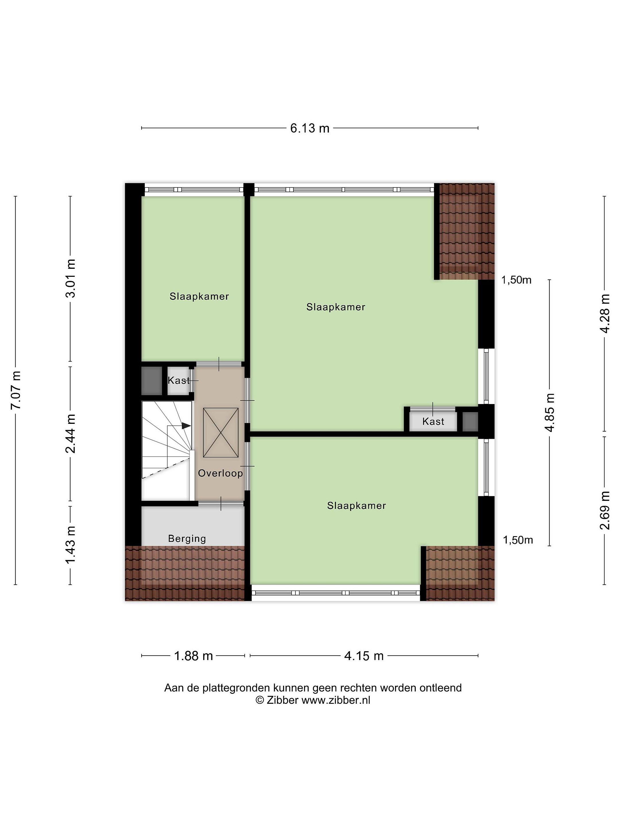 Eerste verdieping Op de verdieping is een overloop met drie volwaardige slaapkamers en een bergkast. Bovenin de overloop zit het luik naar de bergzolder.