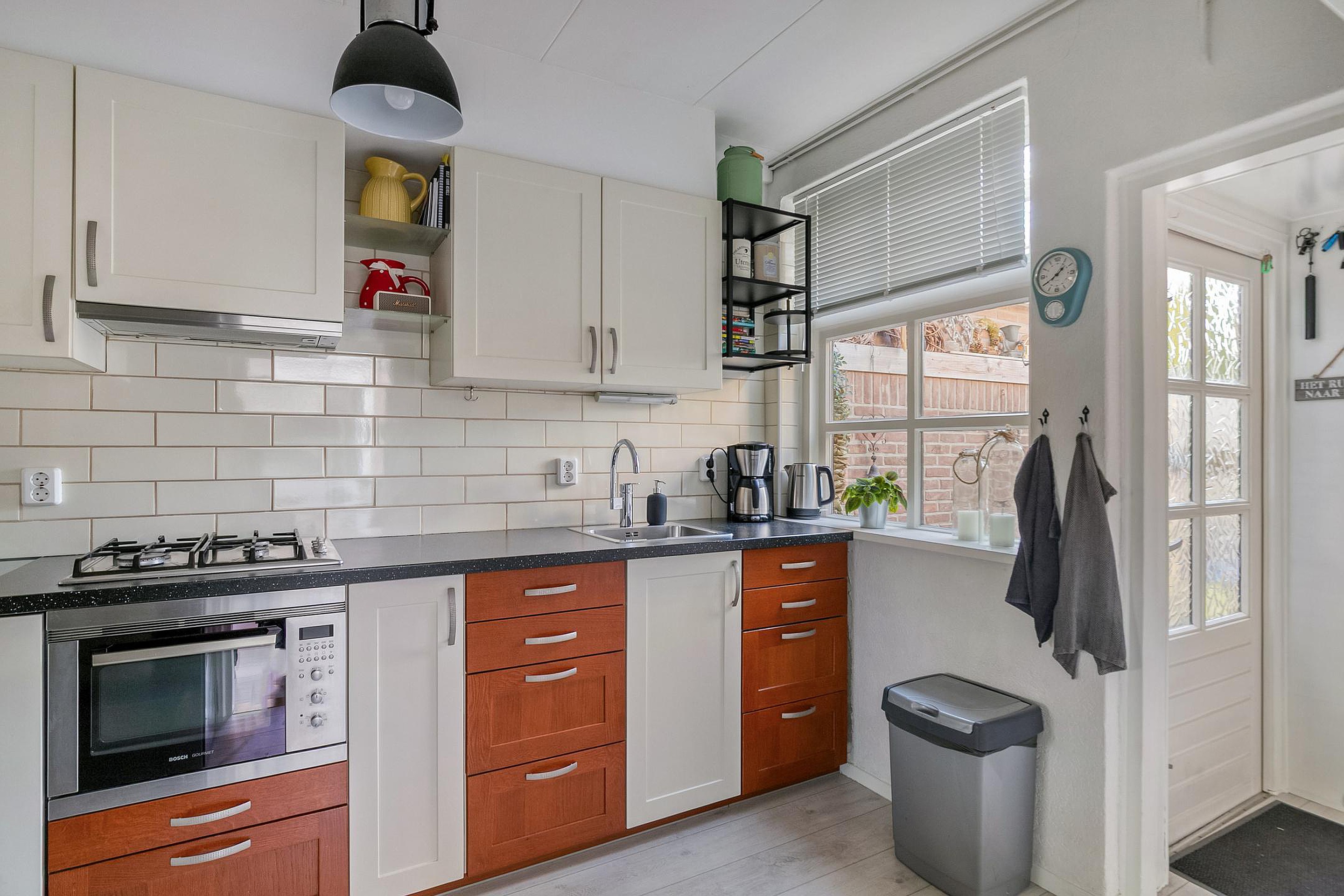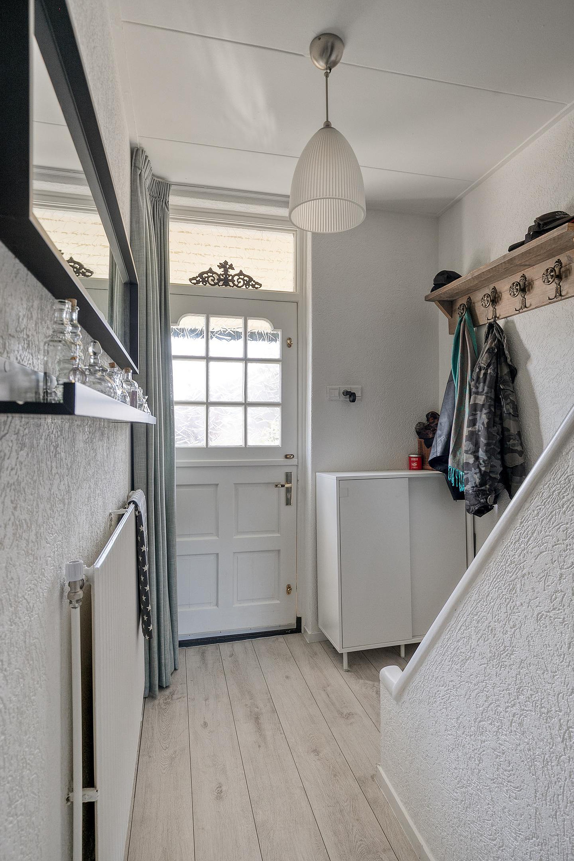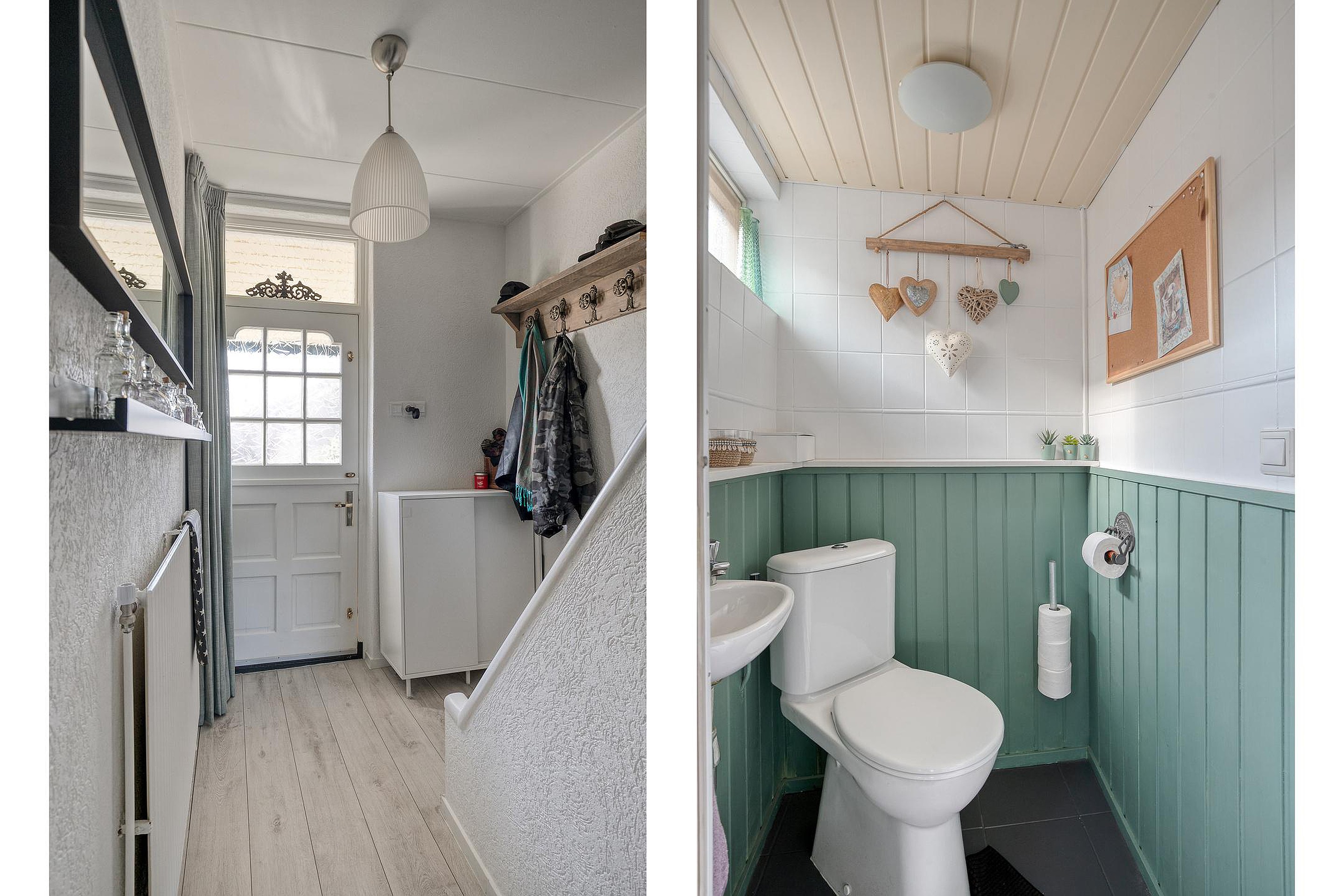 Vanuit een tussenhal achter de keuken zijn het toilet, de badkamer (2025) en deur naar de achtertuin bereikbaar.