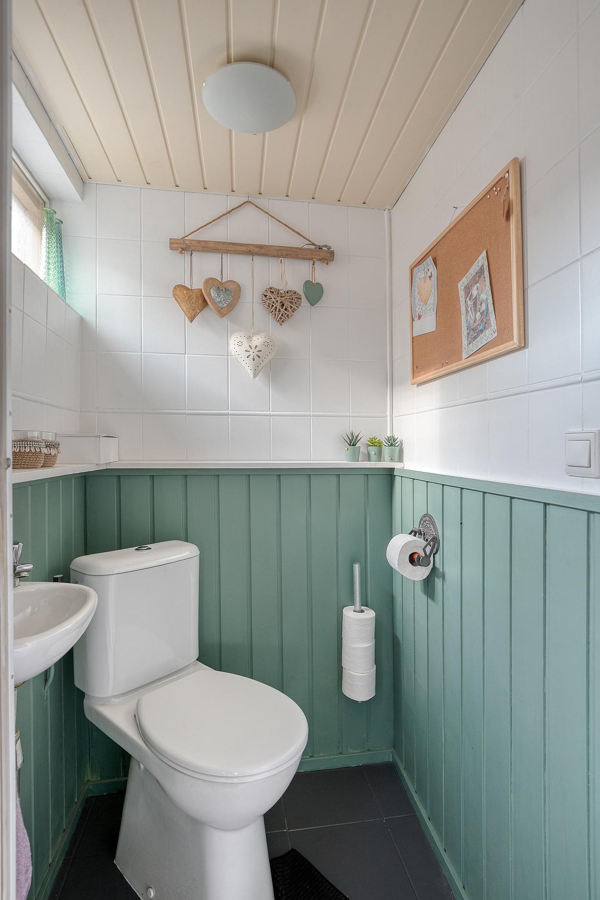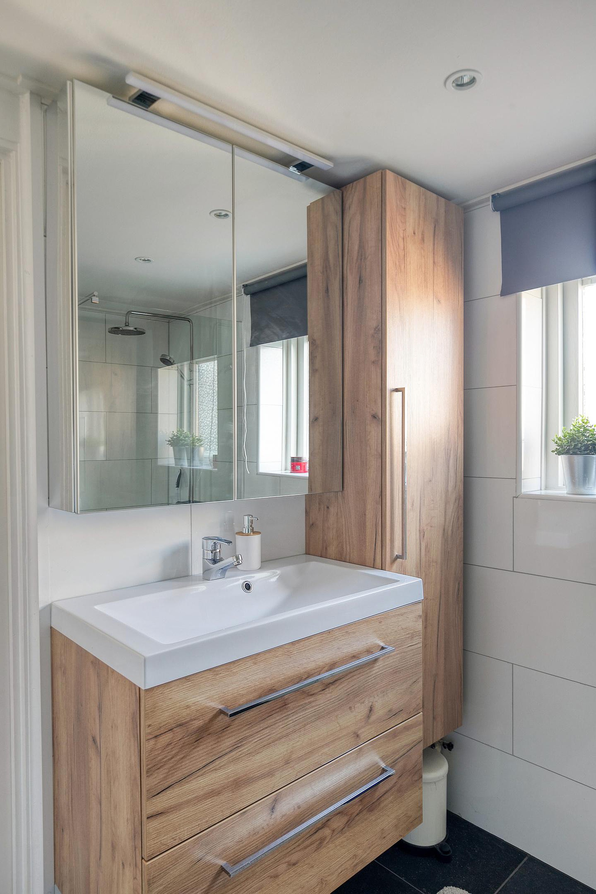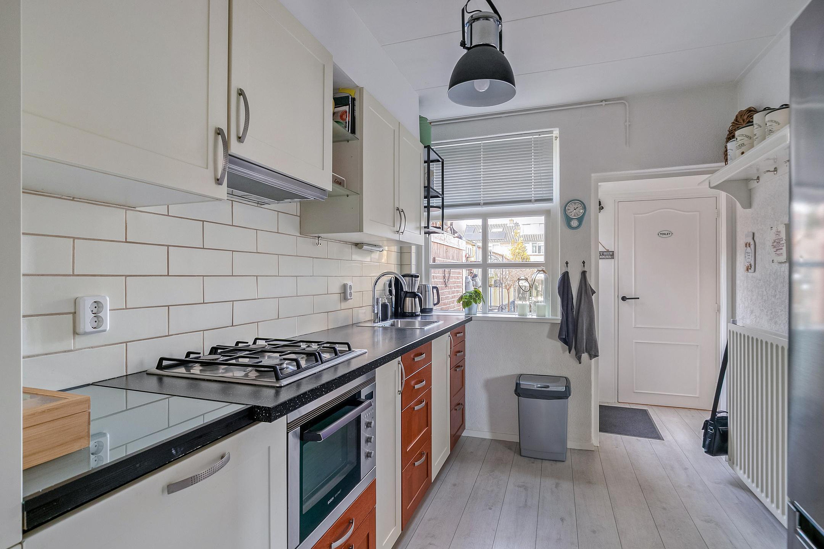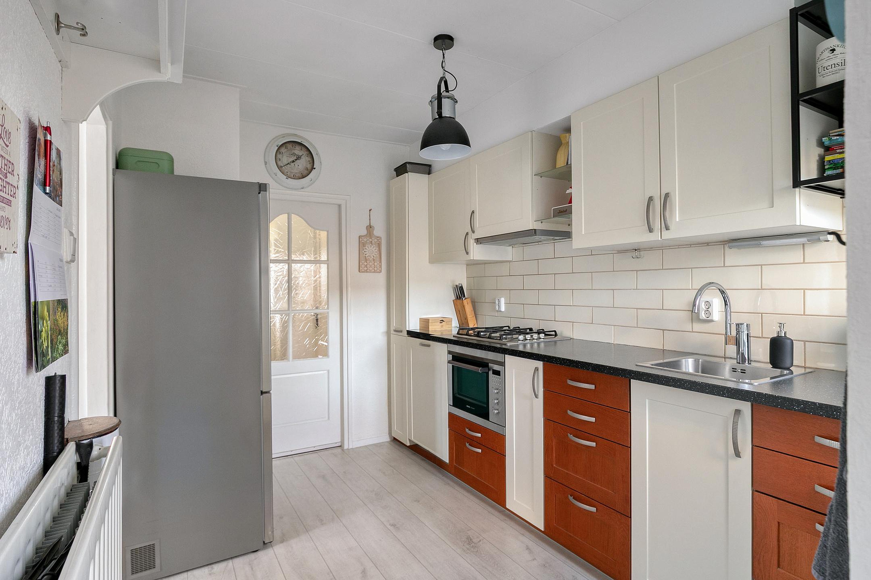 Vanuit een tussenhal achter de keuken zijn het toilet, de badkamer (2025) en deur naar de achtertuin bereikbaar.