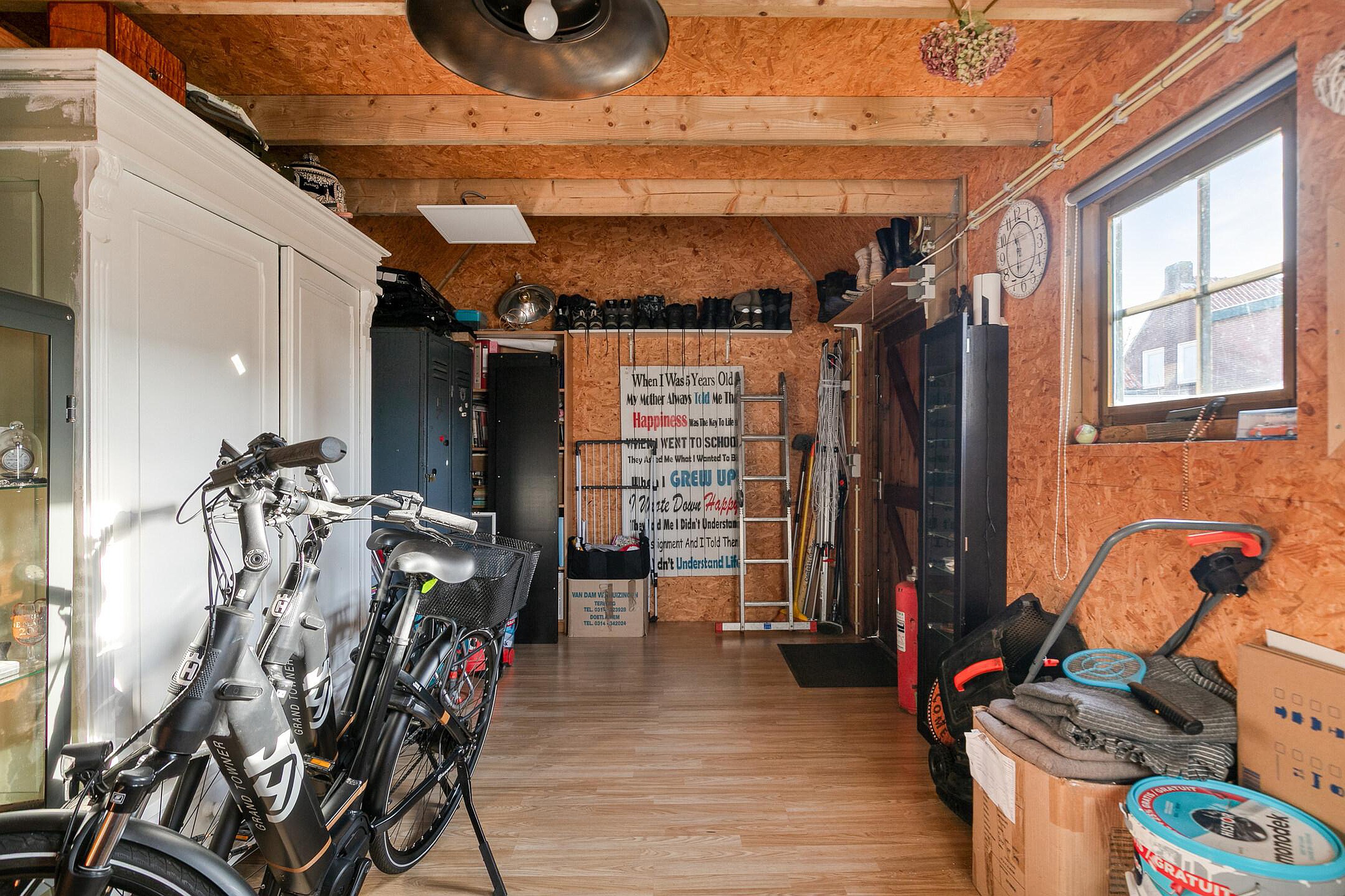 De ruime garage is aan de achterzijde voorzien van een ruime separate werkruimte met een keukentje. Deze ruimte is geïsoleerd en heeft voorzieningen zoals water, elektra en riool. Daarom kan deze ruimte voor meerdere doeleinden gebruikt worden, denk aan een praktijk/kantoor aan huis of een mantelzorg functie.