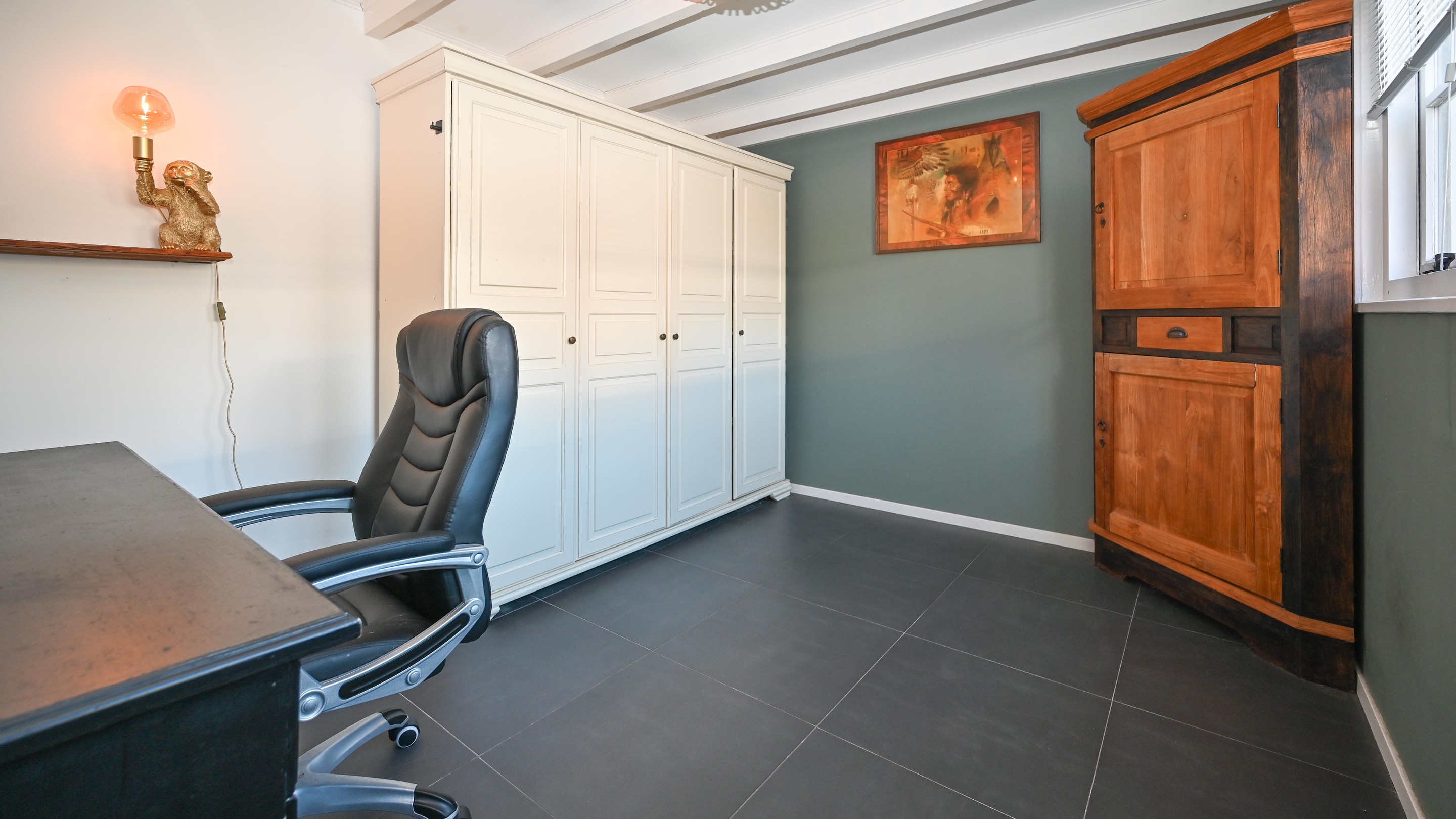 Burgemeester Eschauzierstraat 23 beschikt over een lichte woonkamer met een prettige lichtinval en een moderne, verzorgde uitstraling. Aansluitend bevindt zich de halfopen keuken met een knusse eethoek, uitgevoerd in een eigentijdse stijl en voorzien van diverse inbouwapparatuur. De keuken loopt door naar de aanbouw, waartussen zich de badkamer bevindt, uitgerust met een douche, wastafel en toilet. De aanbouw is praktisch ingedeeld en beschikt over een hal/bijkeuken met een separaat toilet en toegang tot zowel de steeg als de achtertuin. Daarnaast bevindt zich hier een ruime extra kamer, momenteel in gebruik als kantoor, maar desgewenst eenvoudig in te richten als slaapkamer op de begane grond. Op de verdieping zet de nette afwerking zich voort, waar zich twee volwaardige slaapkamers bevinden. De indeling is praktisch en sluit goed aan op uiteenlopende woonwensen.