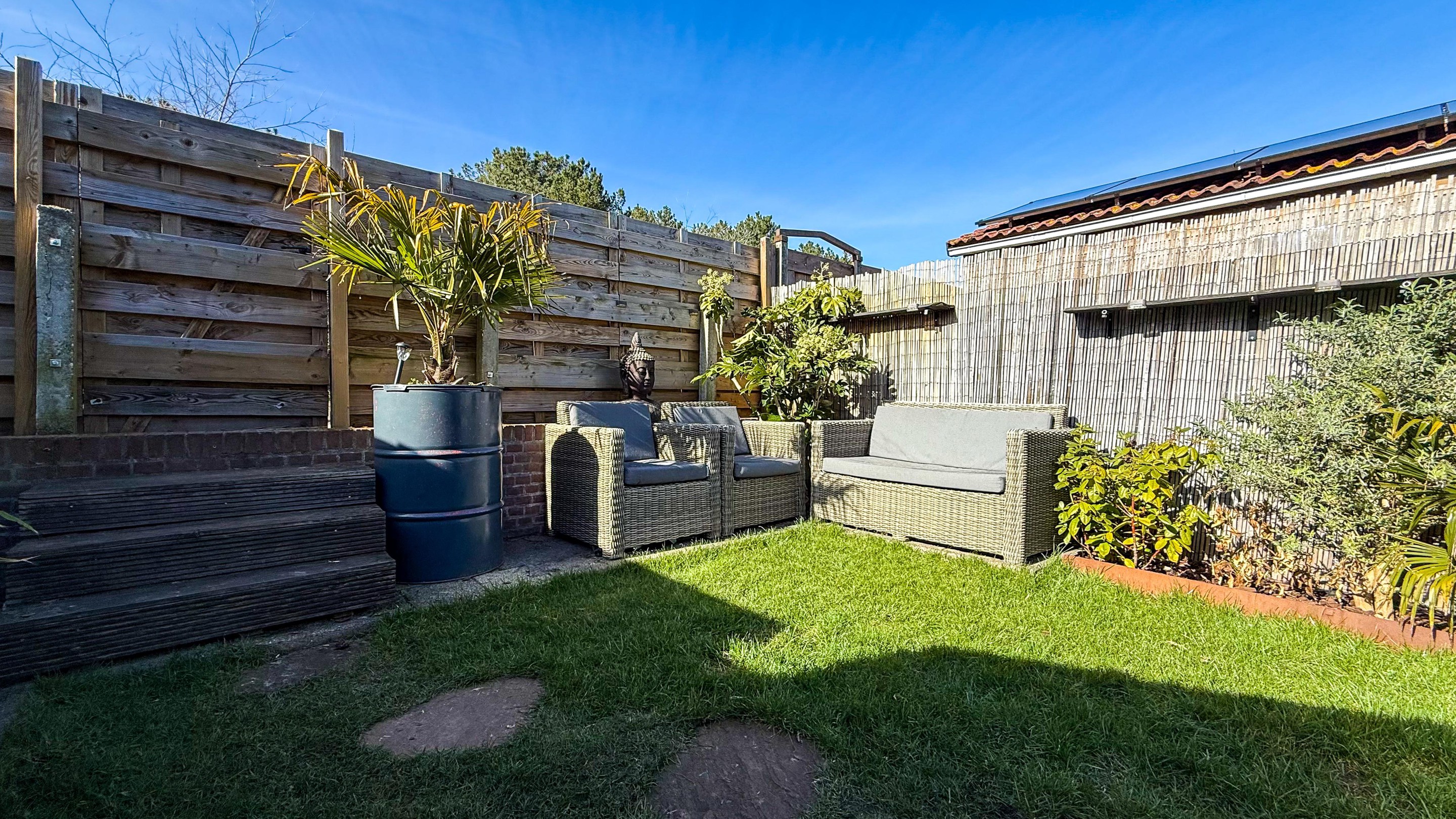 De woning beschikt over een diepe, ruim ingerichte achtertuin met een praktische tuinentree aan de Zwarteweg.
