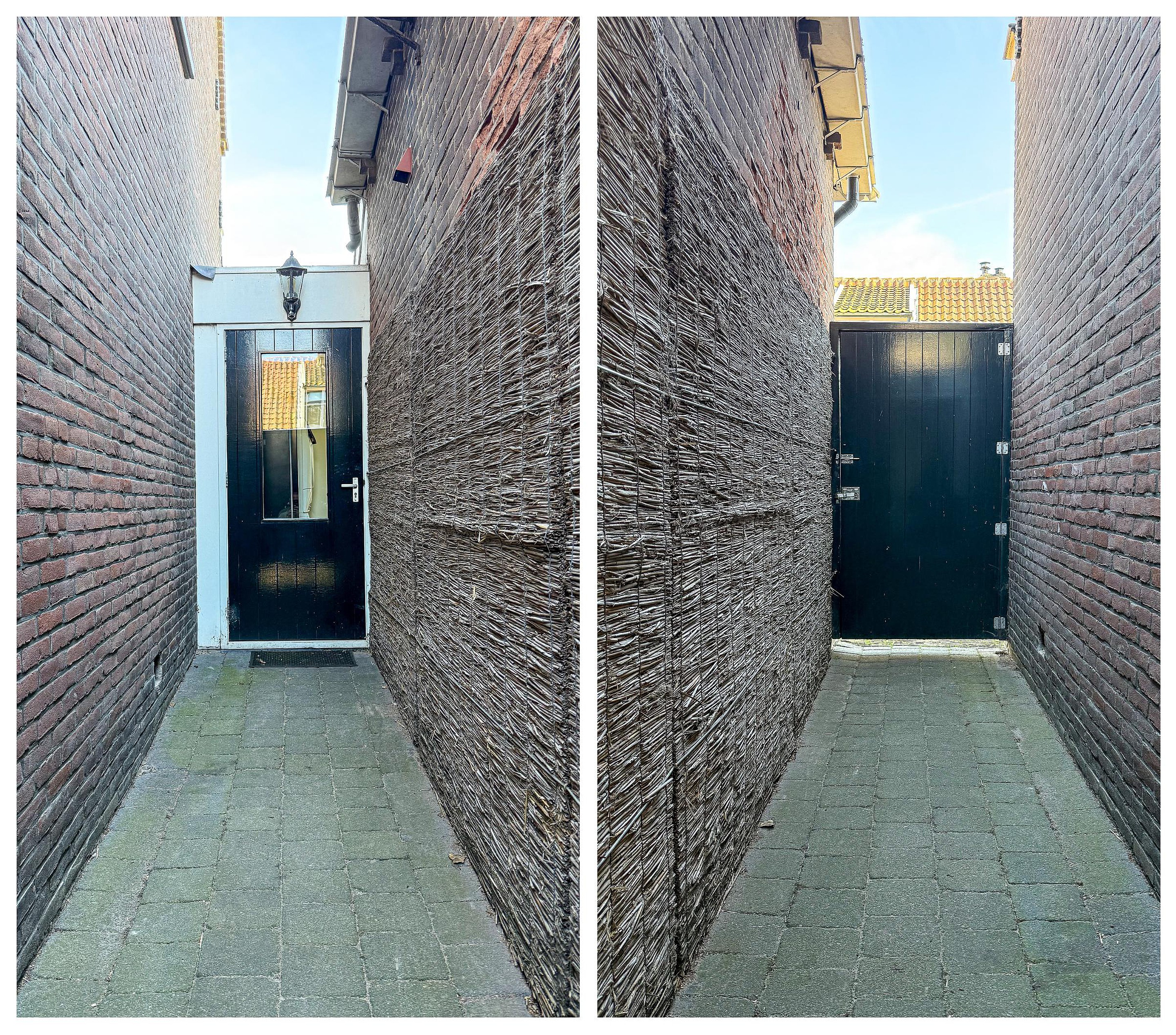 * Burg. Eschauzierstraat 23 heeft een zuidelijke steeg naar de bijkeuken/hal en een tuinentree aan de Zwarteweg.
