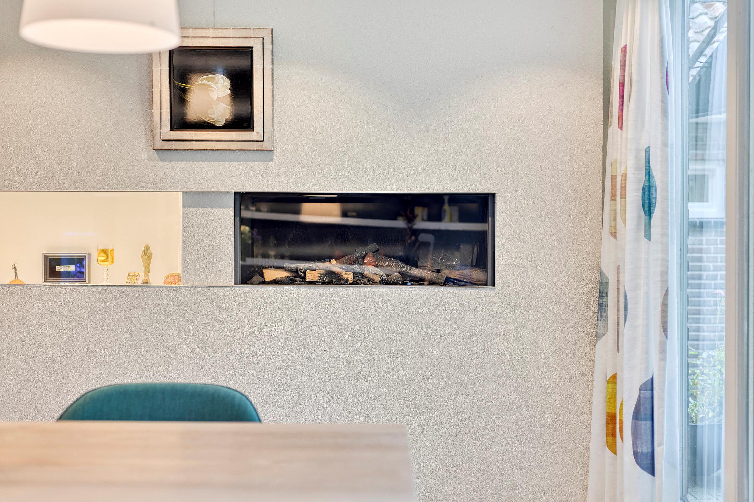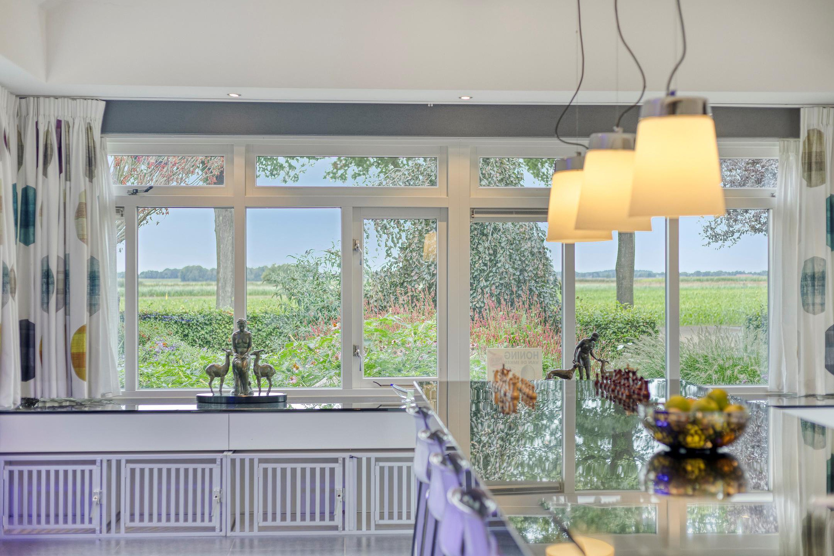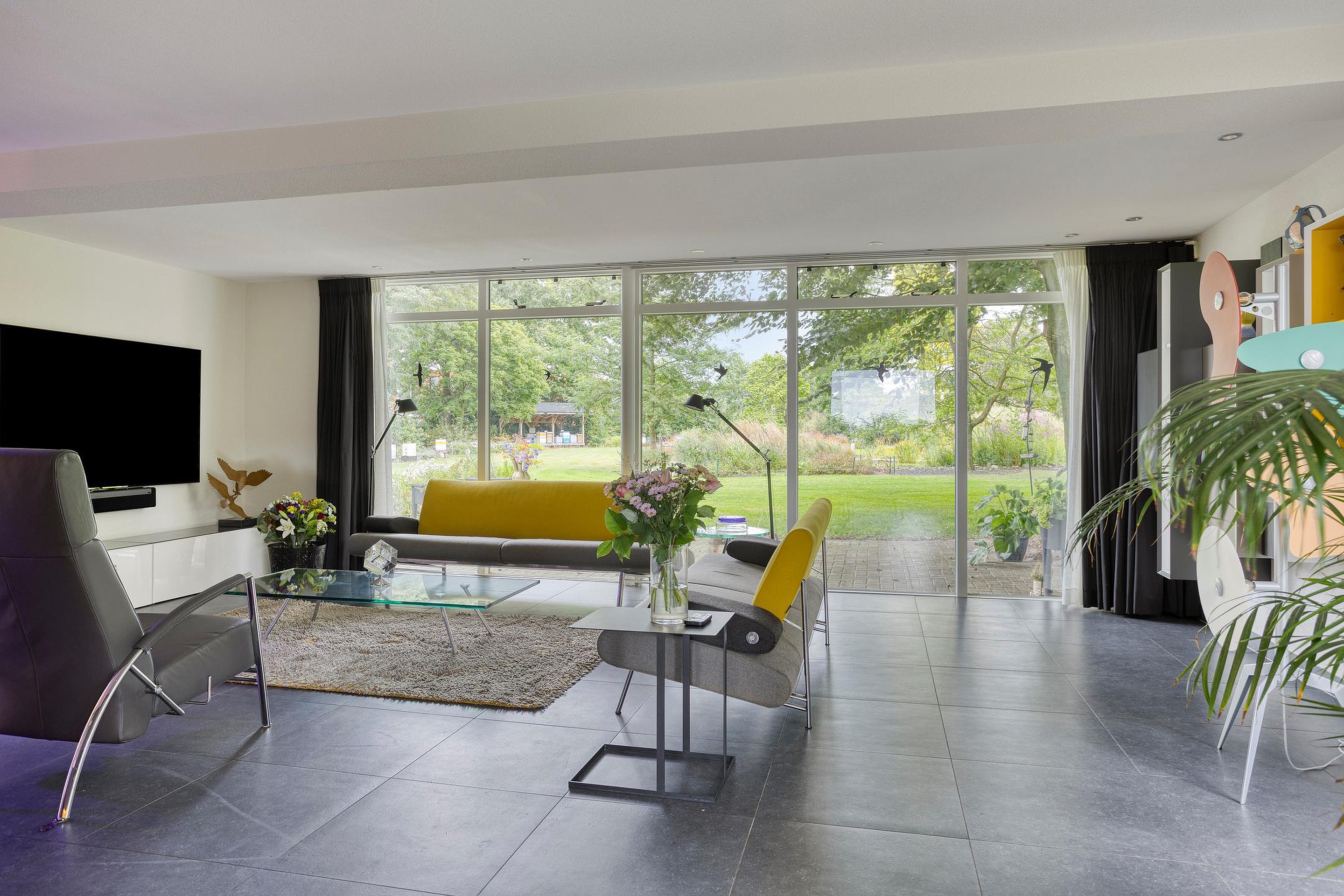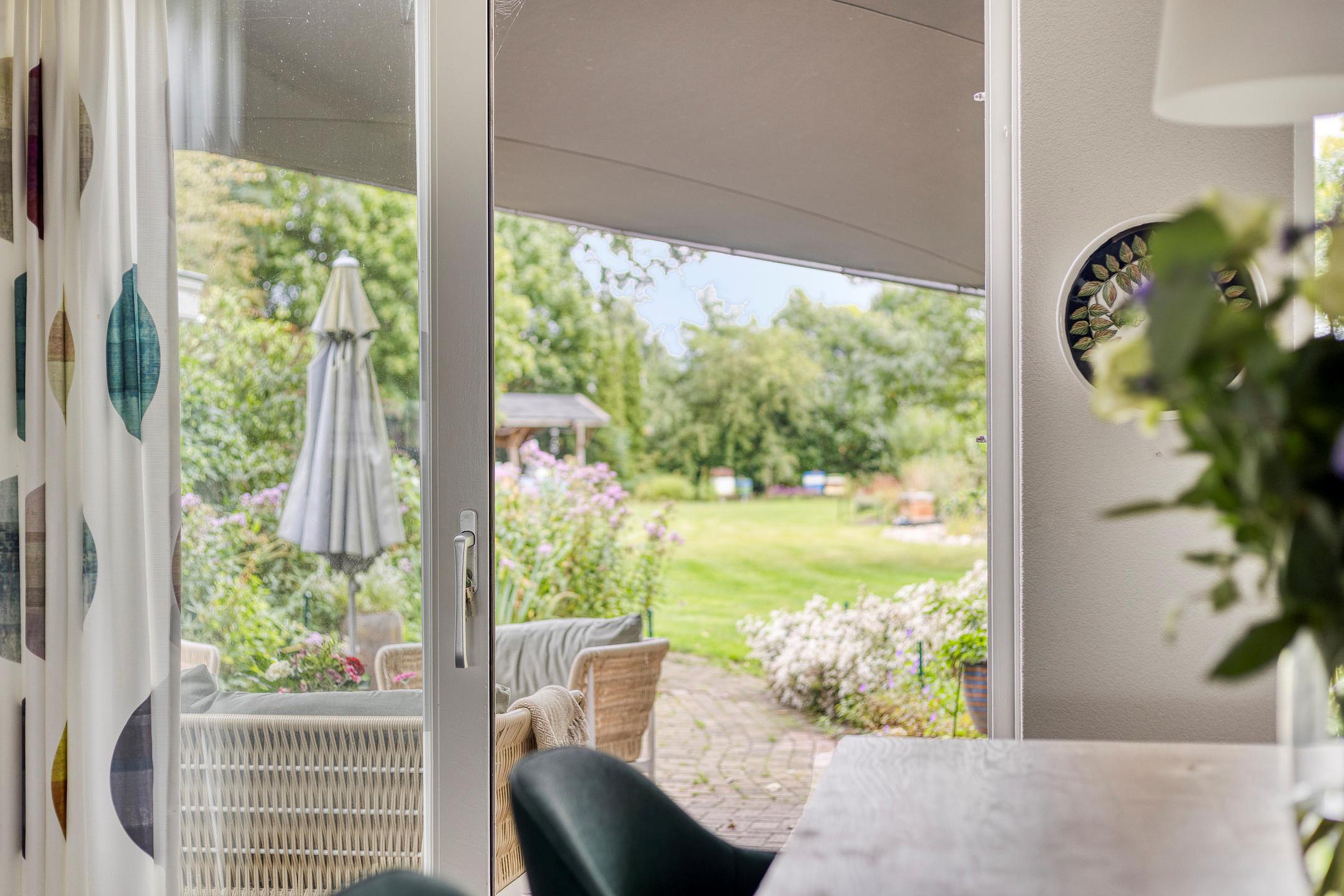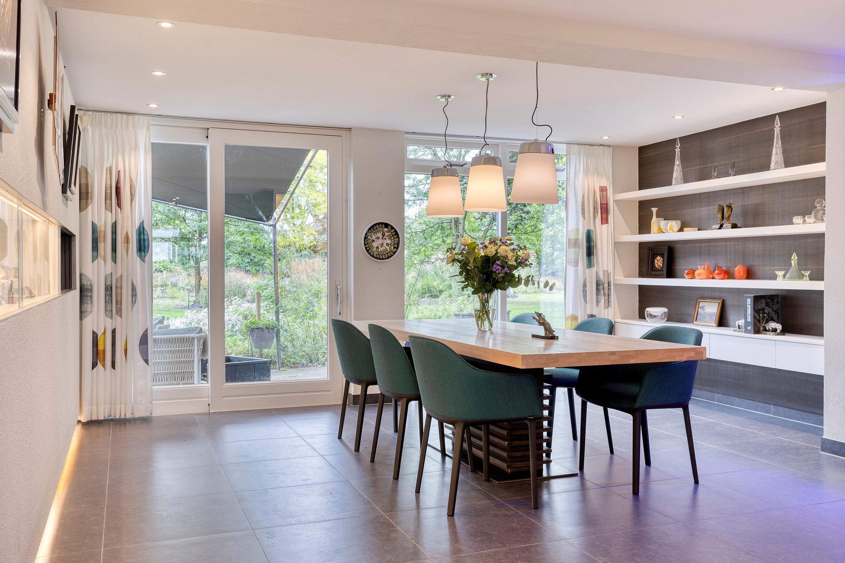 Vanuit de eethoek kunt u via een schuifpui naar het achterliggend terras en van daaruit door de tuin struinen om te genieten van deze onder architectuur aangelegde tuin.