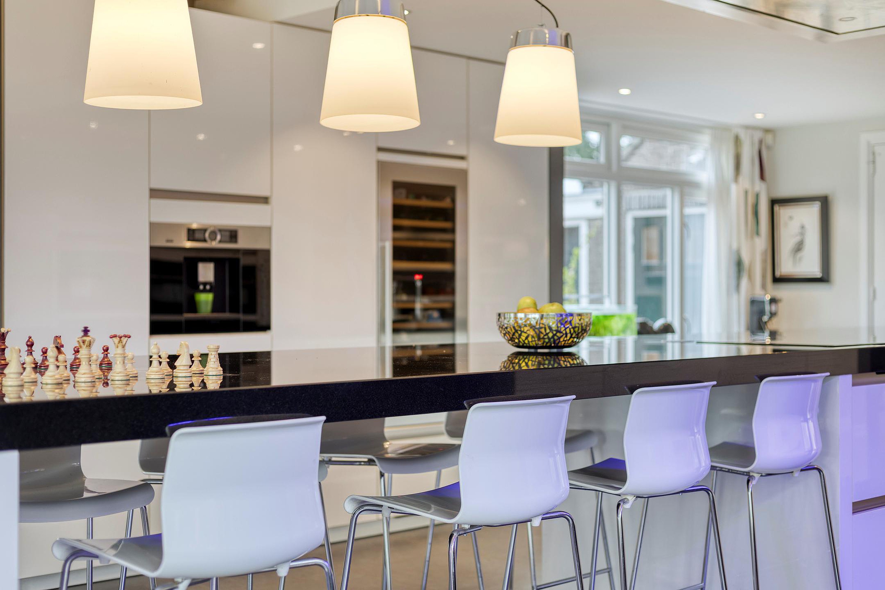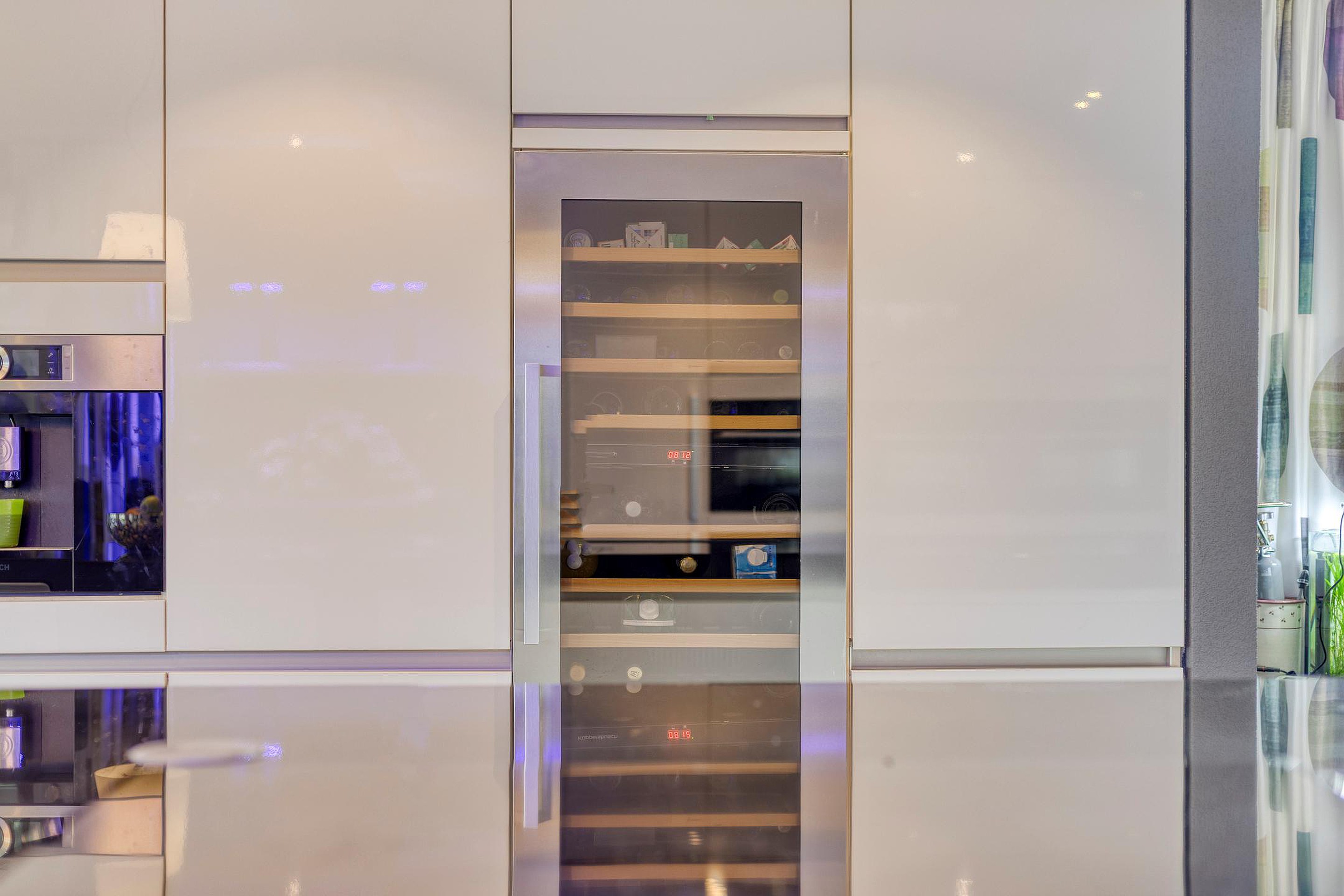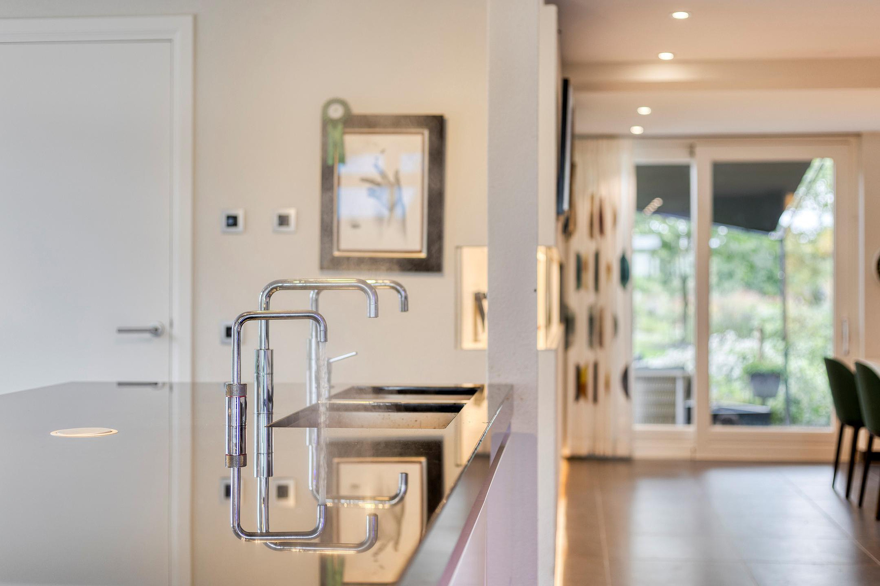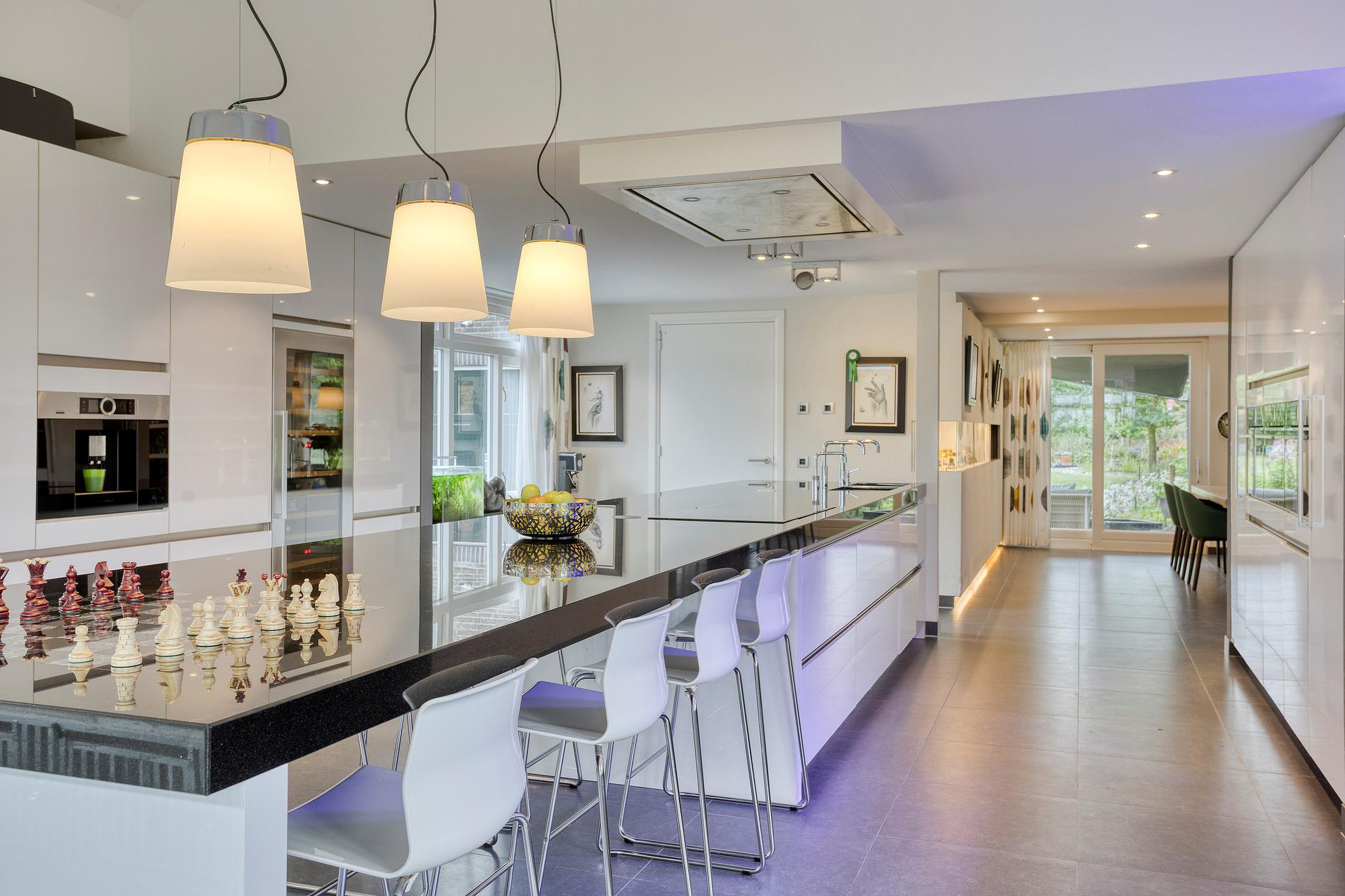 De keuken heeft naast de gebruikelijke inbouwapparatuur ook een quooker, stoomoven en zelfs een wijnkoeler. Vanuit de keuken krijgt u toegang tot de bijkeuken met witgoedopstelling, de meterkast en de kelder.