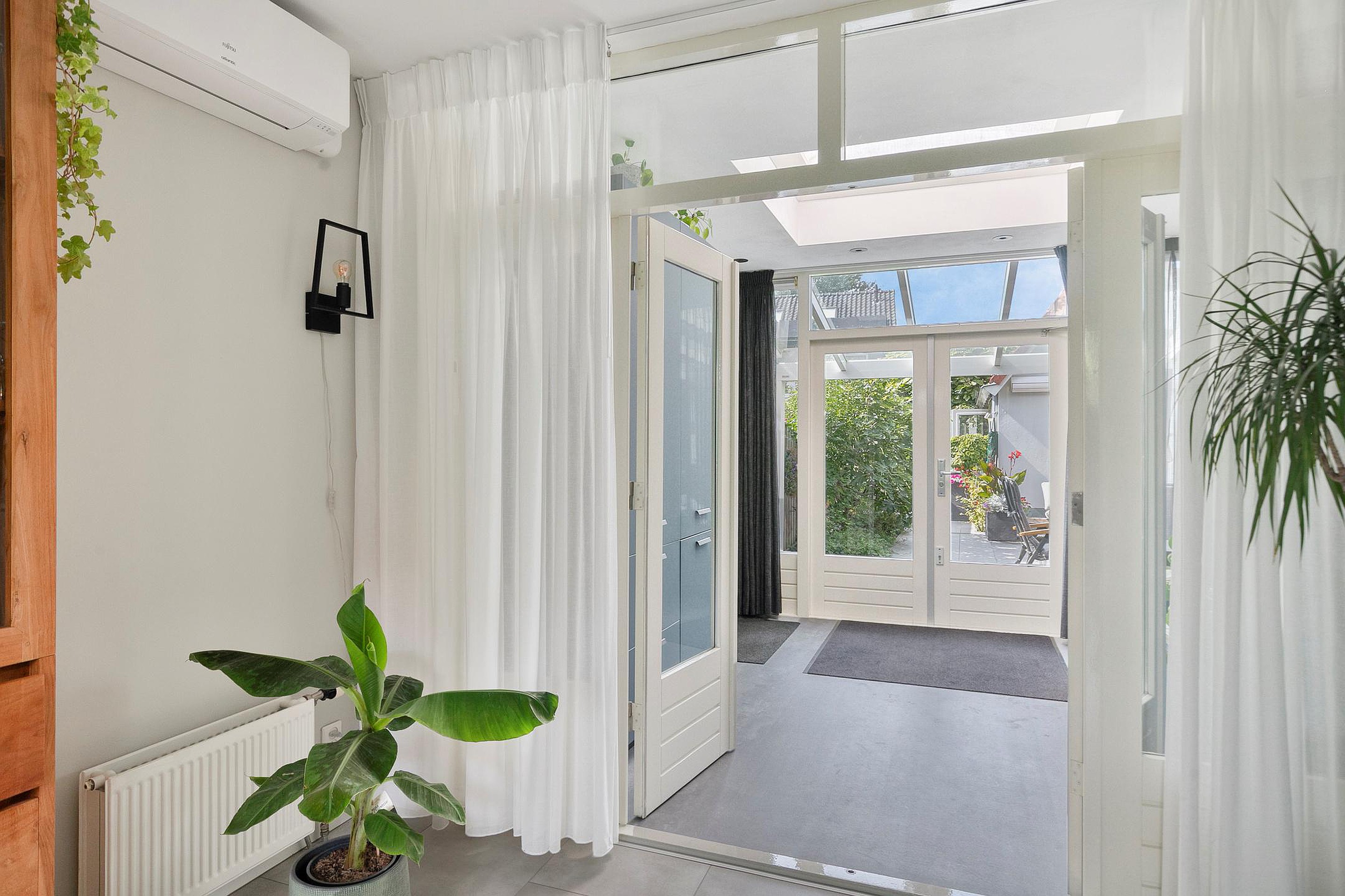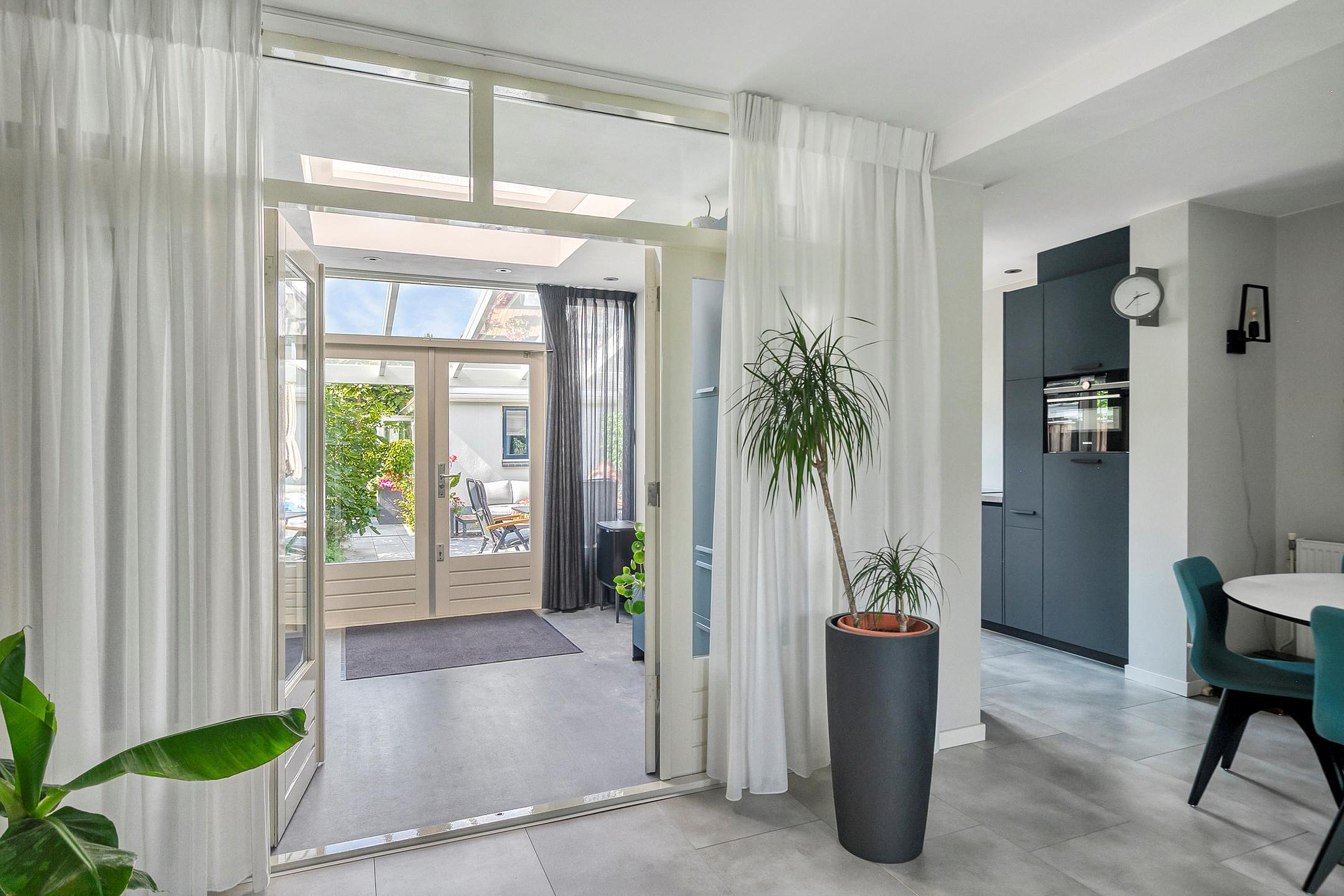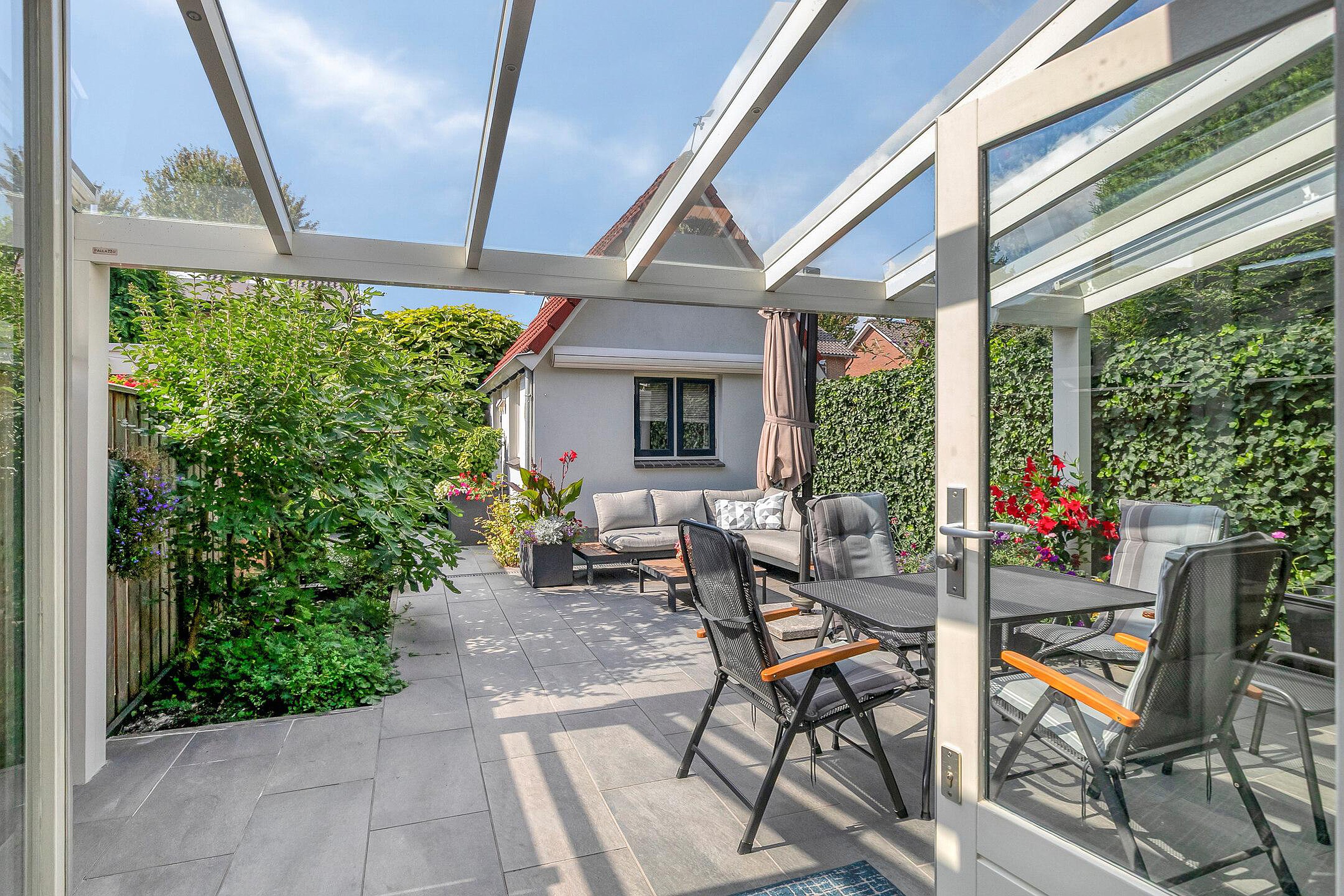 Direct aan de woning is een grote glazen veranda geplaatst, met zonwering, ideaal voor lange zomeravonden of beschut buiten zitten in het voor- en najaar.