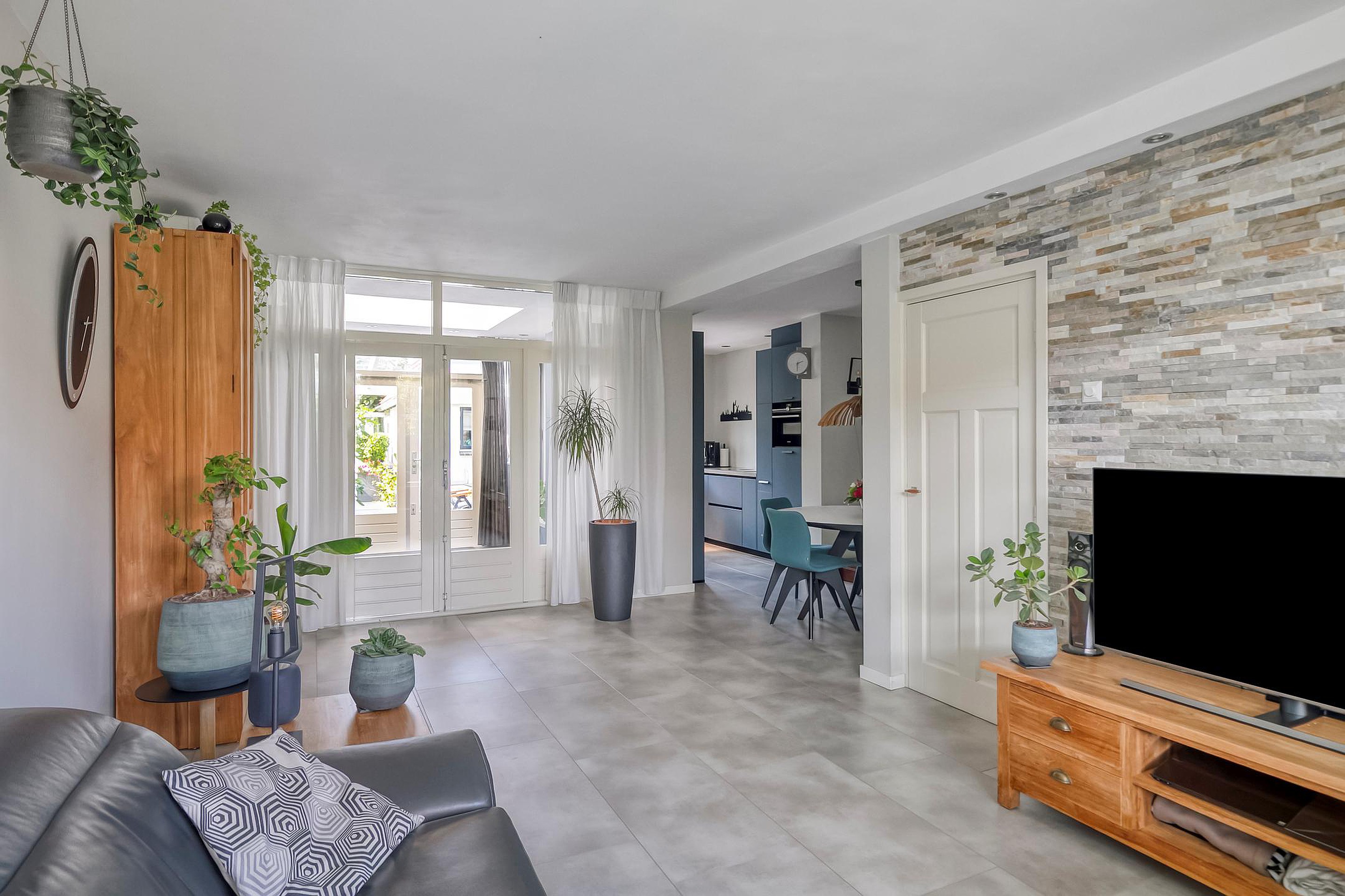 De lichte woonkamer is afgewerkt met een stijlvolle pvc-vloer en biedt dankzij de uitbouw veel leefruimte. Via openslaande deuren stap je zo de tuin in.