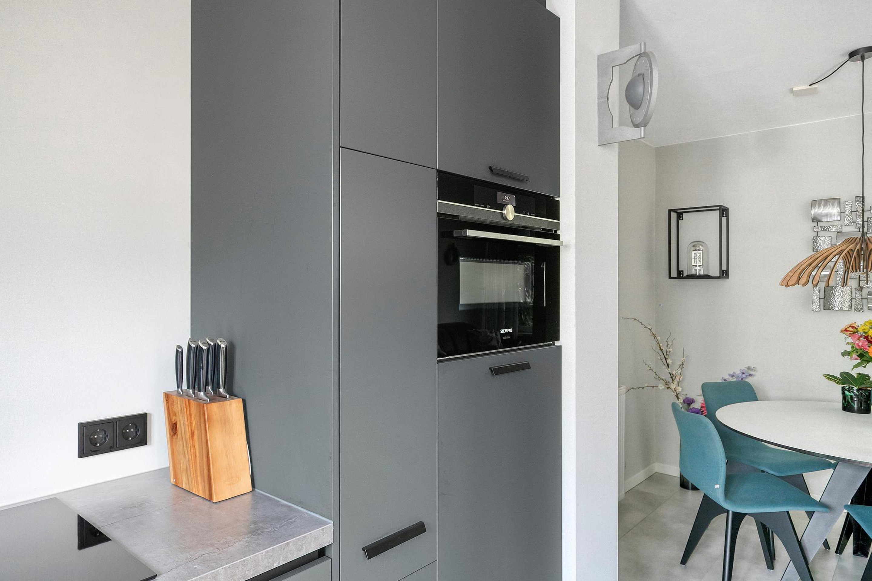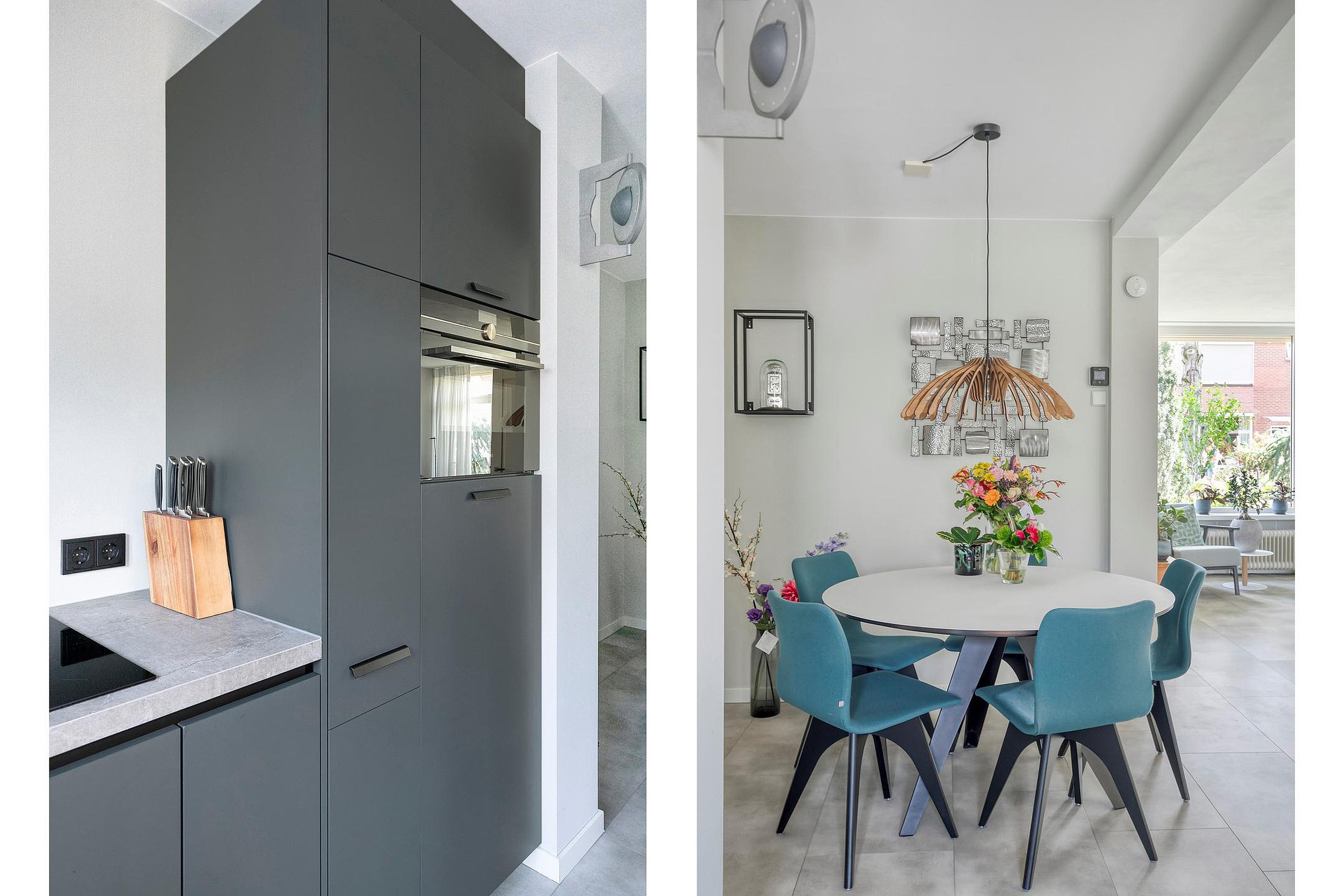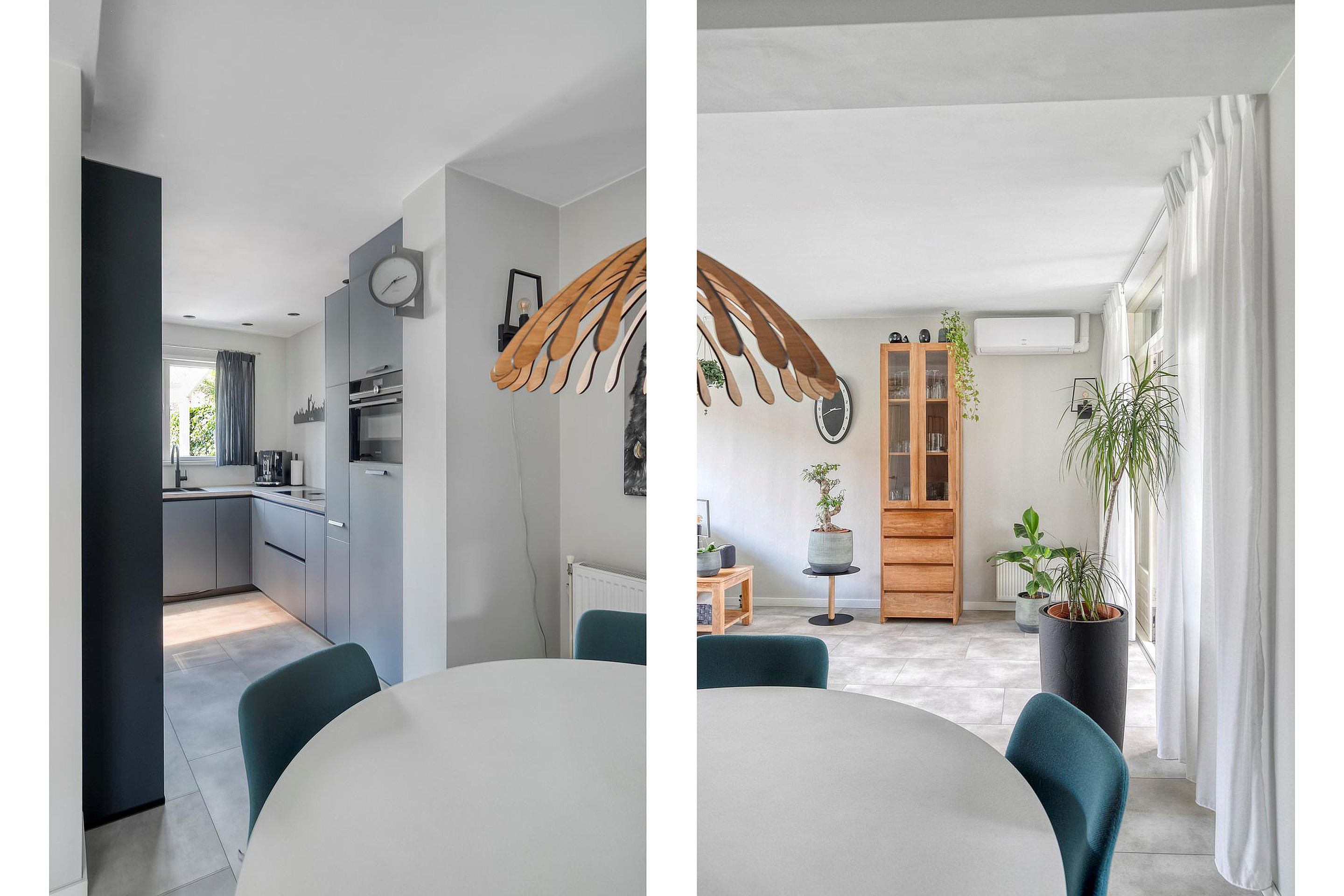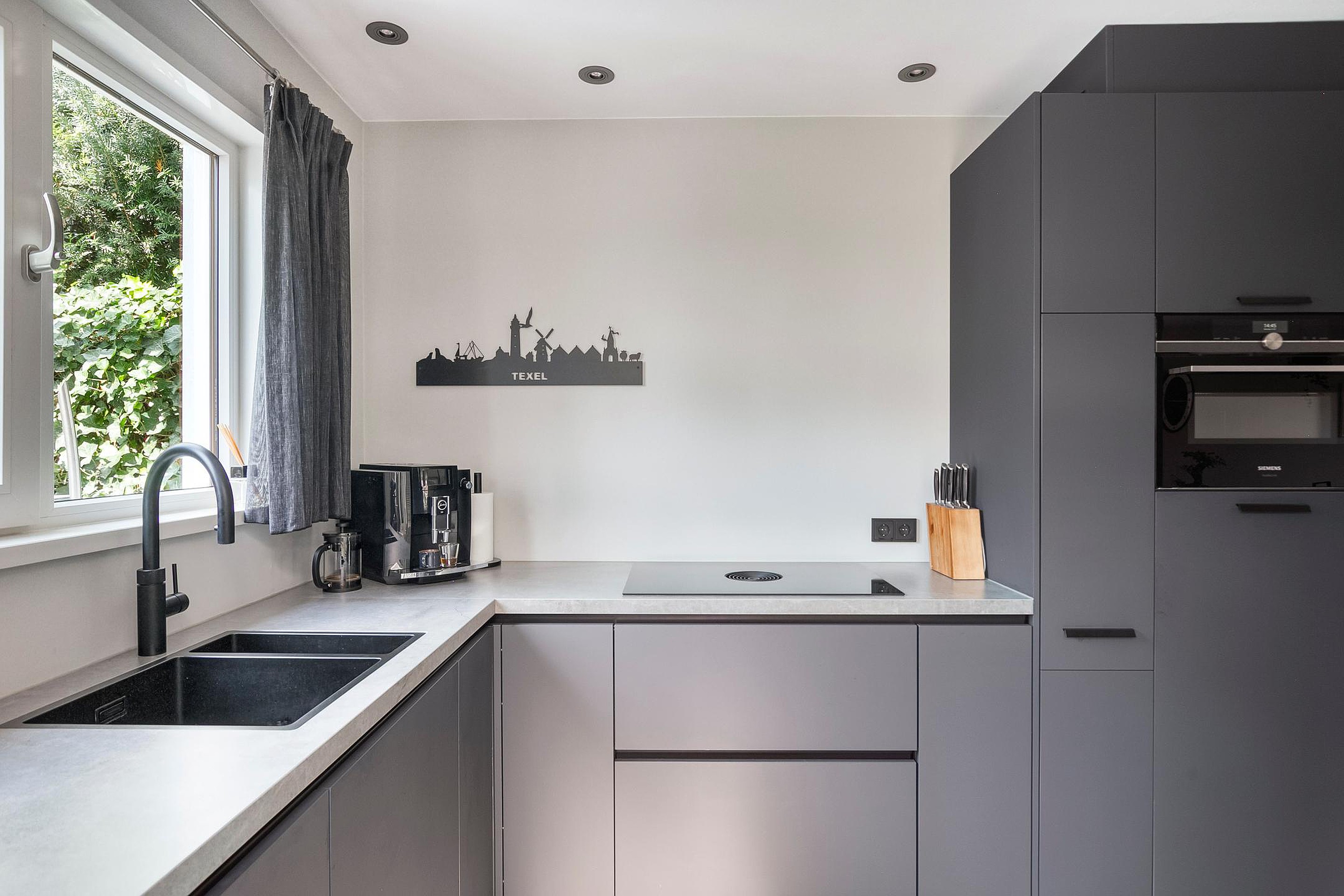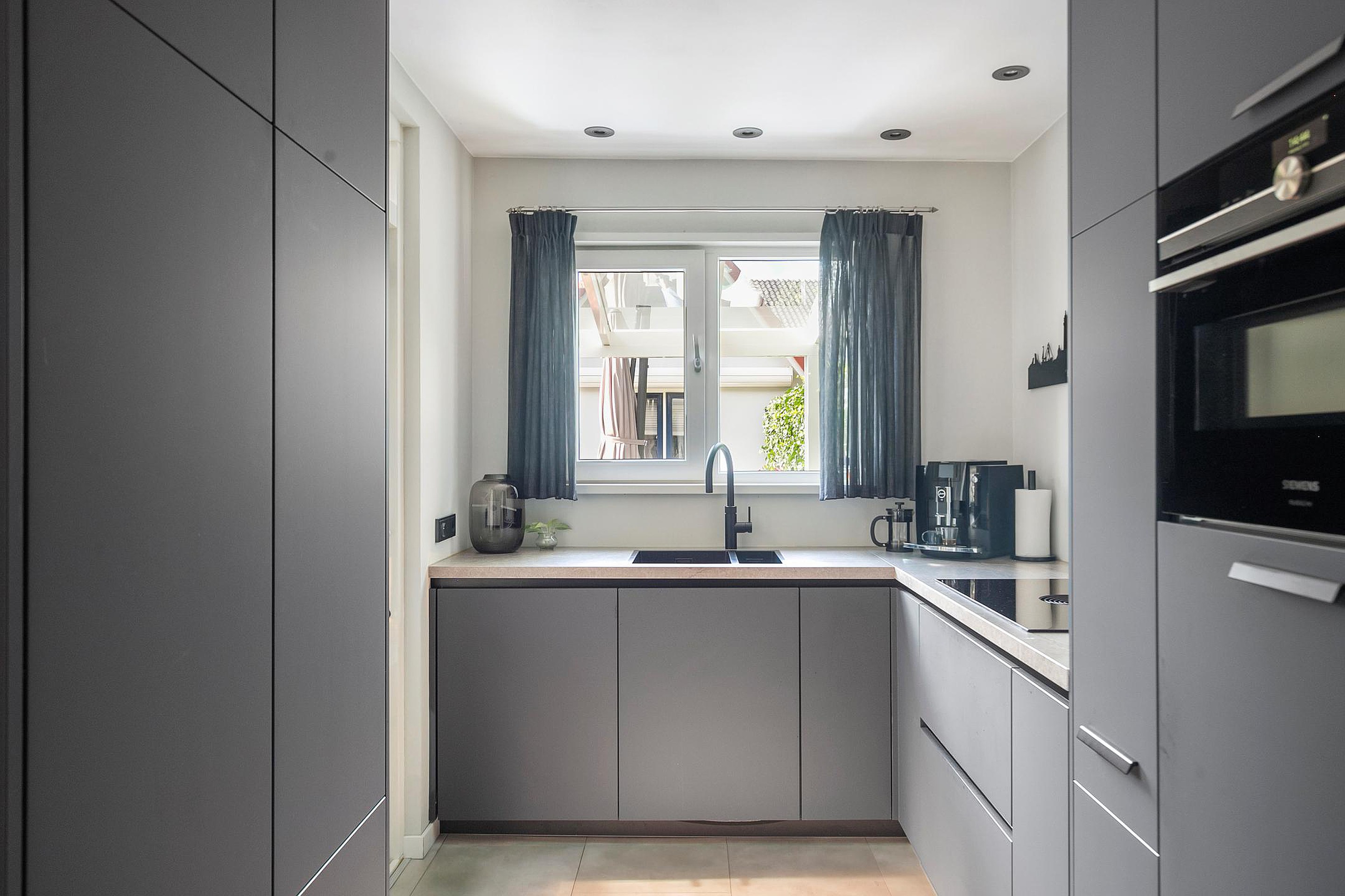 Aan de achterzijde bevindt zich de strak vormgegeven halfopen keuken (2022) in moderne grijs/blauwe kleurstelling. Deze is compleet uitgerust met onder andere een Siemens combi-oven, Bora 4-pits inductiekookplaat met geïntegreerde afzuiging, Quooker (kokendwaterkraan), vaatwasser en koelkast. Er is veel kastruimte in de keuken.