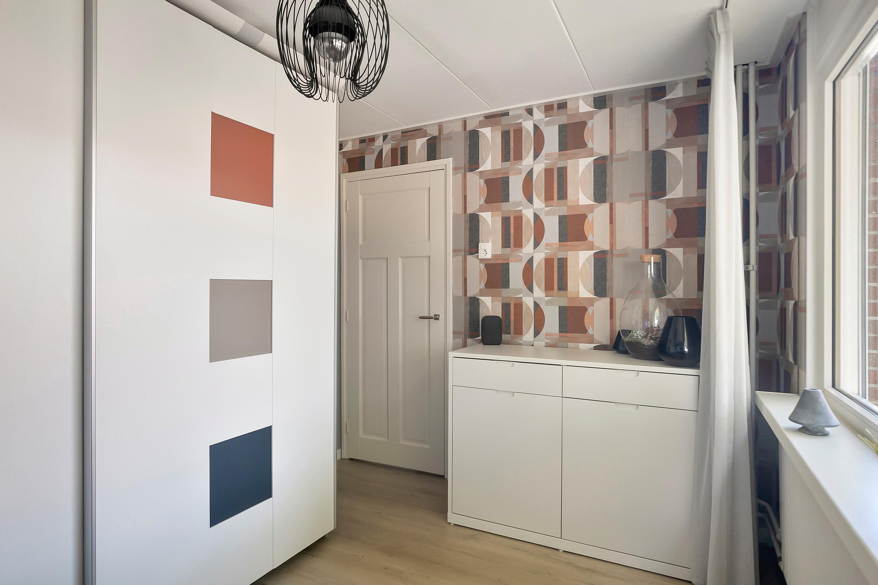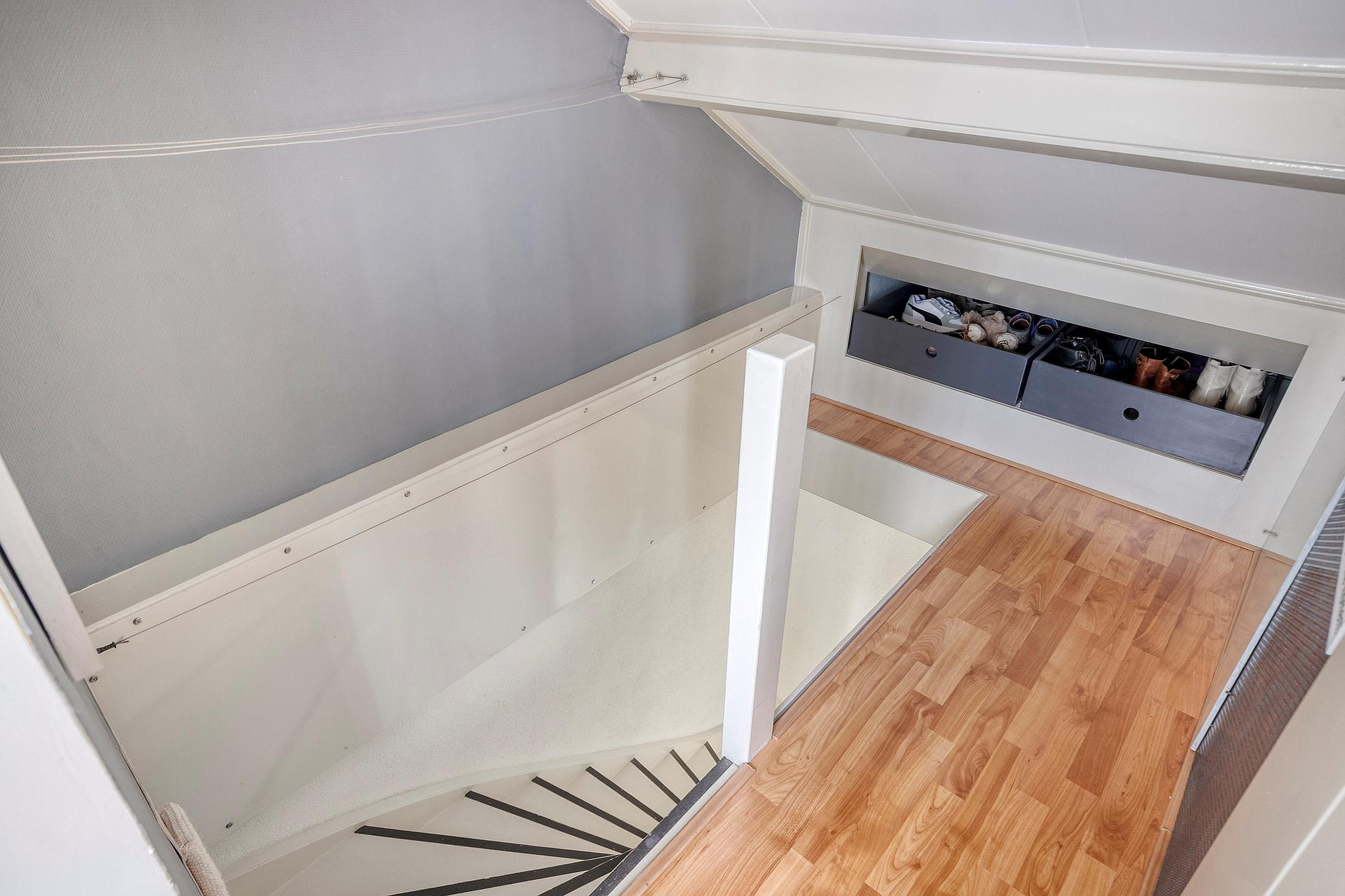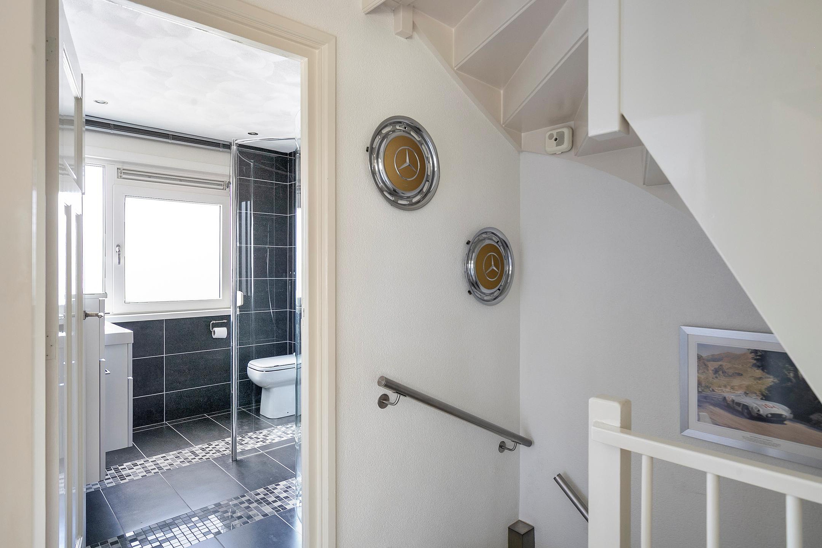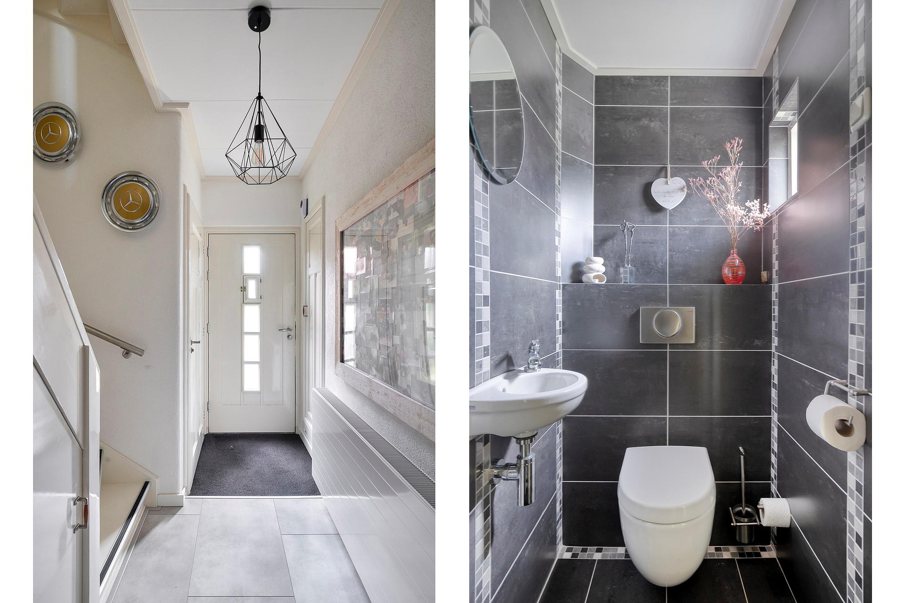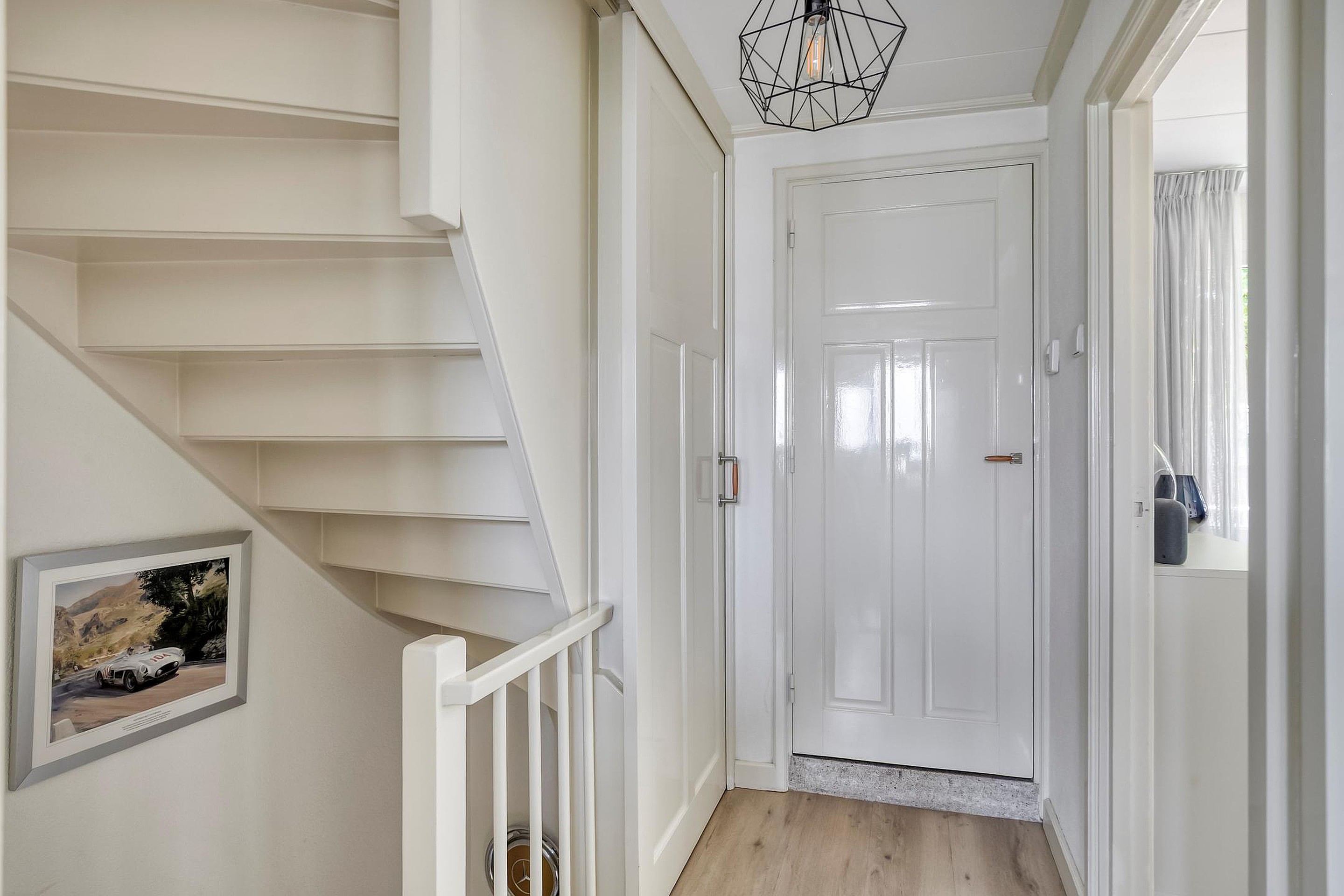Je komt binnen via de netjes aangelegde voortuin. De hal geeft toegang tot de meterkast, het moderne toilet met fonteintje en de trapopgang met praktische trapkast.