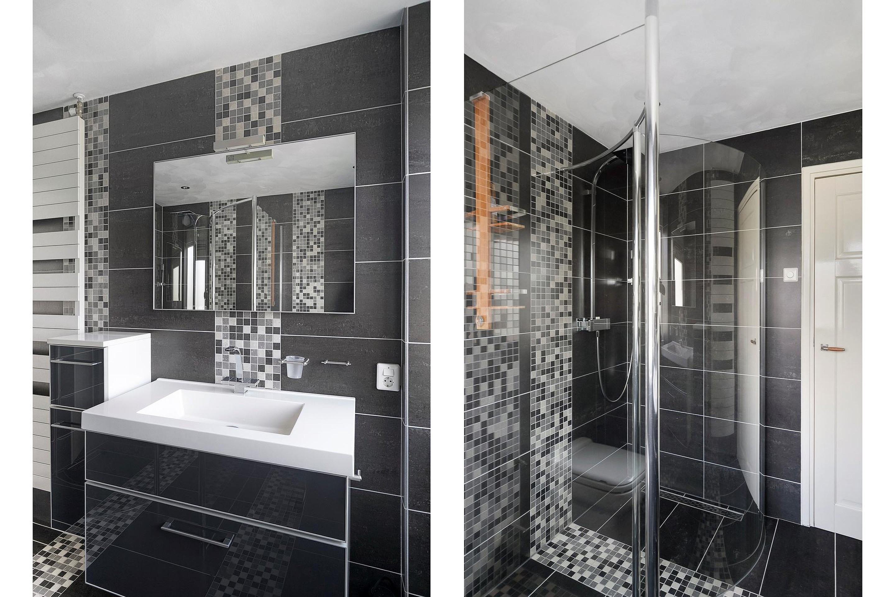 De moderne badkamer is uitgerust met een fraaie S-vormige inloopdouche, tweede toilet en een breed wastafelmeubel met veel opbergruimte.