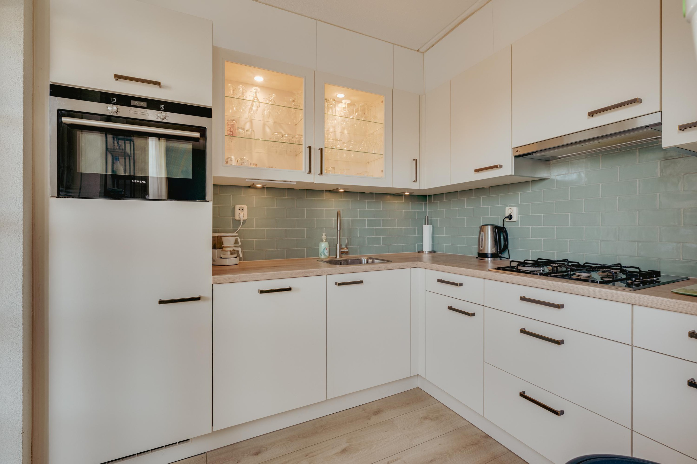 Indeling woning: begane grond, hal met meterkast, toilet en deur naar de woonkamer. De mooie doorzon woonkamer, over de volledige lengte van de woning is ruim en sfeervol. Vanuit de woonkamer is er een deur naar de keuken en naar de trap, naar de eerste verdieping. Onder de trap bevindt zich een ruime opbergkast die vanuit de woonkamer bereikbaar is. De moderne, volledige keuken is zeer praktisch van aard en nog maar twee jaar oud. Achter de keuken bevindt zich de ruime bijkeuken. In de bijkeuken is een aanrechtblad met spoelbak, afzuigkap en een wasmachine aansluiting. Verder is er in deze bijkeuken ruimte genoeg voor andere apparatuur.