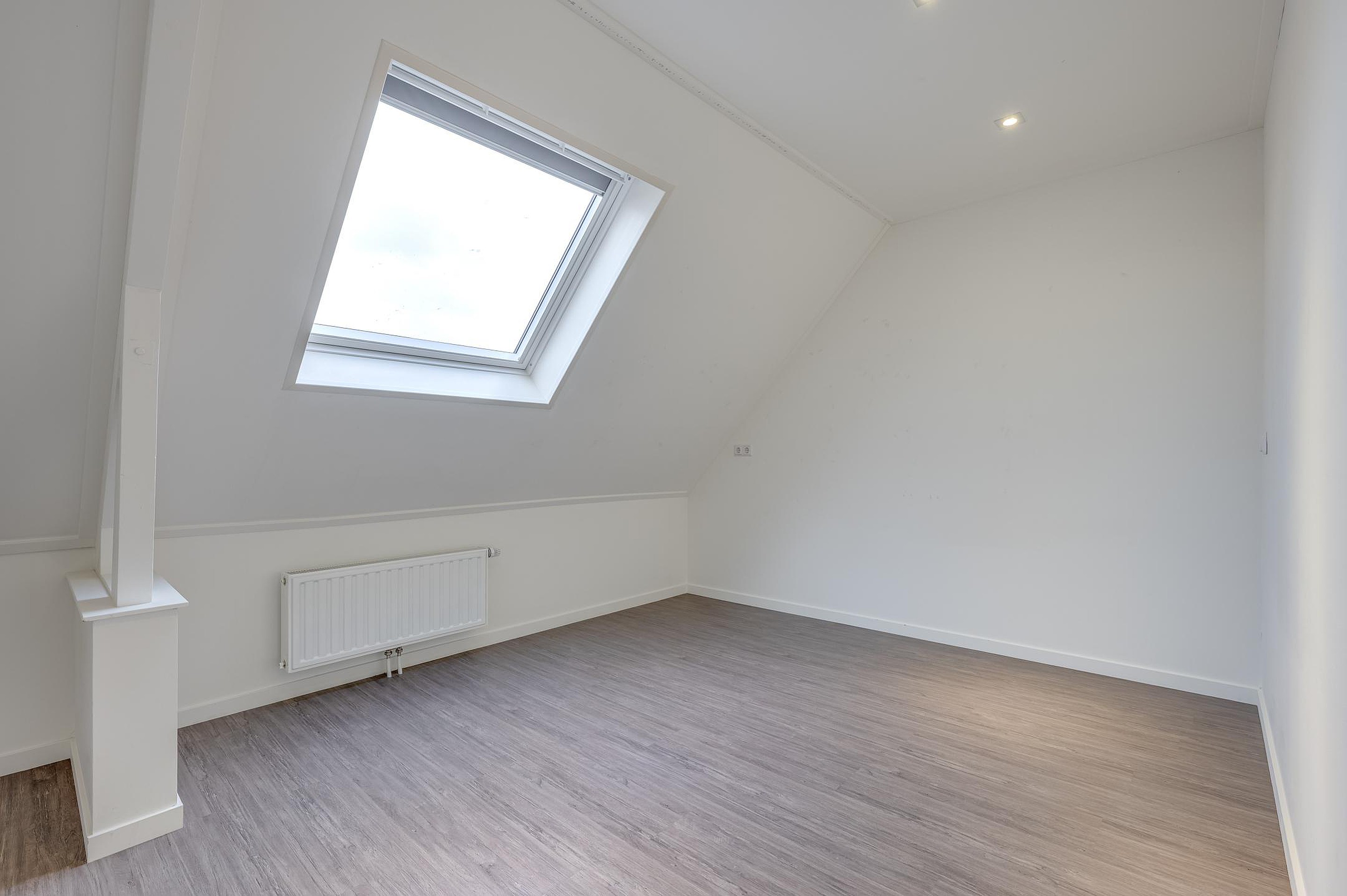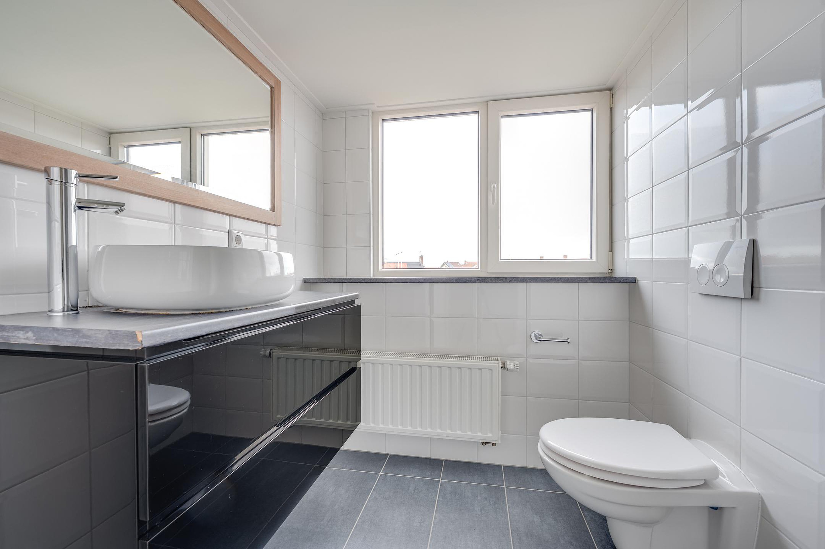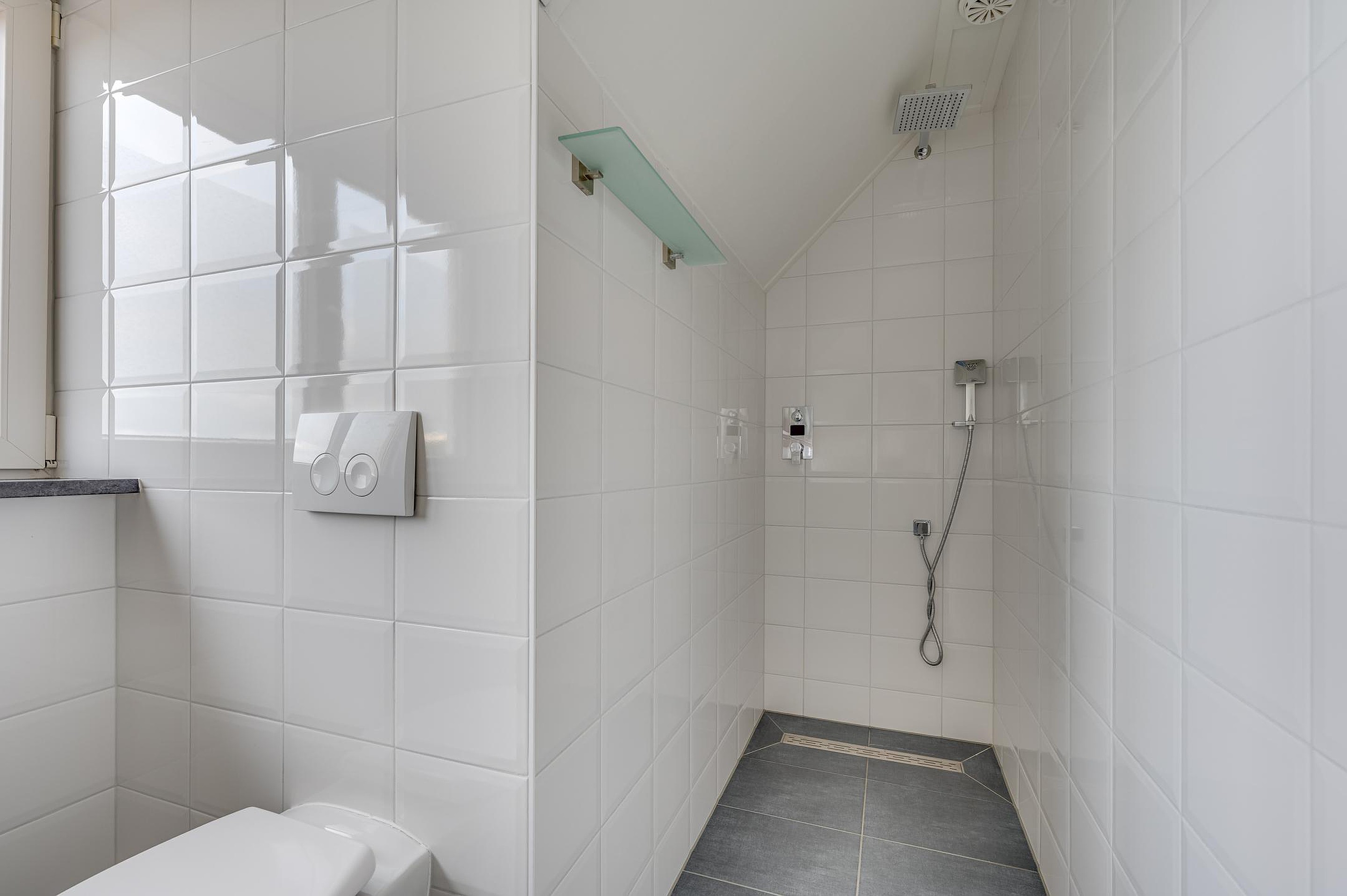 Eerste etage, overloop met toegang tot twee slaapkamers en de badkamer met toilet, badmeubel en inloopdouche. Vanuit de slaapkamer aan de voorzijde deur naar ruime inloopkast. Deze is ook via deur toegankelijk vanaf de overloop. Kan dus ook gebruikt worden als kleine derde slaapkamer.
