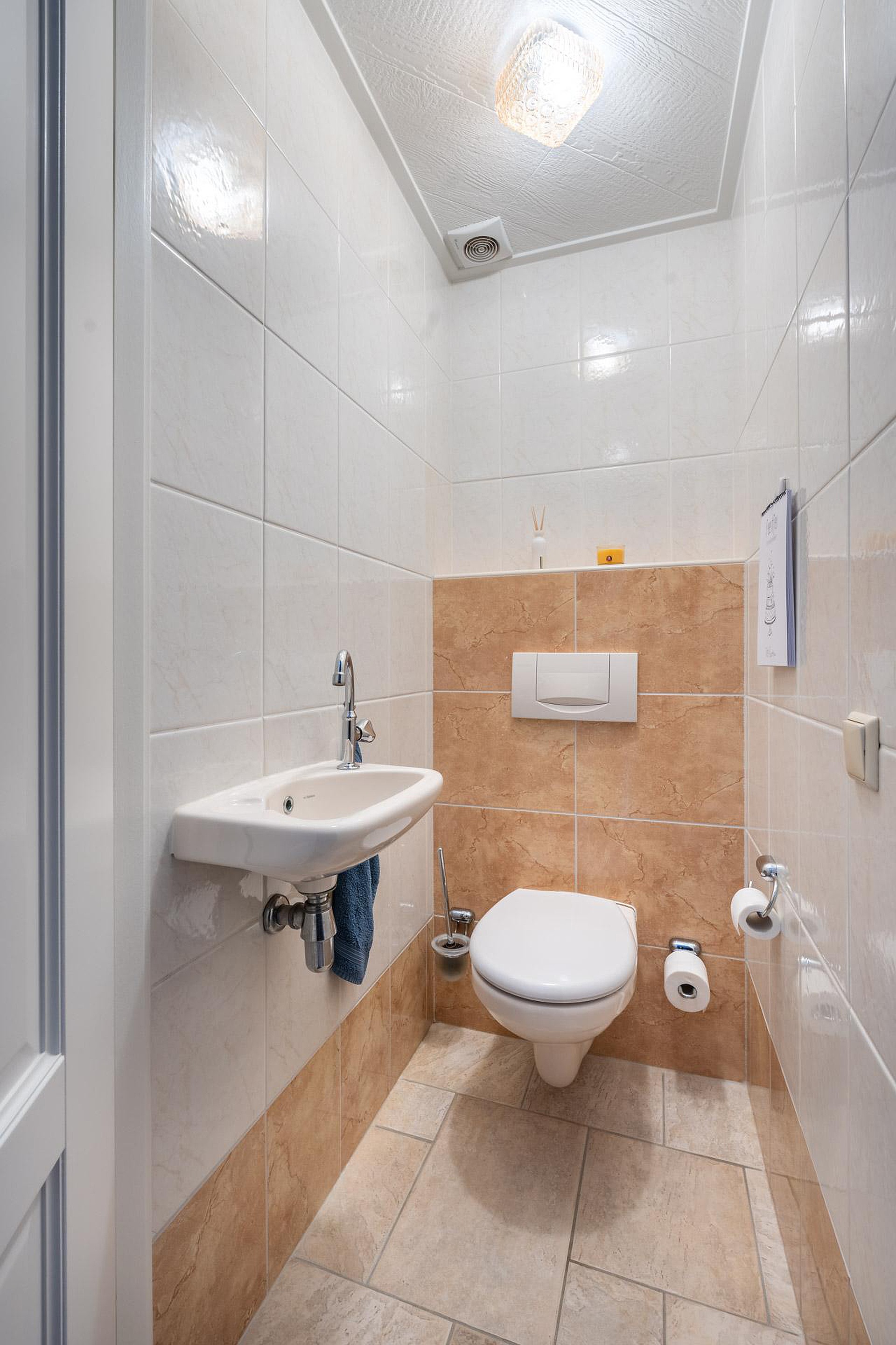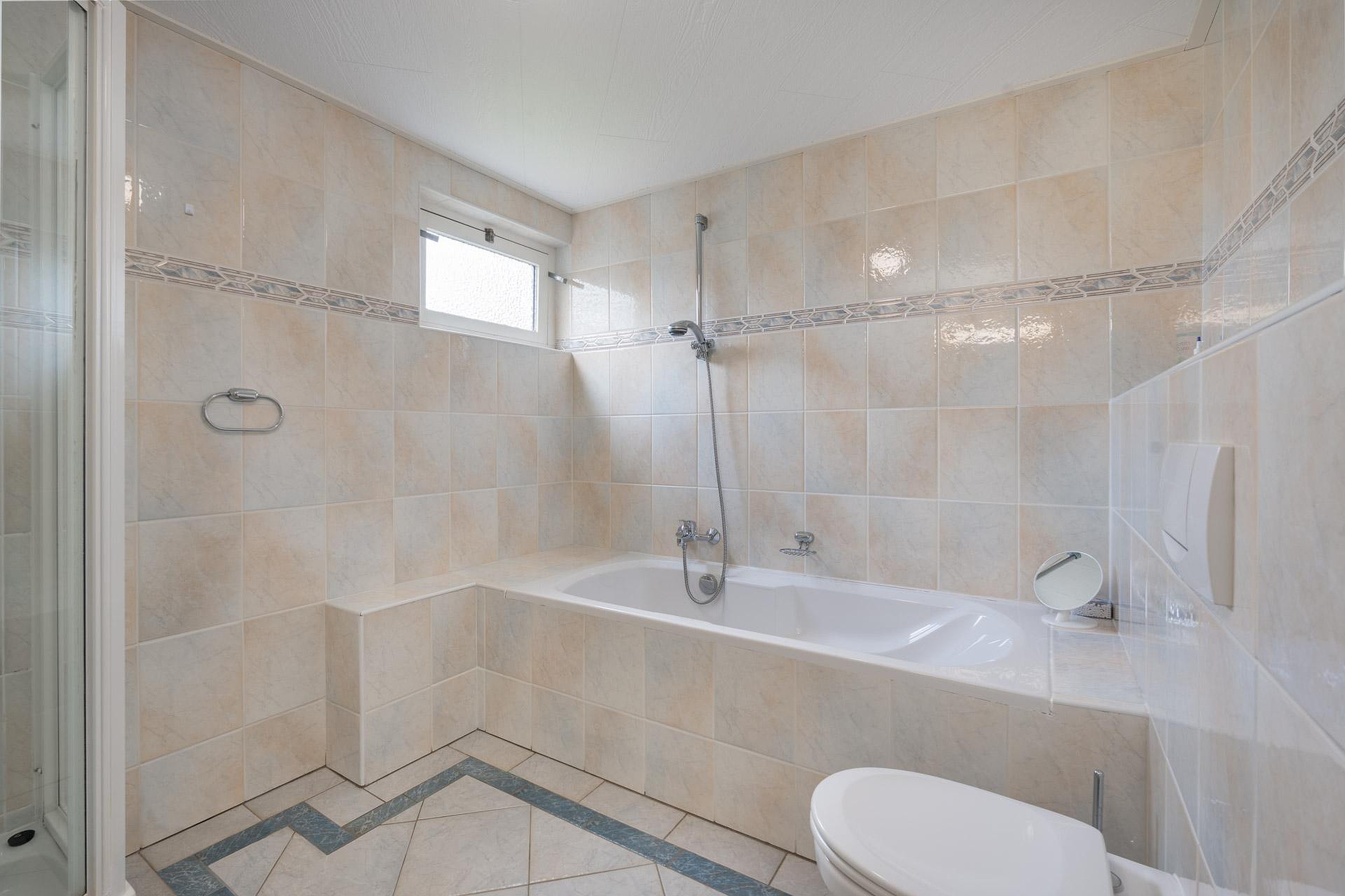 De overloop biedt toegang tot drie slaapkamers, waaronder de royale hoofdslaapkamer met toegang tot een balkon en uitzicht op de tuin. Daarnaast bevindt zich op deze verdieping een keurig onderhouden badkamer.