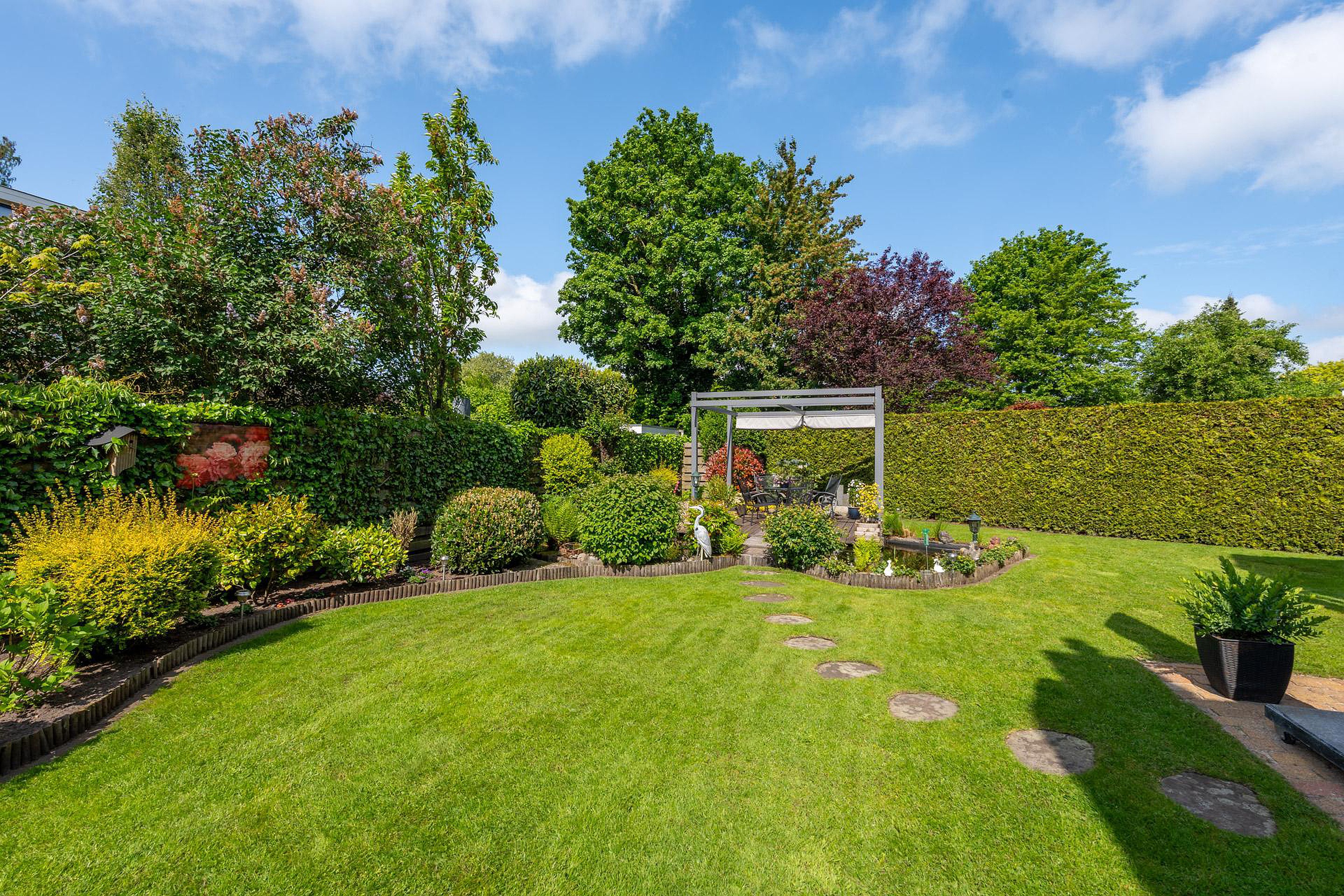 De fraai aangelegde tuin rondom de woning biedt volop ruimte en privacy. Meerdere zitgelegenheden zorgen voor heerlijke plekken om van de zon of schaduw te genieten. Onder de pergola, voorzien van een uitschuifbaar schaduwdoek, creëert u eenvoudig een beschutte loungehoek. Daarnaast beschikt de tuin over een opberghok en een sfeervolle vijverpartij.