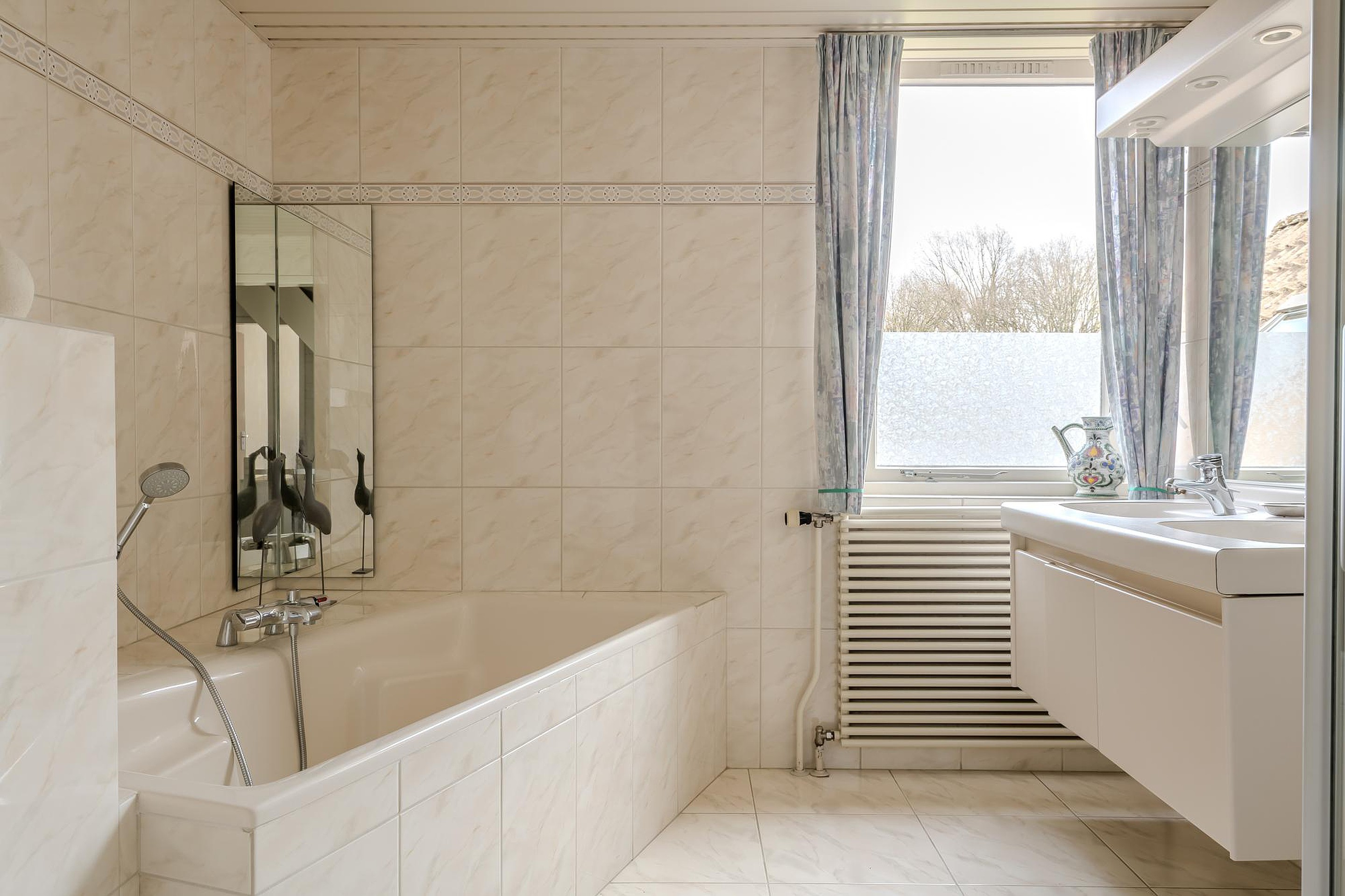 Eerste verdieping: overloop, drie slaapkamers (ouderslaapkamer met airco en balkon), badkamer (1993) met ligbad, douchecabine, toilet en dubbele wastafel.