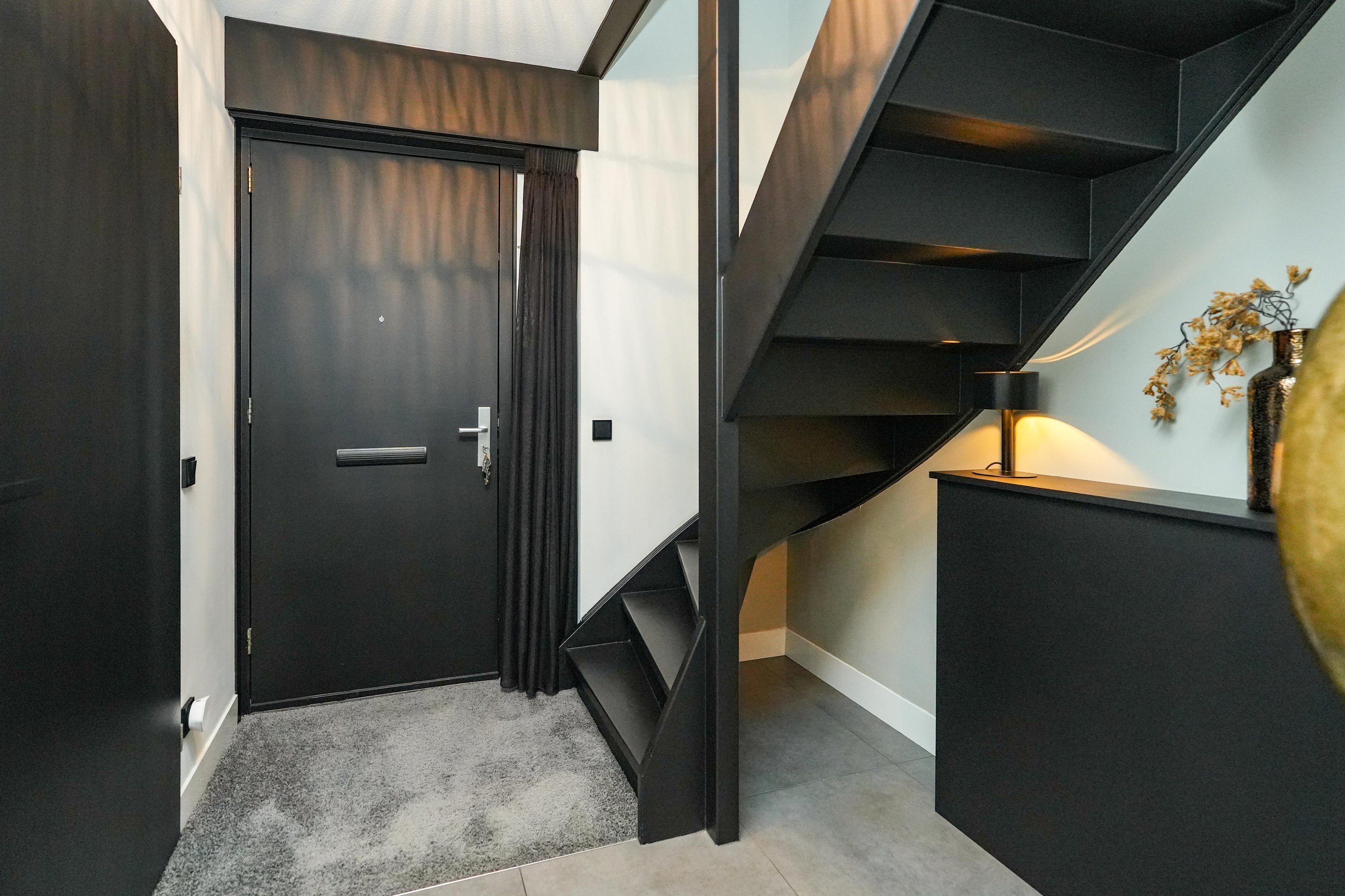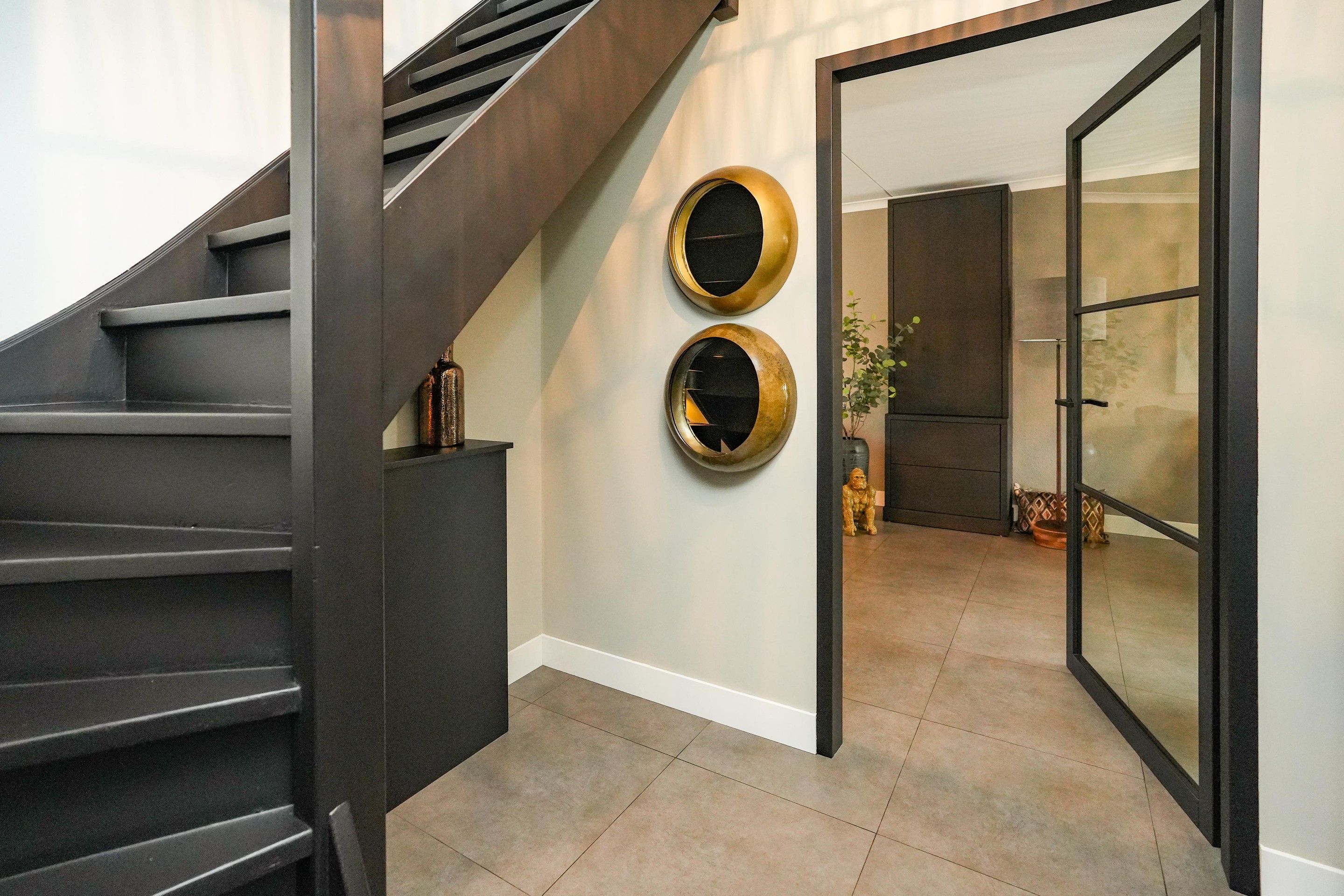 Via de verzorgde entree betreedt u de hal. Aan de linkerzijde bevindt zich de prachtige trapopgang naar de eerste verdieping, aan de rechterzijde de meterkast en een modern toilet met fonteintje. Vanuit de hal geeft een stijlvolle industriële deur toegang tot de woonkamer.