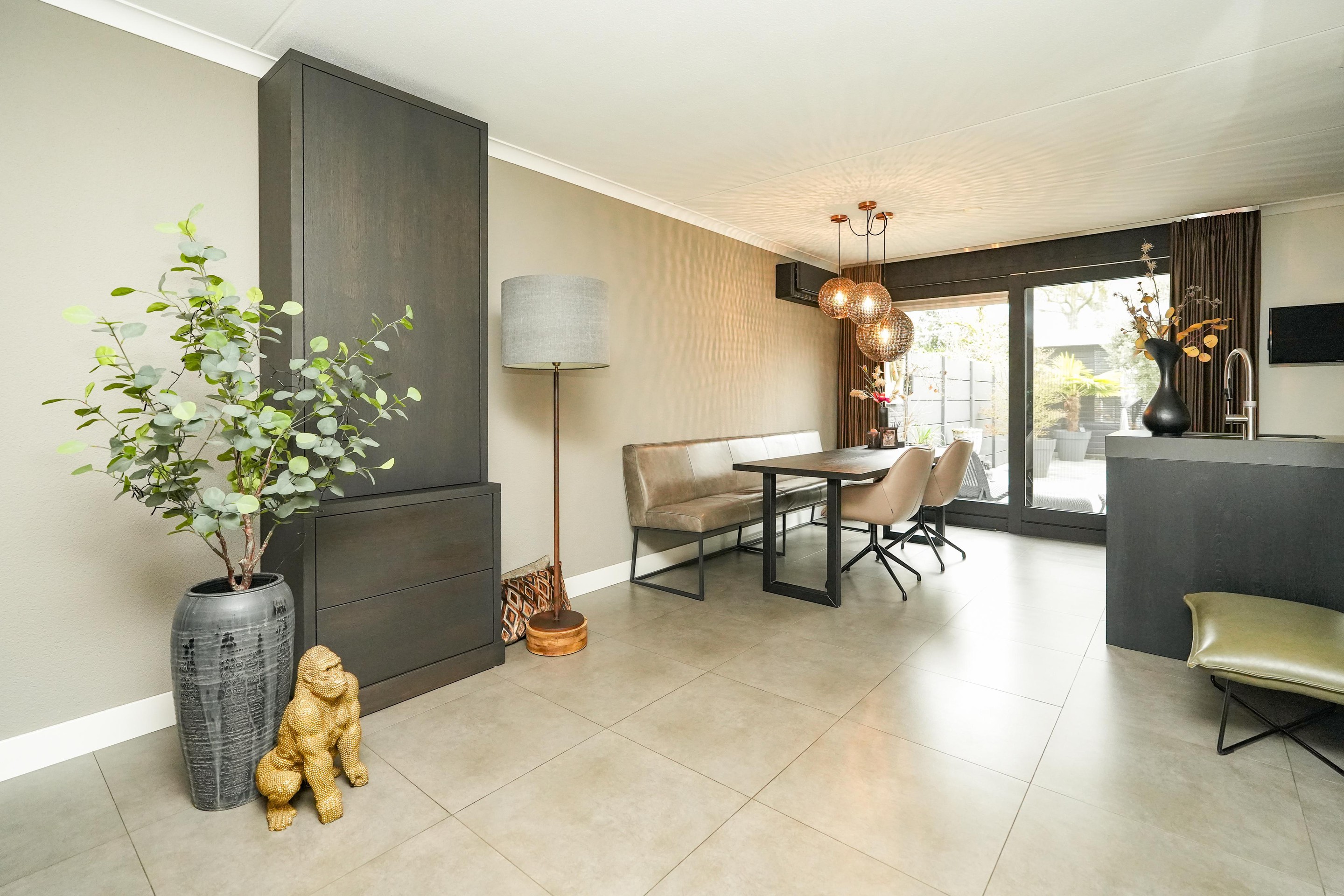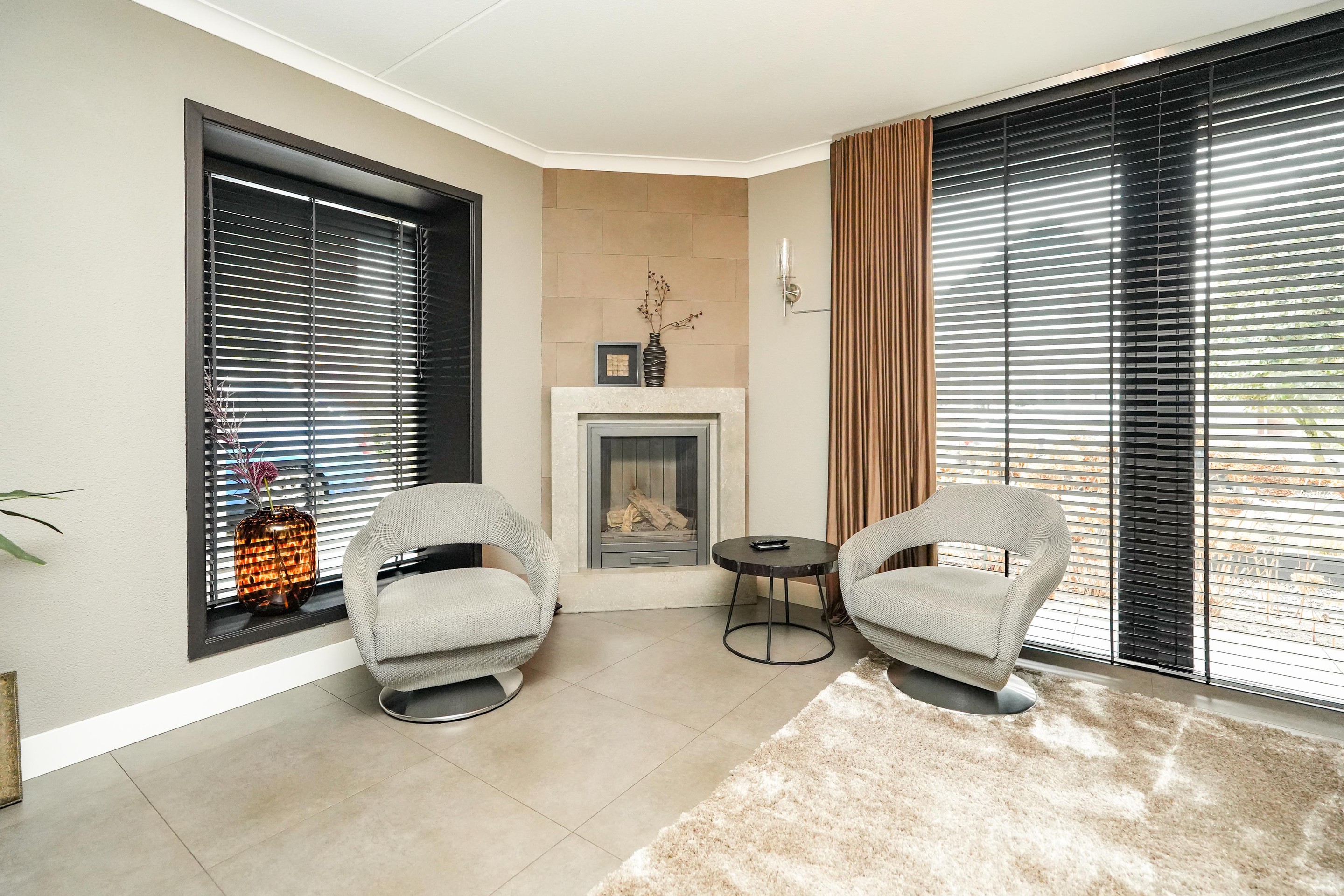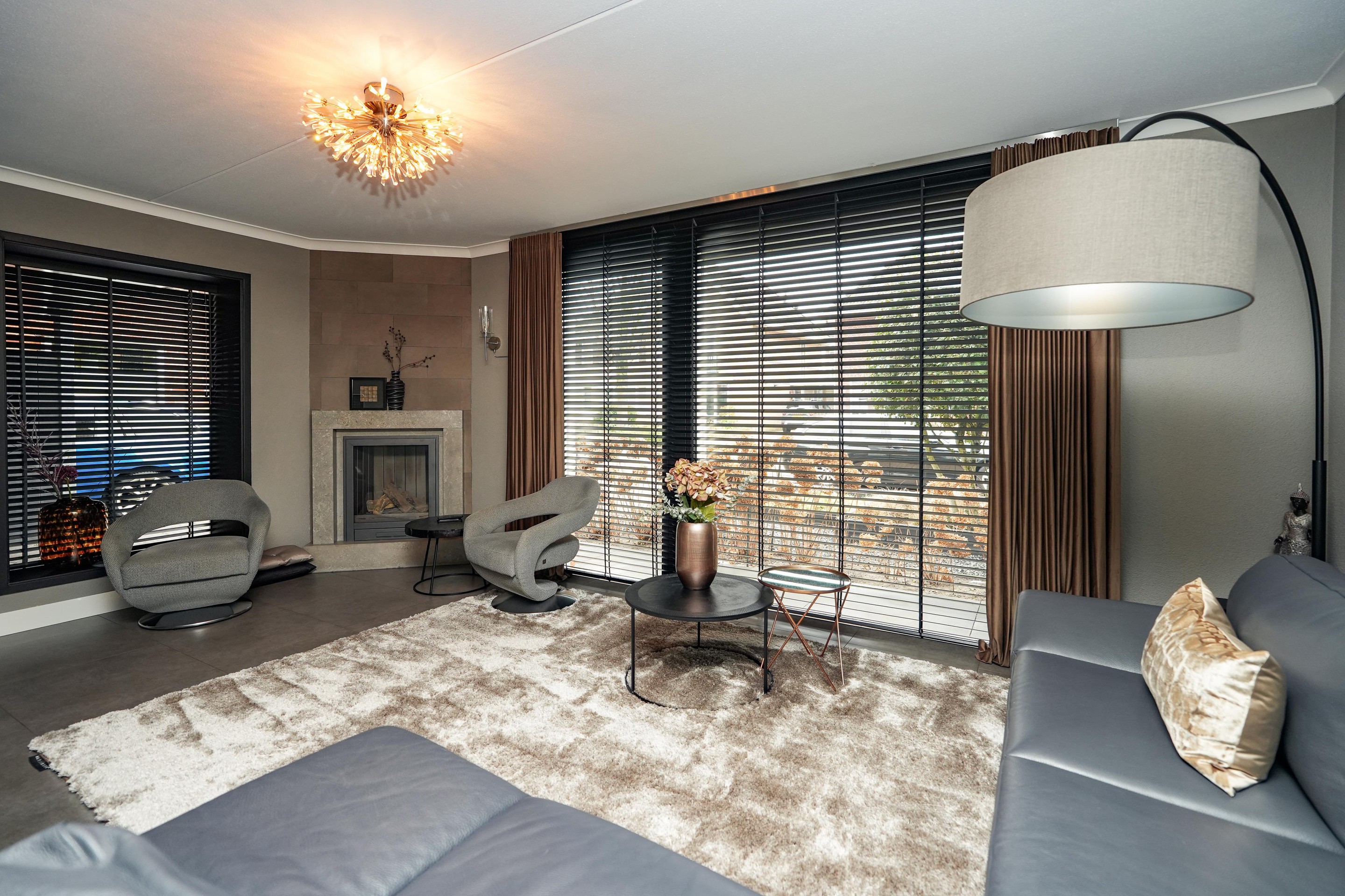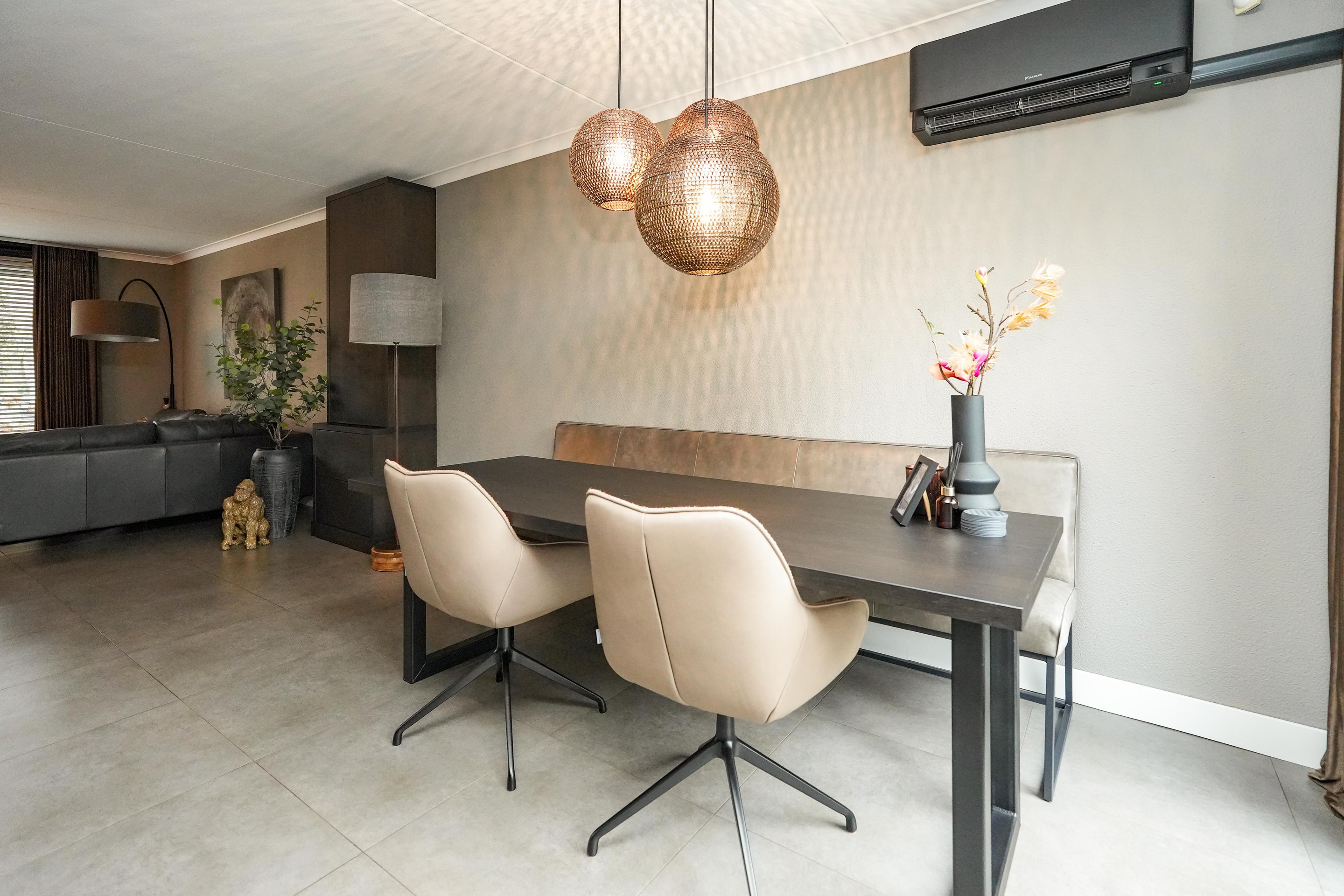 De ruime, bijzonder lichte woonkamer is afgewerkt met een hoogwaardige tegelvloer met vloerverwarming en strak gestucte wanden. Voor extra comfort beschikt de ruimte over airconditioning, een gashaard, rolluiken en screens. Dankzij de ramen tot aan de vloer en de schuifpui naar de achtertuin is er een optimale lichtinval en ontstaat een naadloze verbinding tussen binnen en buiten.
