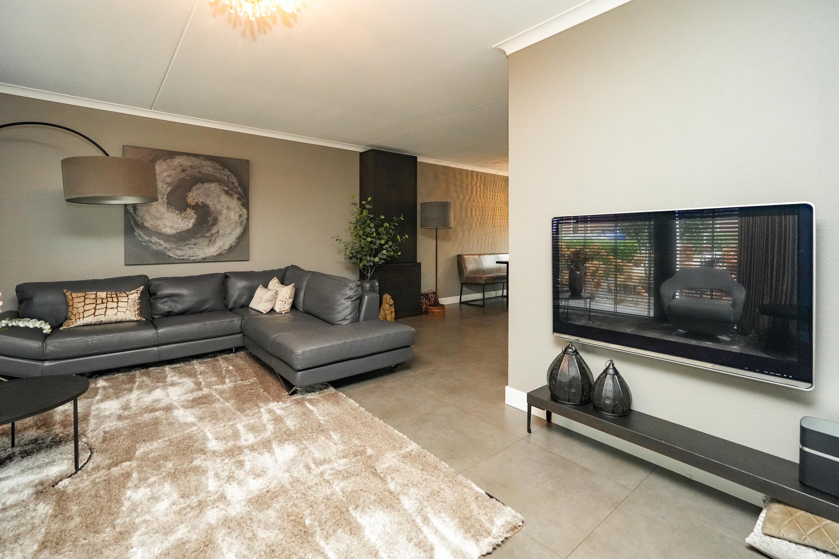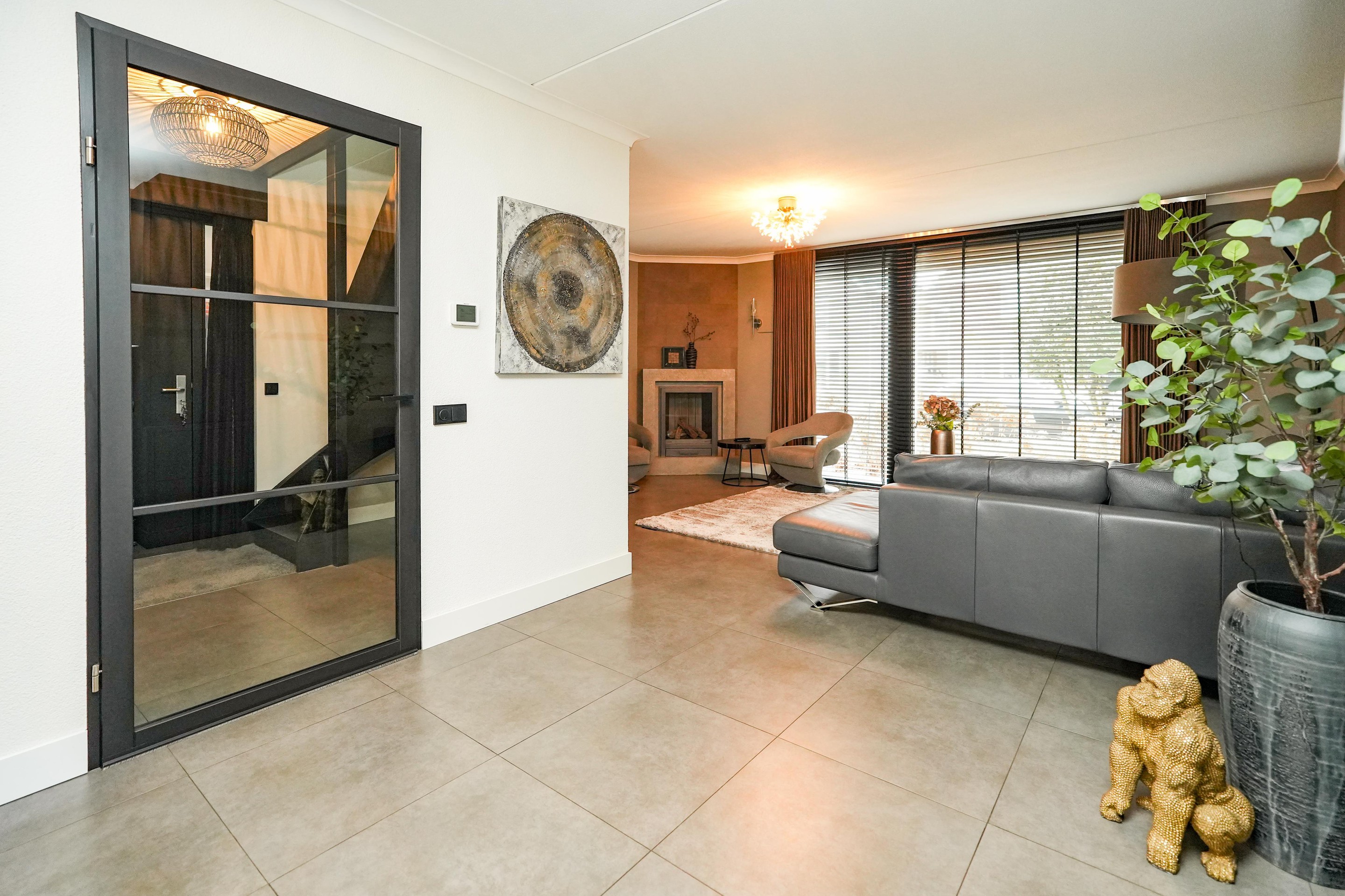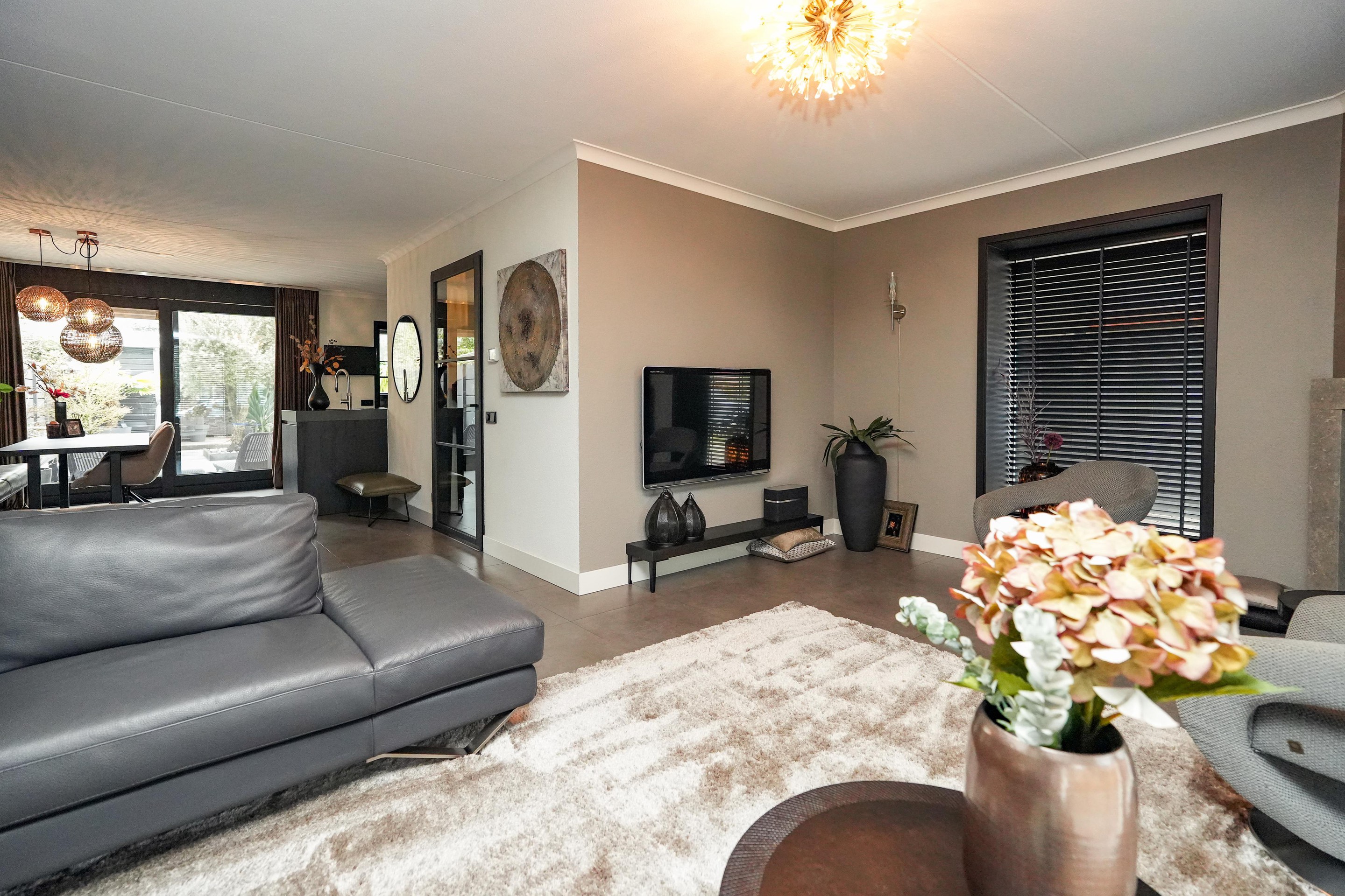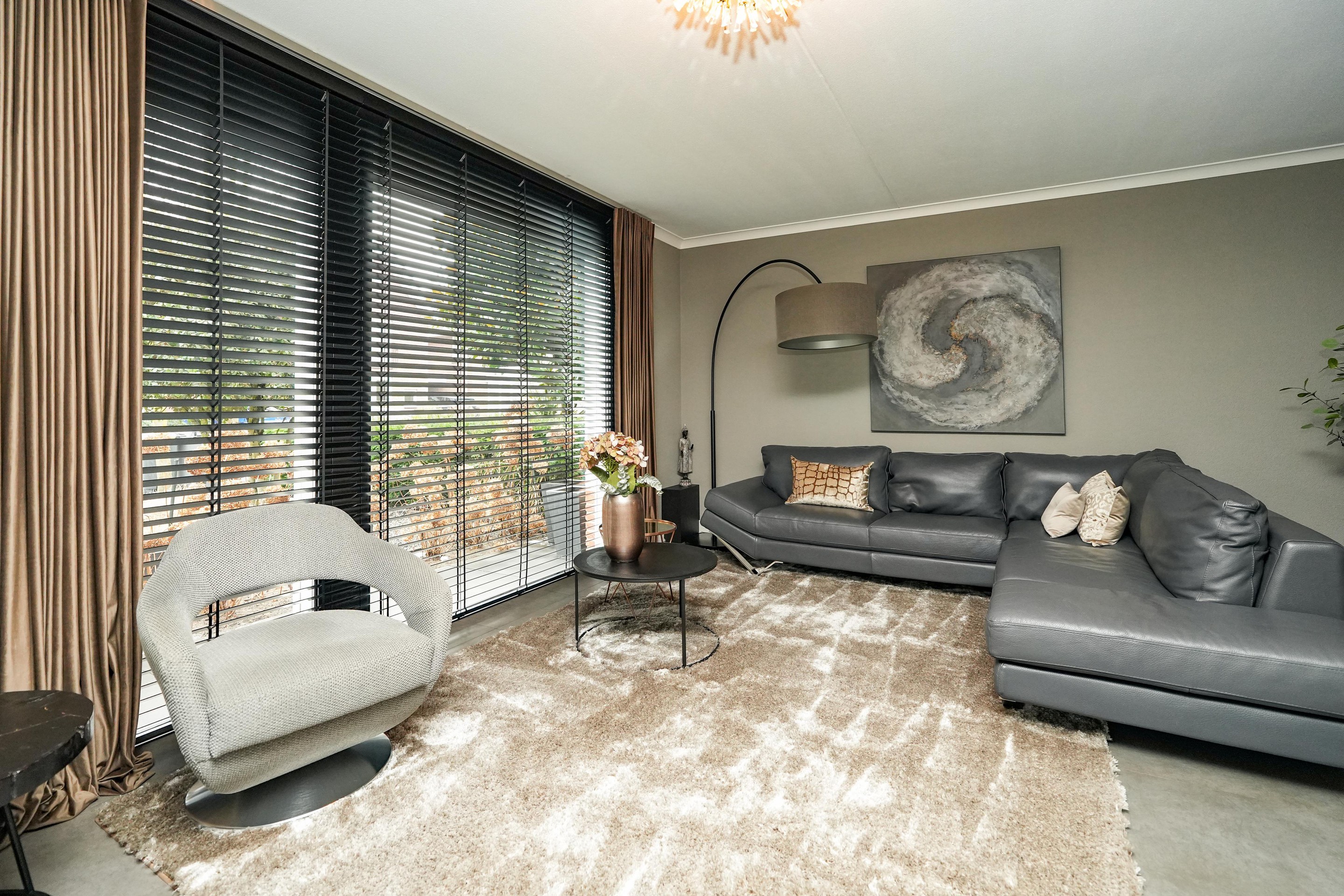 De ruime, bijzonder lichte woonkamer is afgewerkt met een hoogwaardige tegelvloer met vloerverwarming en strak gestucte wanden. Voor extra comfort beschikt de ruimte over airconditioning, een gashaard, rolluiken en screens. Dankzij de ramen tot aan de vloer en de schuifpui naar de achtertuin is er een optimale lichtinval en ontstaat een naadloze verbinding tussen binnen en buiten.