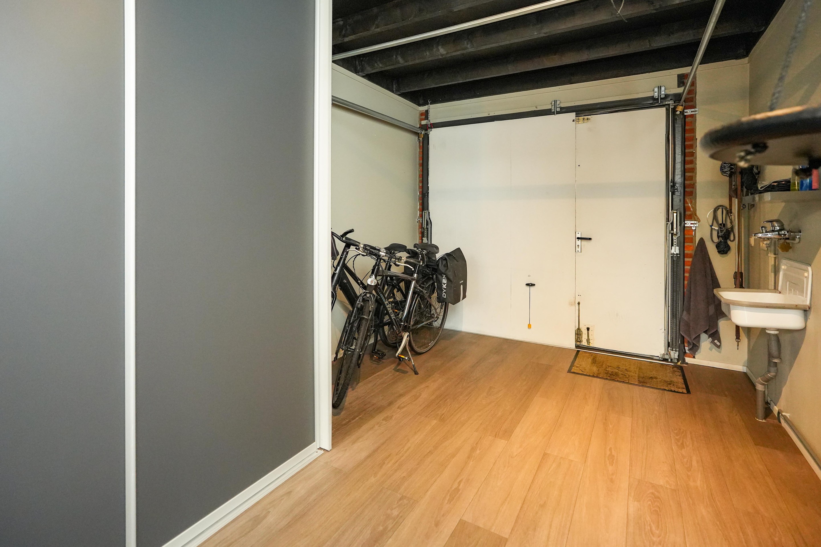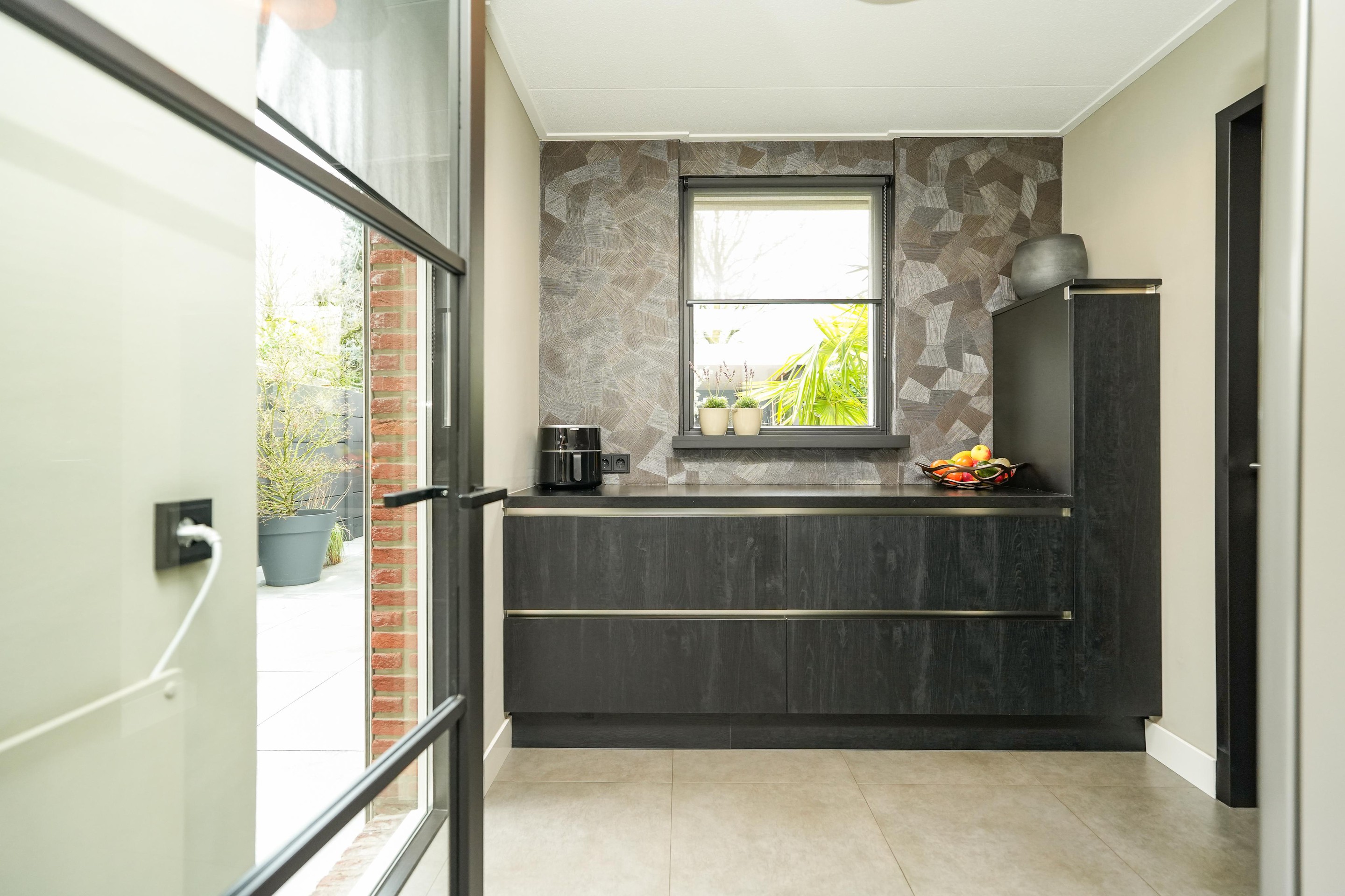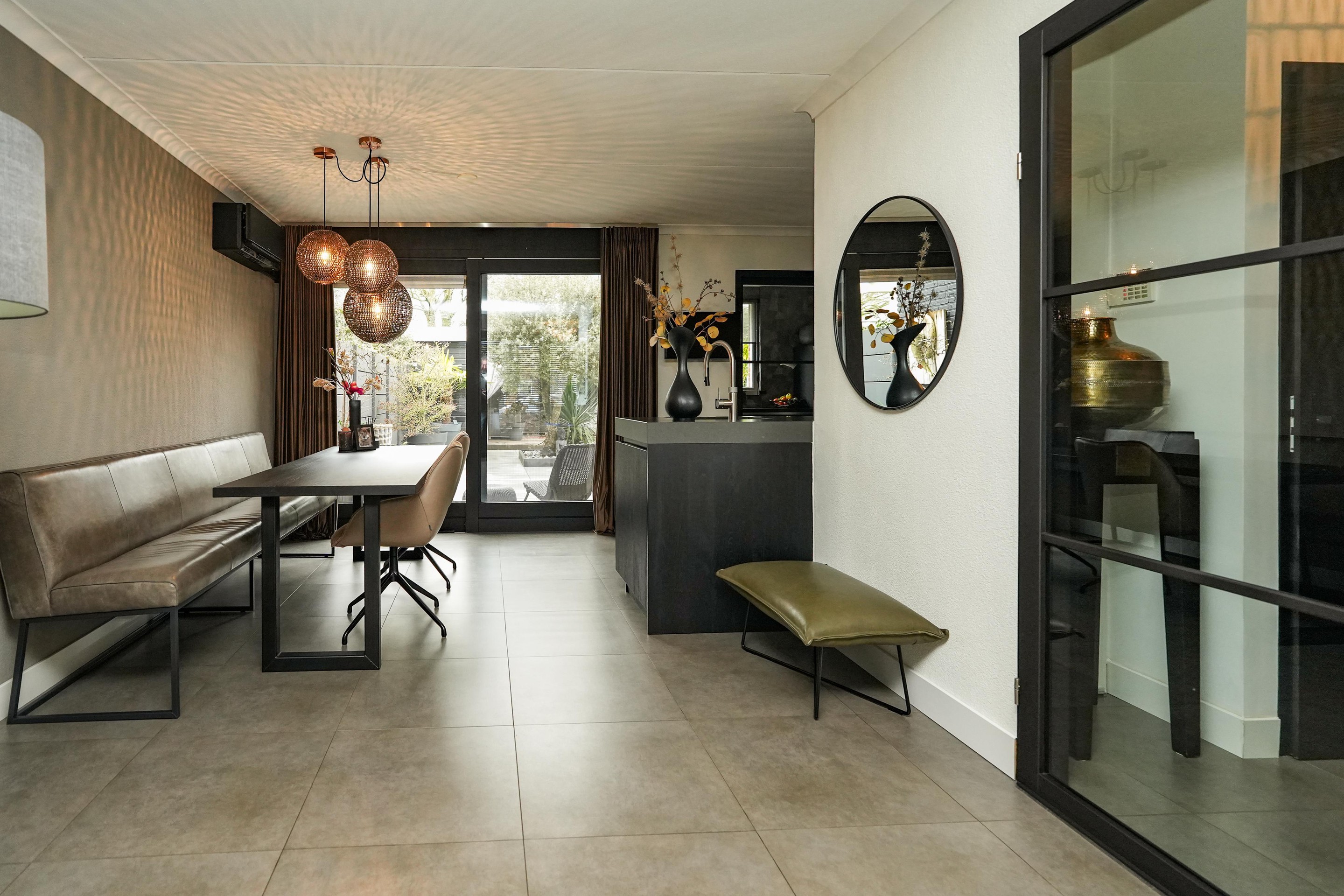 Via een tweede industriële deur bereikt u de strak afgewerkte lichte bijkeuken, voorzien van maatwerkkasten voor extra opbergruimte en heeft een aparte deur naar de inpandige garage, die eveneens toegang biedt tot de achtertuin. Zo komen functionaliteit, stijl en praktisch gemak perfect samen.