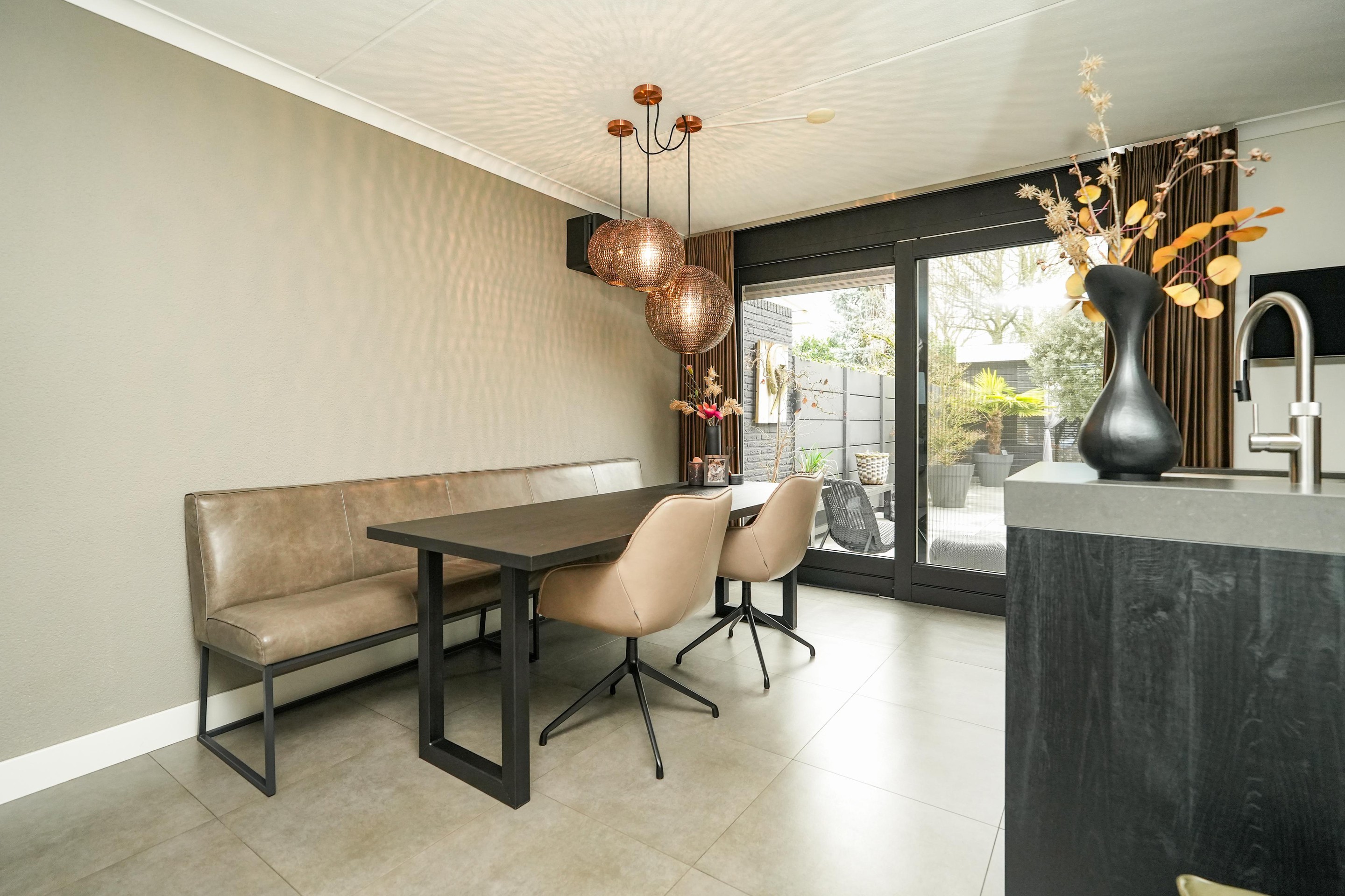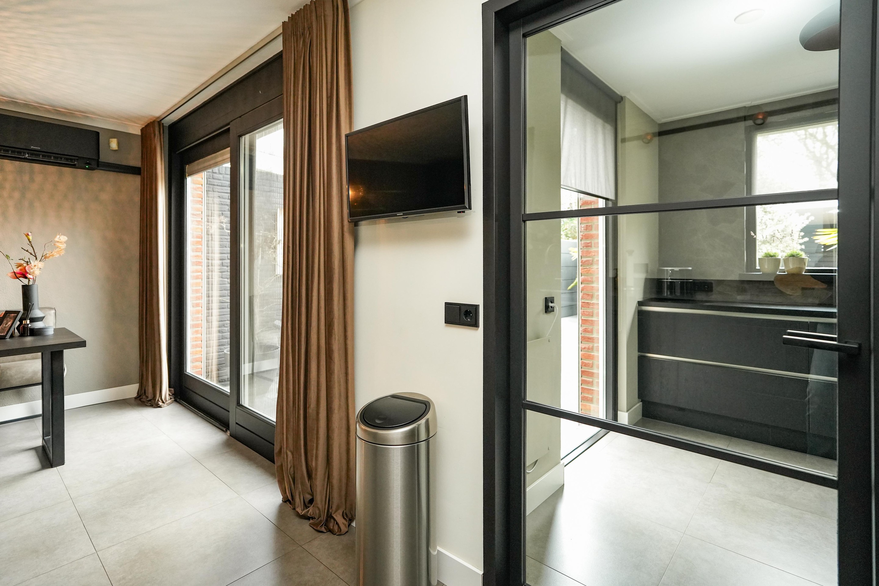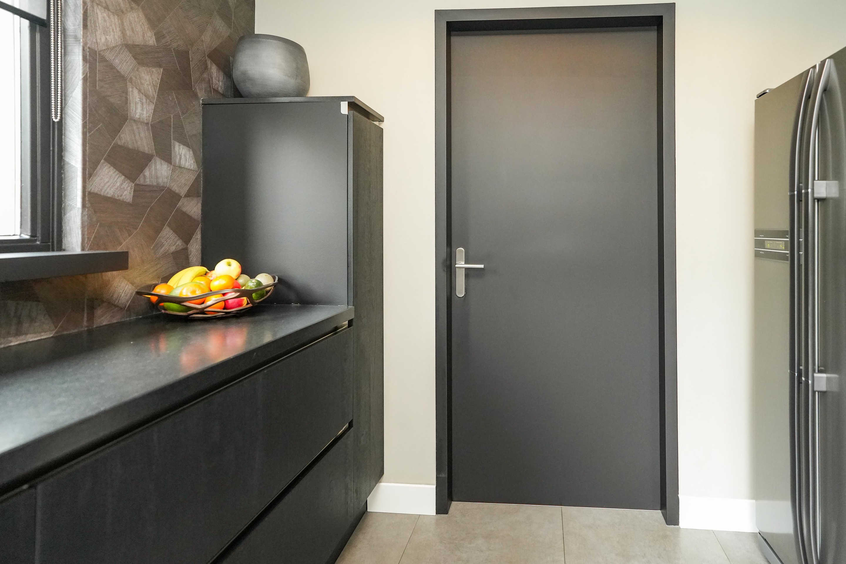 Via een tweede industriële deur bereikt u de strak afgewerkte lichte bijkeuken, voorzien van maatwerkkasten voor extra opbergruimte en heeft een aparte deur naar de inpandige garage, die eveneens toegang biedt tot de achtertuin. Zo komen functionaliteit, stijl en praktisch gemak perfect samen.