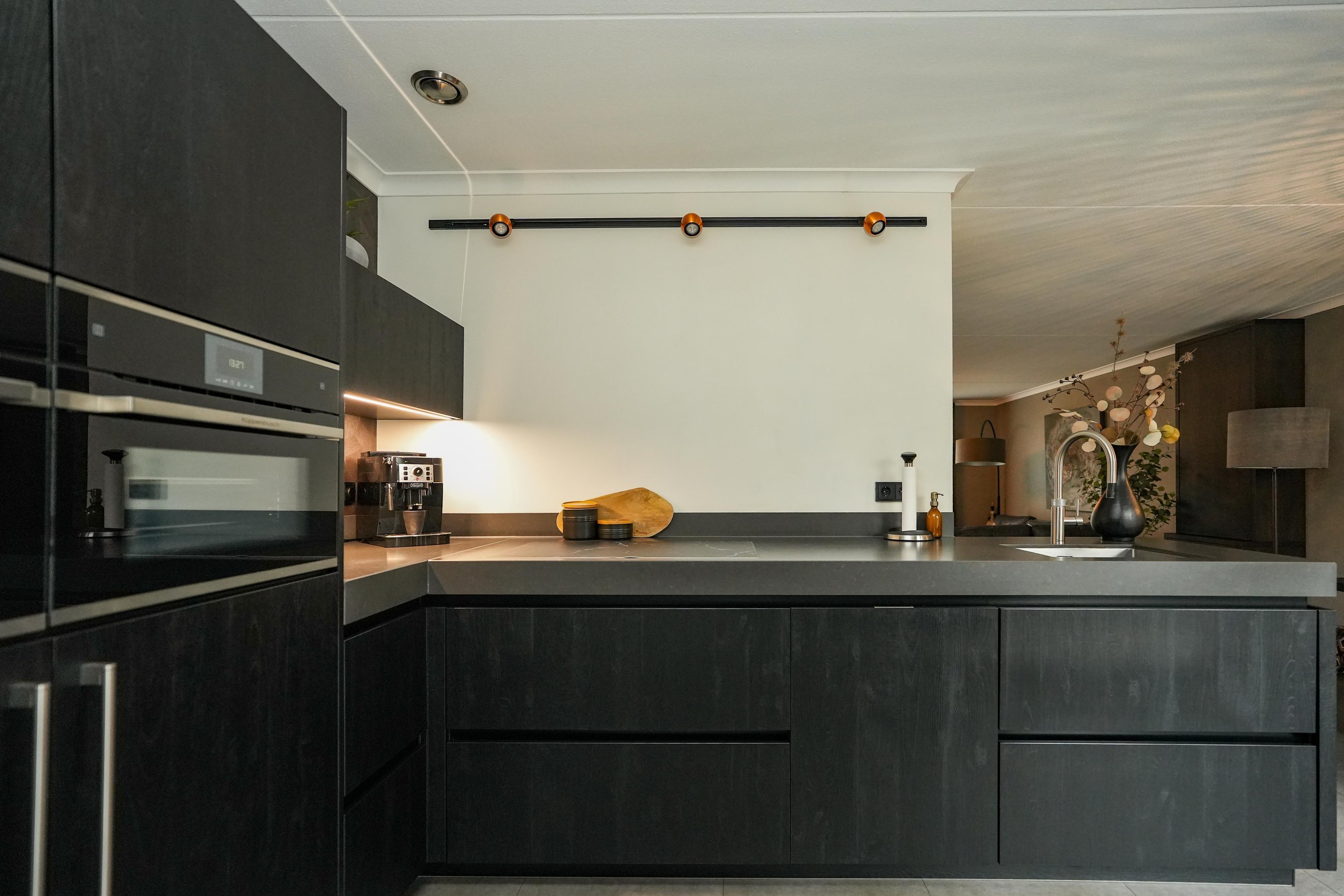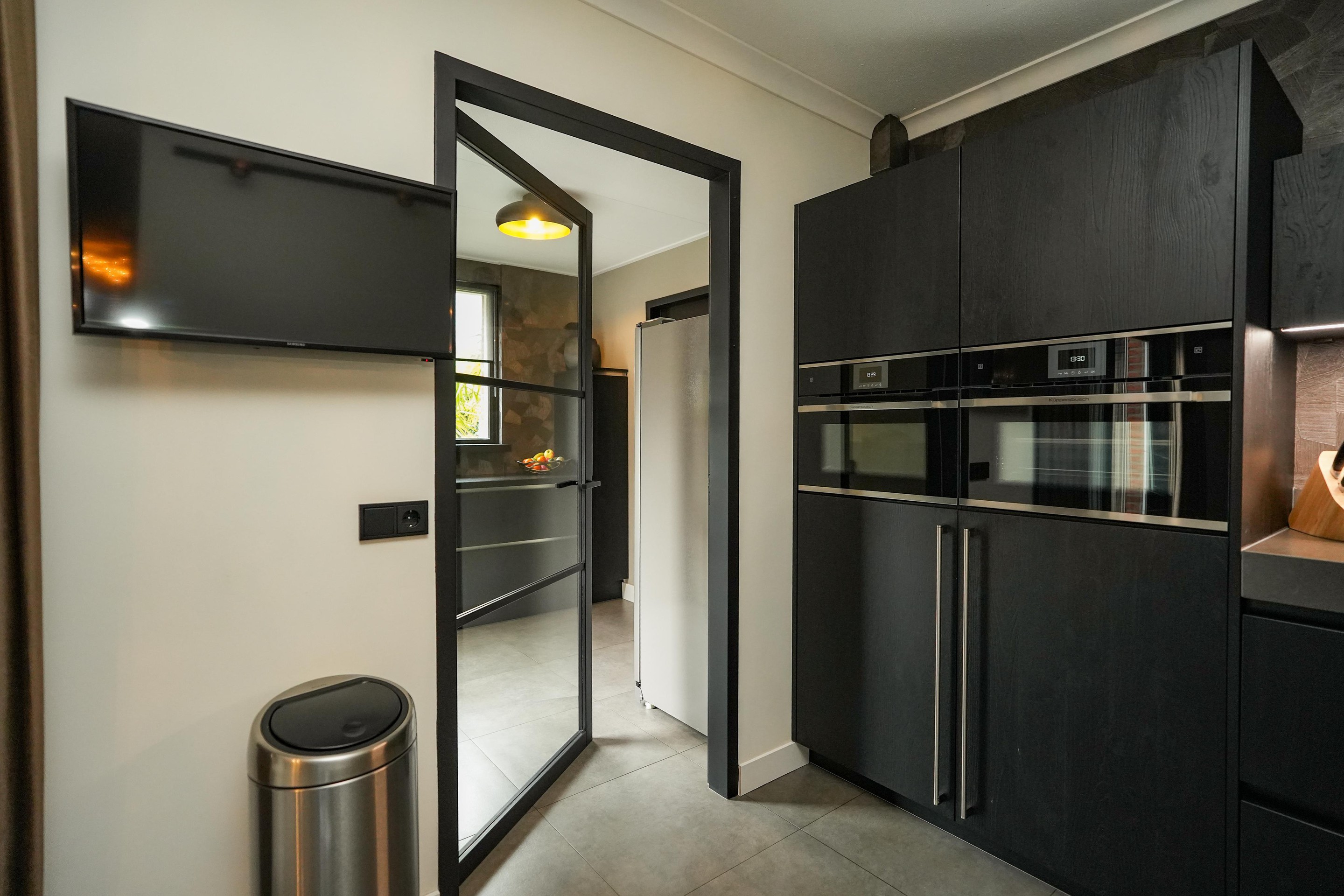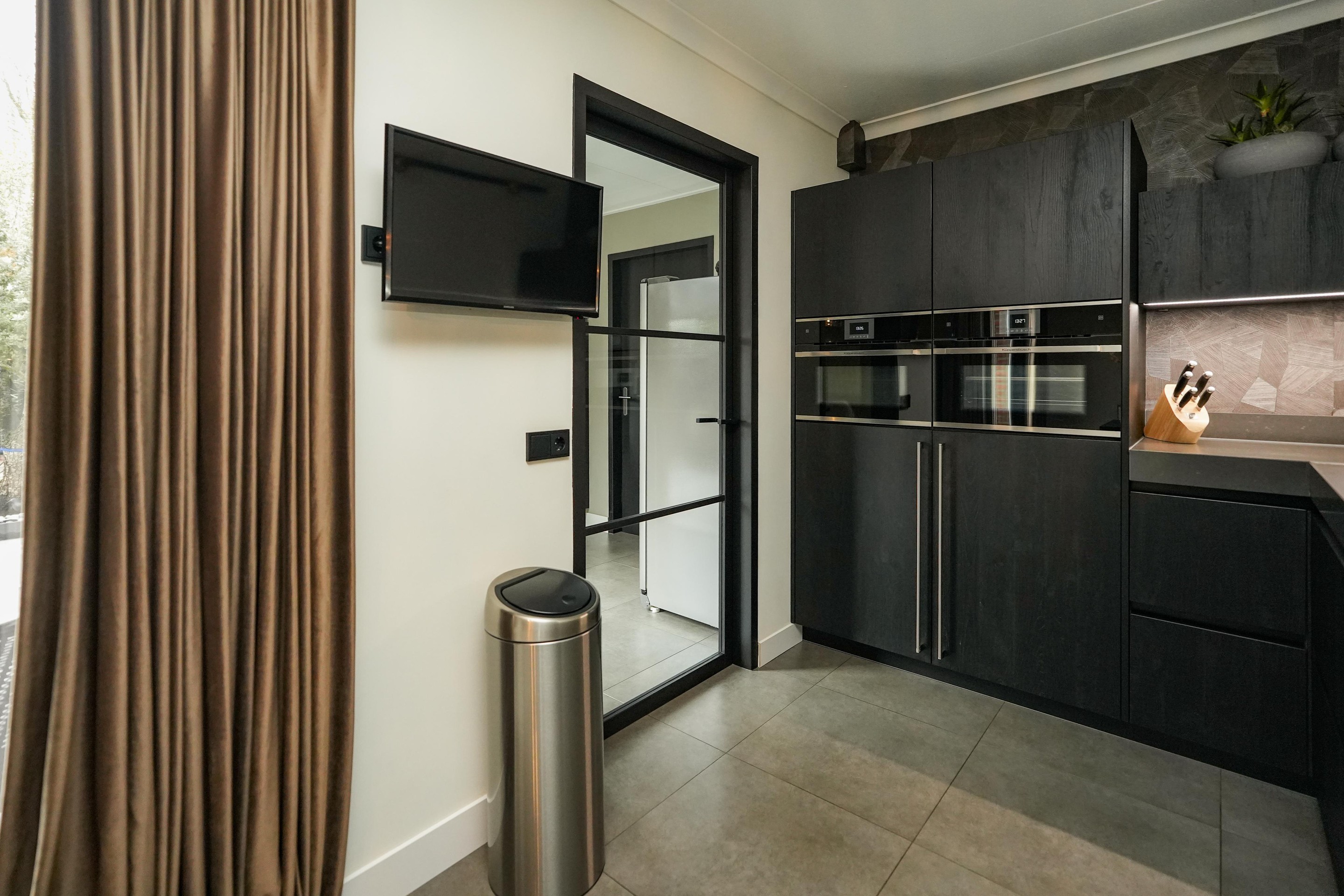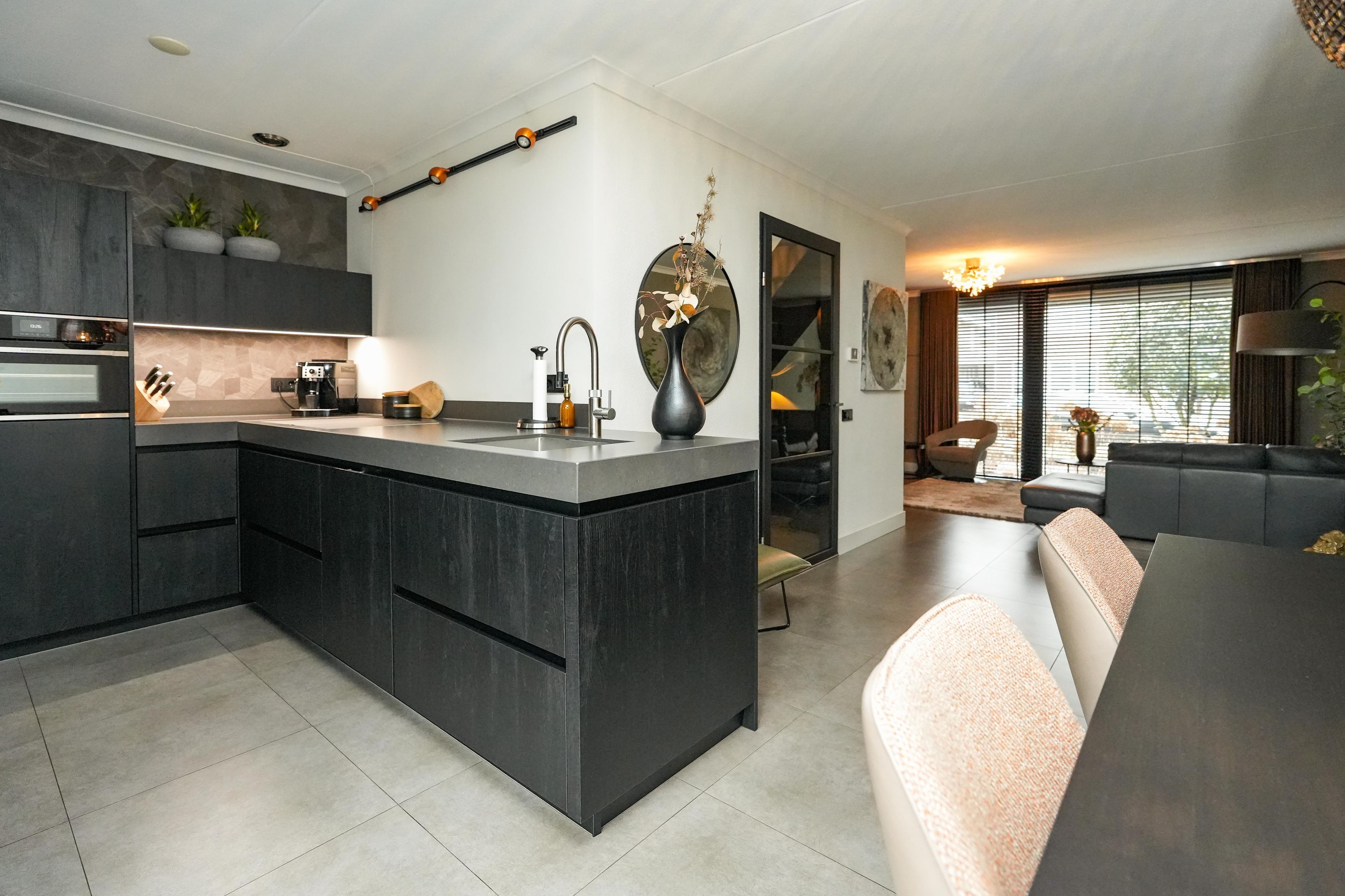 Aansluitend bevindt zich de luxe keuken, een echt pronkstuk van de woning. De keuken is voorzien van hoogwaardige inbouwapparatuur, waaronder een Quooker, inductiekookplaat, downdraft afzuiger, stoomoven en combioven van Küppersbusch. De stijlvolle raambekleding, zoals Luxaflex en gordijnen, onderstrepen het luxe karakter.