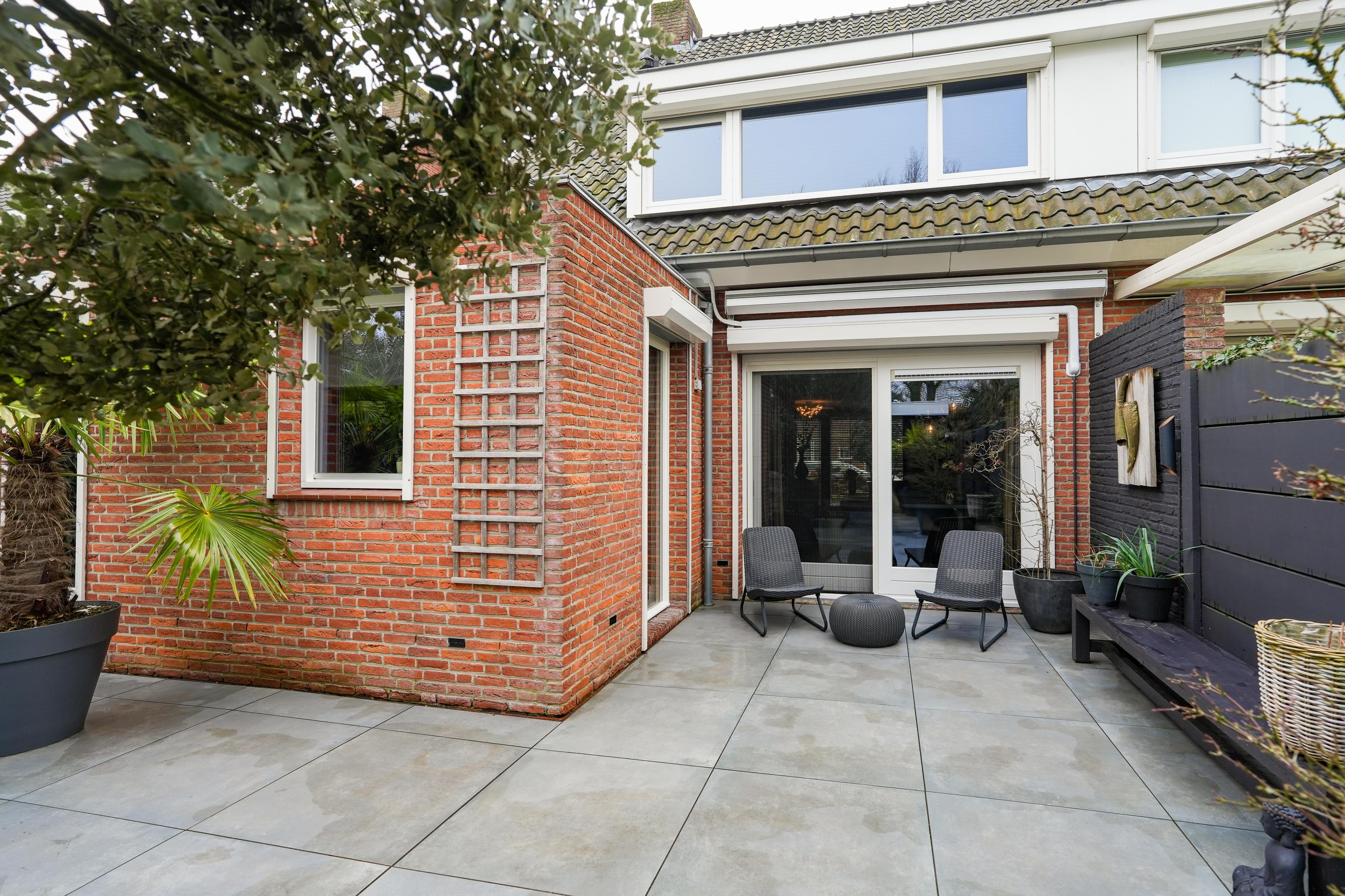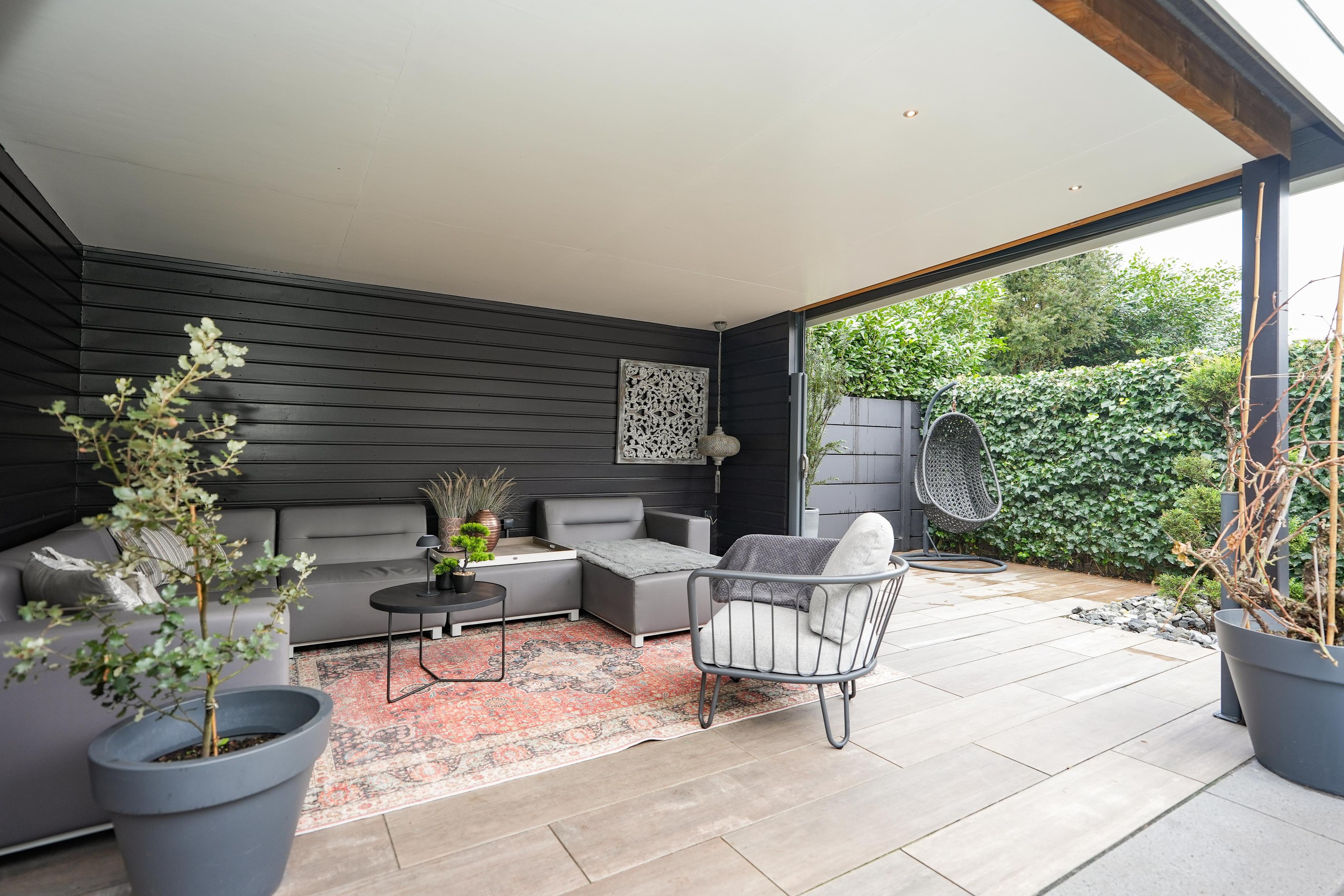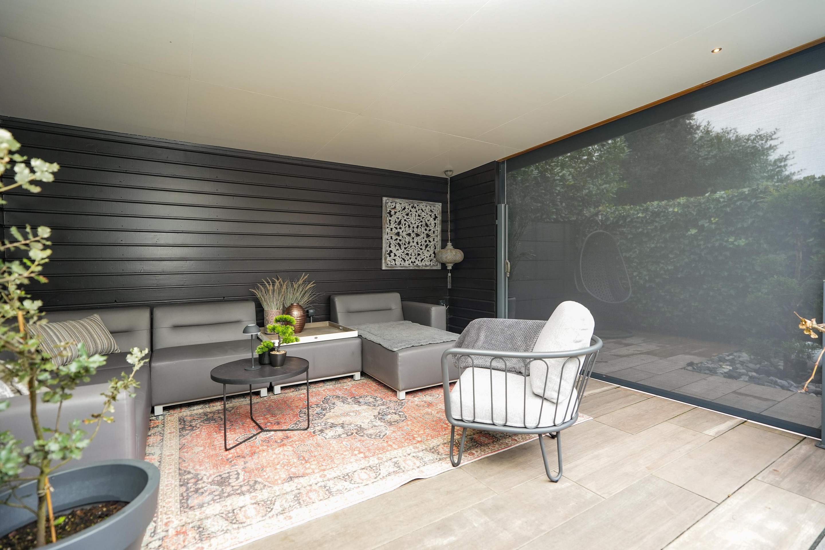 De achtertuin is noordwestelijk gelegen, waardoor u in de namiddag en avond optimaal van de zon kunt genieten. Voor kinderen is de tuin zeer veilig en speels ingericht, met meerdere terrasjes en voldoende ruimte om te spelen. De tuin is omheind met een moderne betonnen schutting en een groene haag, en er staat een prachtige steeneik en een zorgvuldig bonsai gesnoeide conifeer wat een luxe en rustige sfeer creëert. Over de volledige breedte van de schuifpui aan de achterzijde van de woning is een modern uitvalscherm van circa 3 meter geplaatst. Hierdoor ontstaat een fijne, beschutte plek waar u heerlijk buiten kunt zitten.