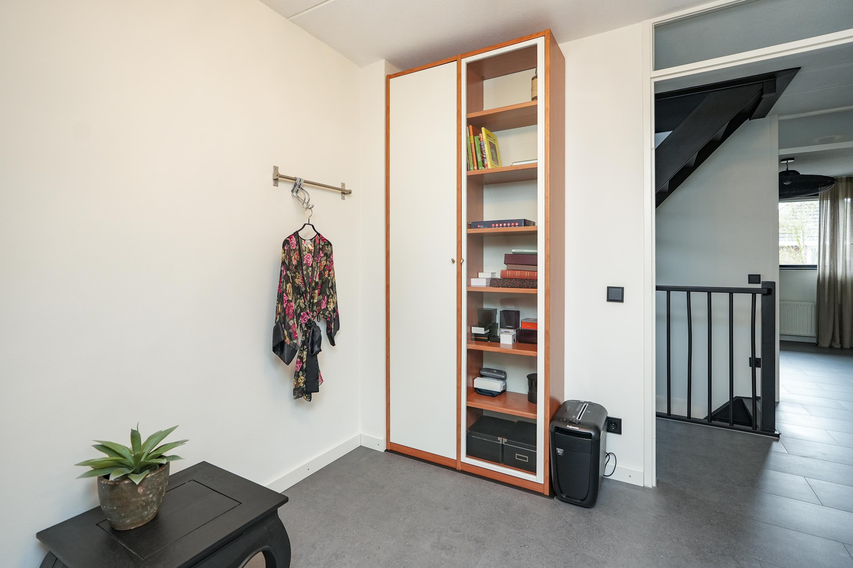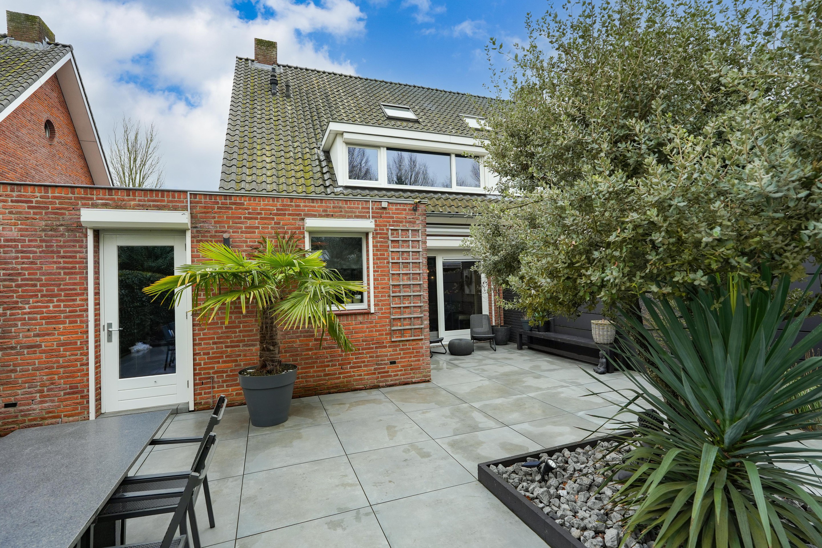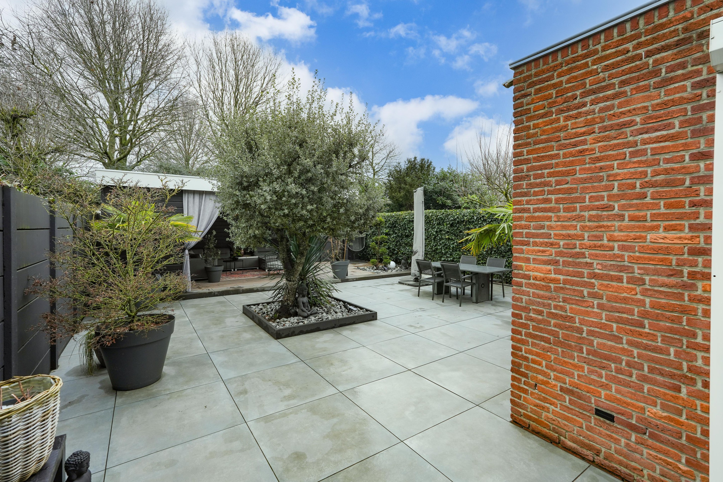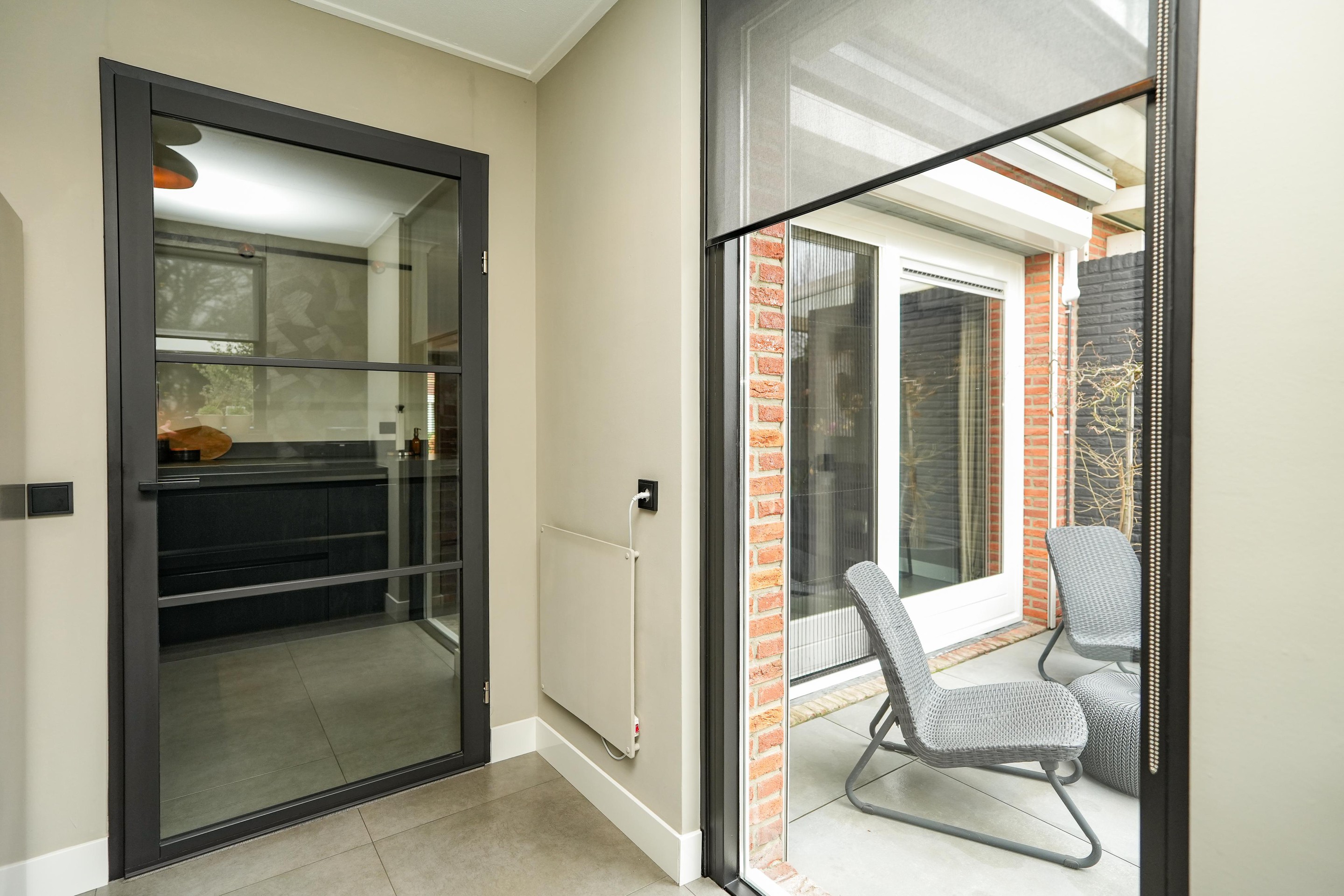 De achtertuin is noordwestelijk gelegen, waardoor u in de namiddag en avond optimaal van de zon kunt genieten. Voor kinderen is de tuin zeer veilig en speels ingericht, met meerdere terrasjes en voldoende ruimte om te spelen. De tuin is omheind met een moderne betonnen schutting en een groene haag, en er staat een prachtige steeneik en een zorgvuldig bonsai gesnoeide conifeer wat een luxe en rustige sfeer creëert. Over de volledige breedte van de schuifpui aan de achterzijde van de woning is een modern uitvalscherm van circa 3 meter geplaatst. Hierdoor ontstaat een fijne, beschutte plek waar u heerlijk buiten kunt zitten.