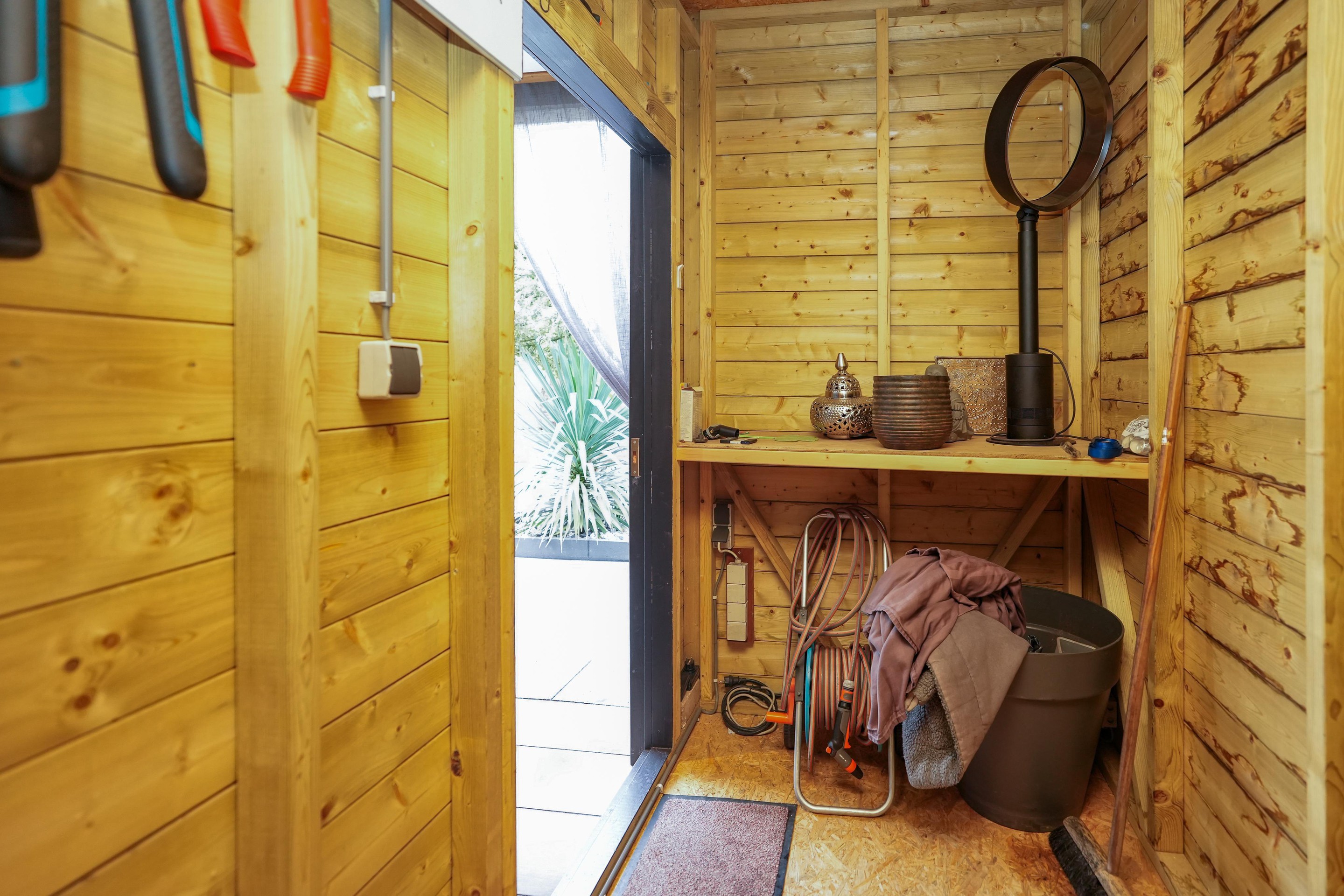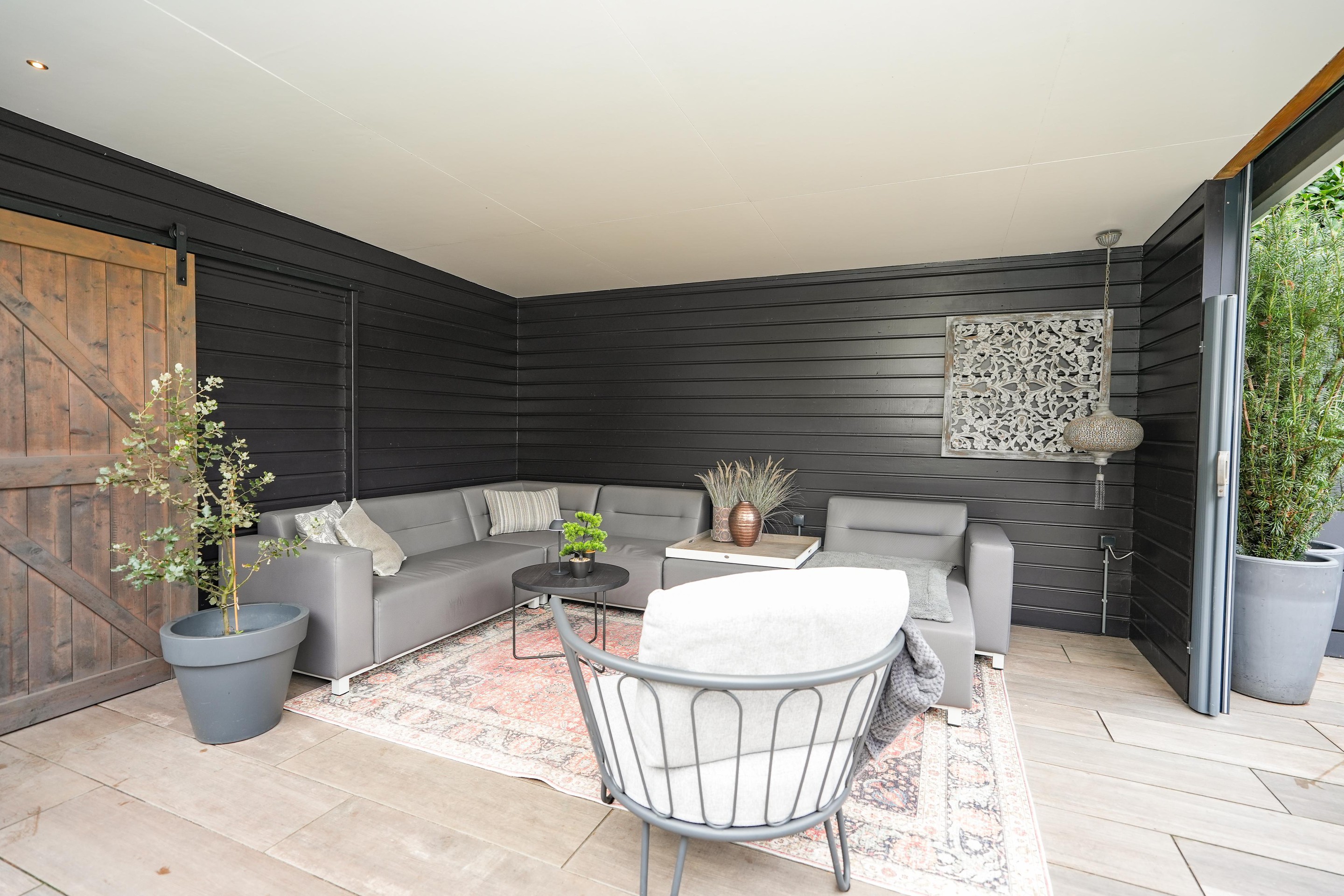 Deze woning beschikt over een prachtige, natuurlijke voor- en achtertuin, waarbij de oprit plaats biedt aan twee auto’s. De royale achtertuin is een echte oase van rust en privacy en is voorzien van een luxe, vrijstaande tuinkamer/veranda. Deze sfeervolle tuinkamer is uitgerust met screens, waardoor u op warme of zonnige dagen heerlijk beschut kunt zitten, en biedt via een grote, fraaie deur directe toegang tot de aangrenzende tuinberging. De mooie tegelvloer en de stijlvolle afwerking maken het een comfortabele plek om te ontspannen of samen te genieten van de tuin.