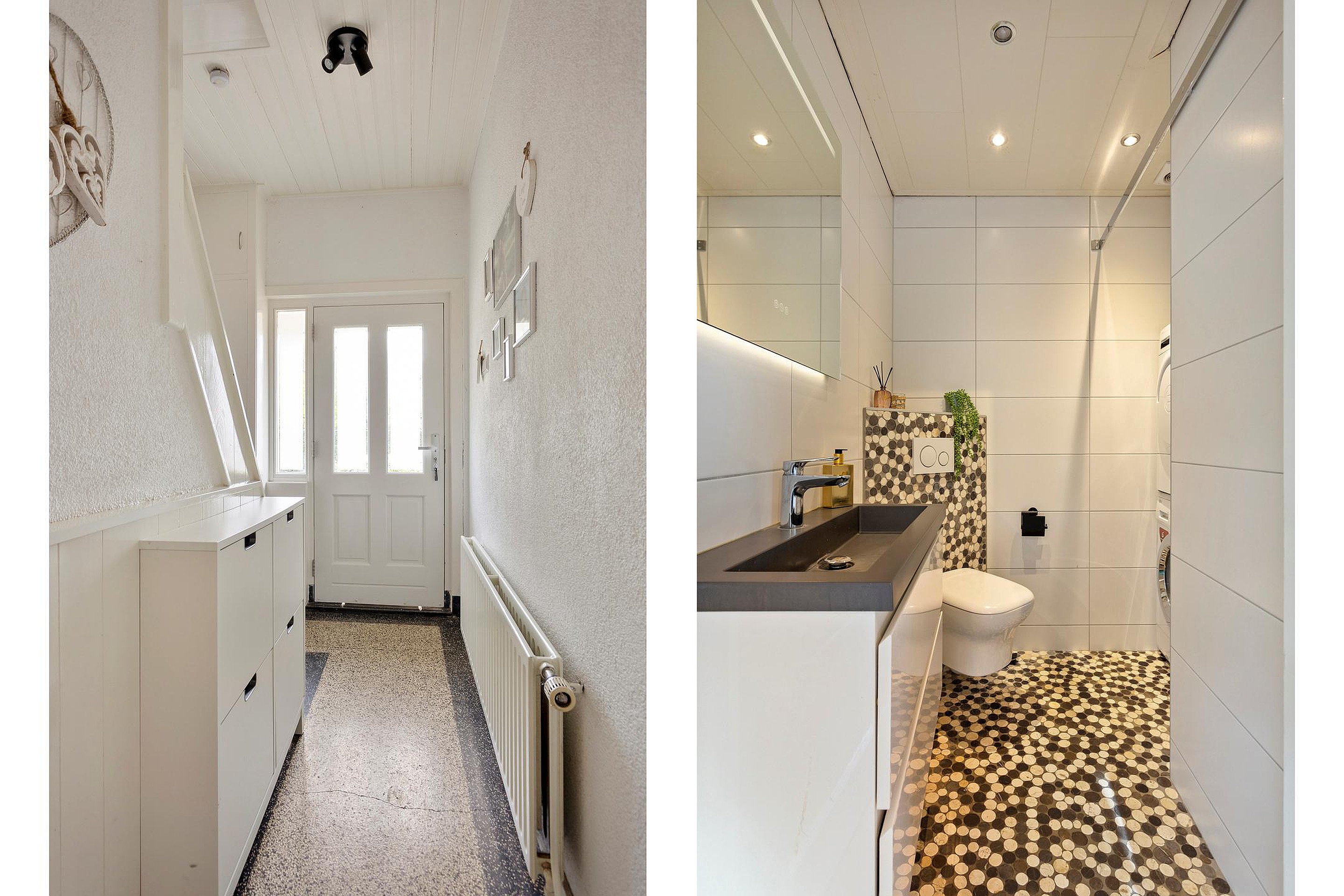 Moderne badkamer, voorzien van douche, aansluitingen wasmachine en droger, zwevend toilet en wastafel.