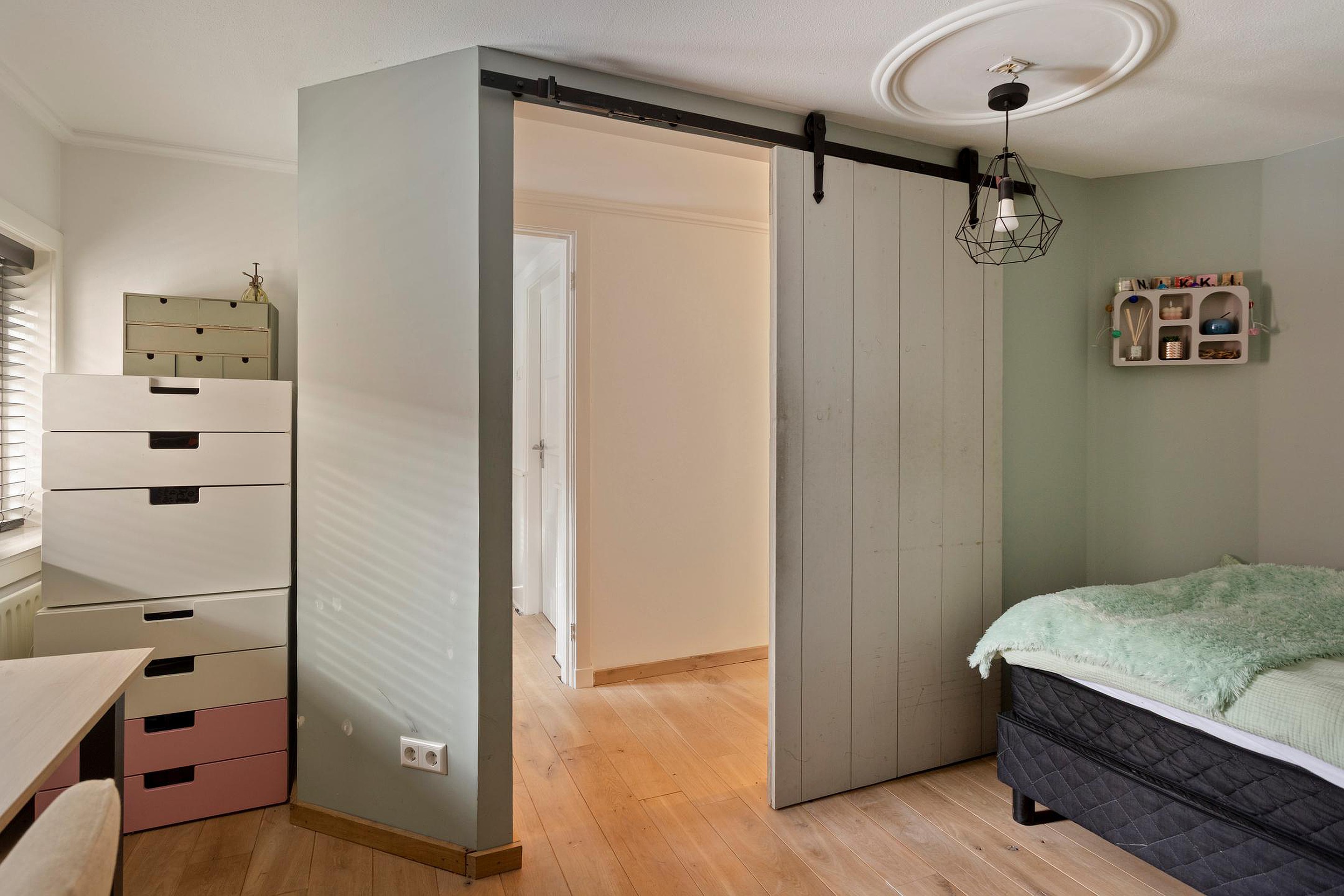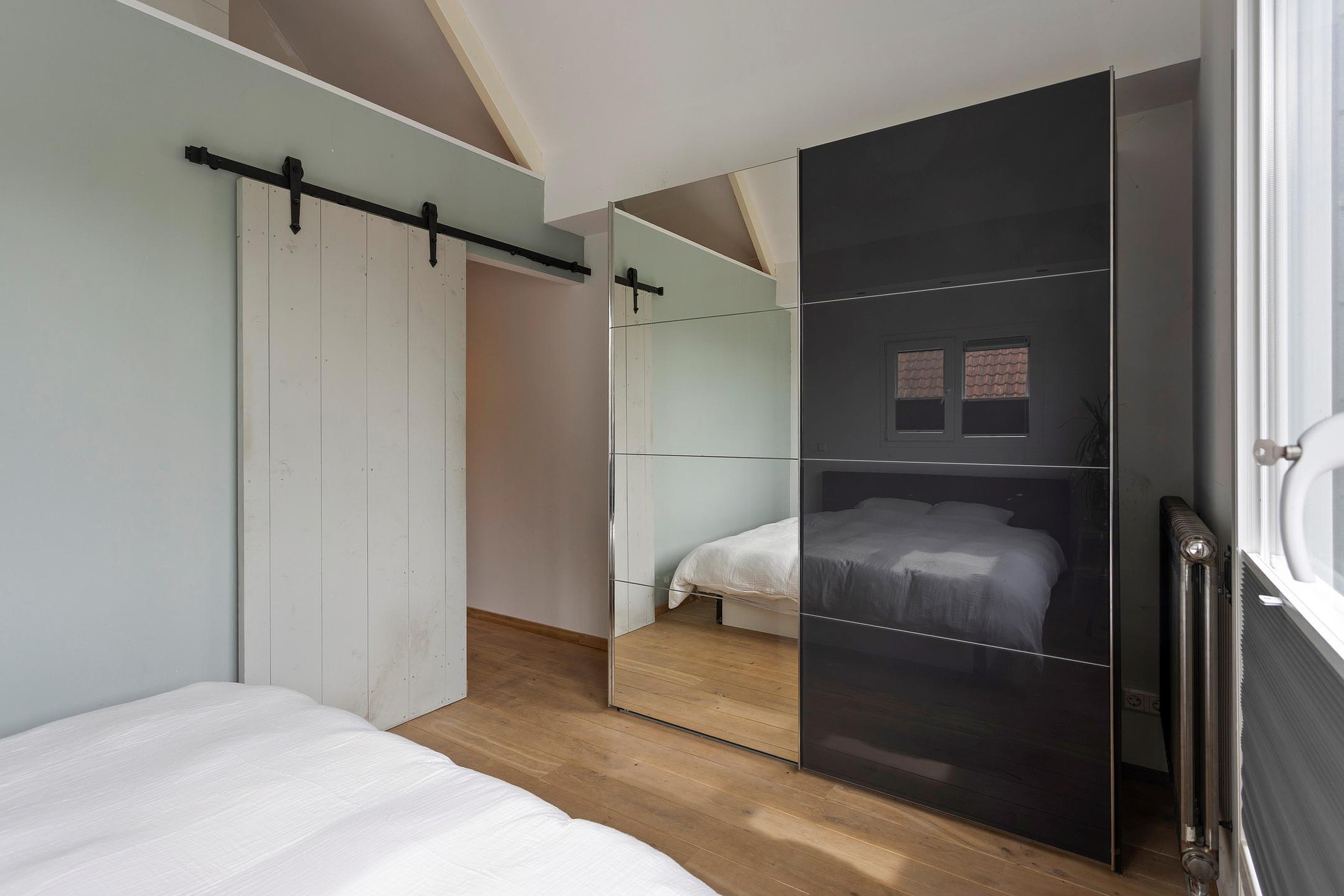 Eerste verdieping Overloop, 4 nette slaapkamers met veel bergruimte onder de schuine kap, of op de vliering. De moderne badkamer (2019) is uitgerust met een ligbad, inloopdouche, toilet en dubbele wastafel met opbergmeubel. Er is een apart modern toilet aan de voorzijde van de eerste verdieping gemaakt, met fonteintje.