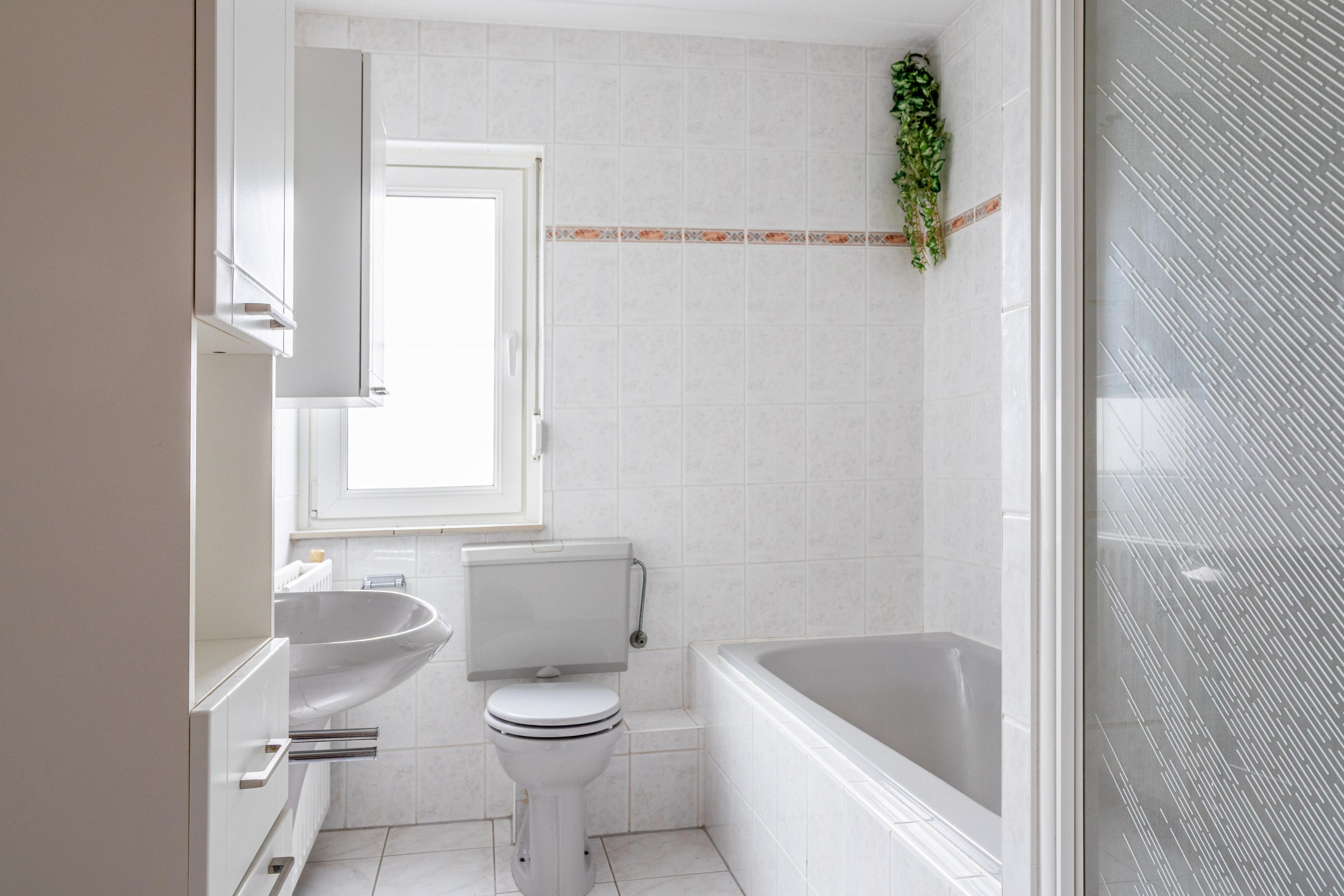 Overloop, hoofdslaapkamer met een doorgang naar de 2e slaapkamer die als walk-in closet wordt gebruiktmaar eenvoudig weer is te herstellen, 3e slaapkamer en badkamer met ligbad, douchecabine en vaste wastafel.