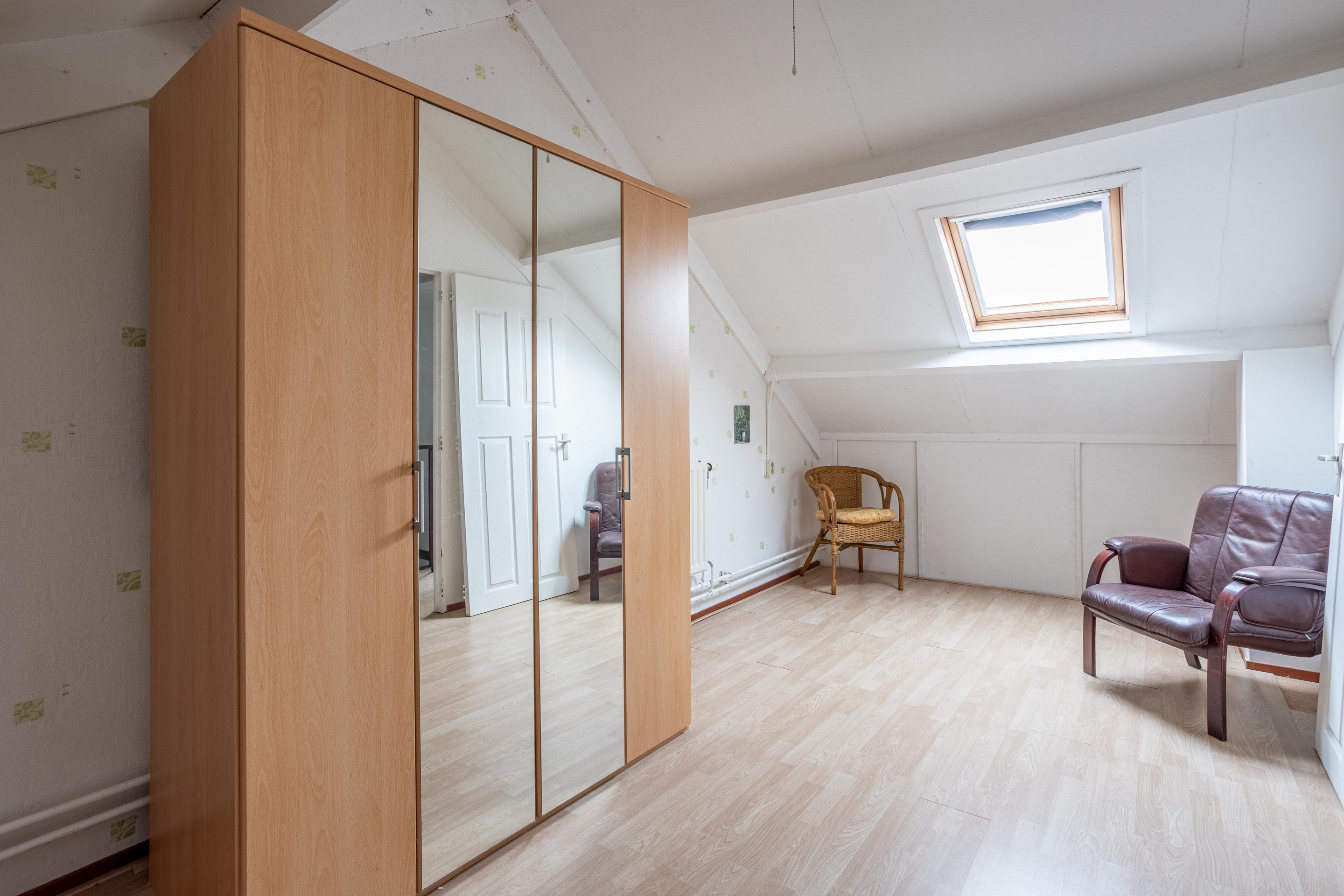 Tweede verdieping Overloop, met witgoedaansluiting en opstelling cv-ketel (Vaillant 2016) en royale slaapkamer met dakraam.