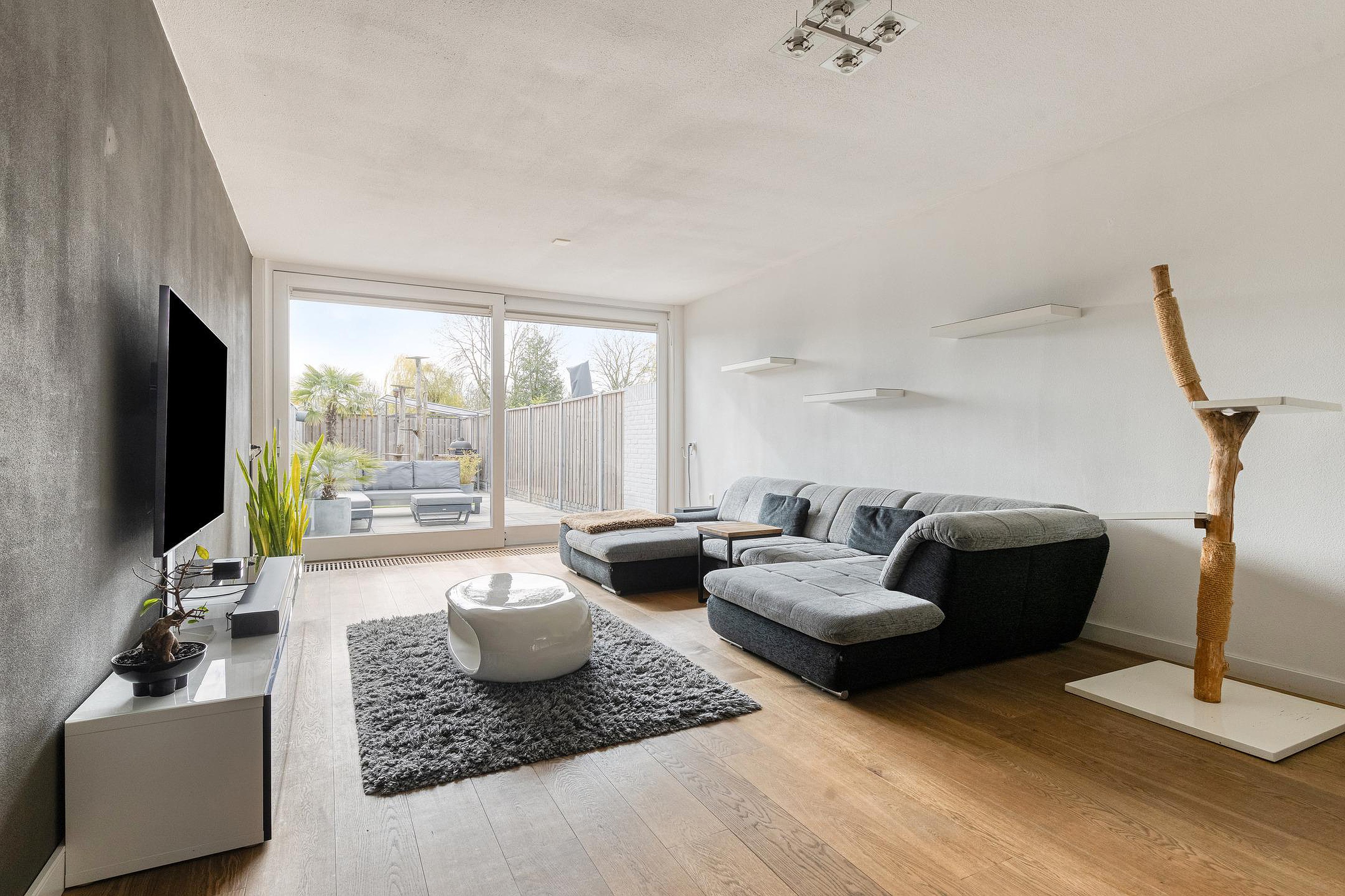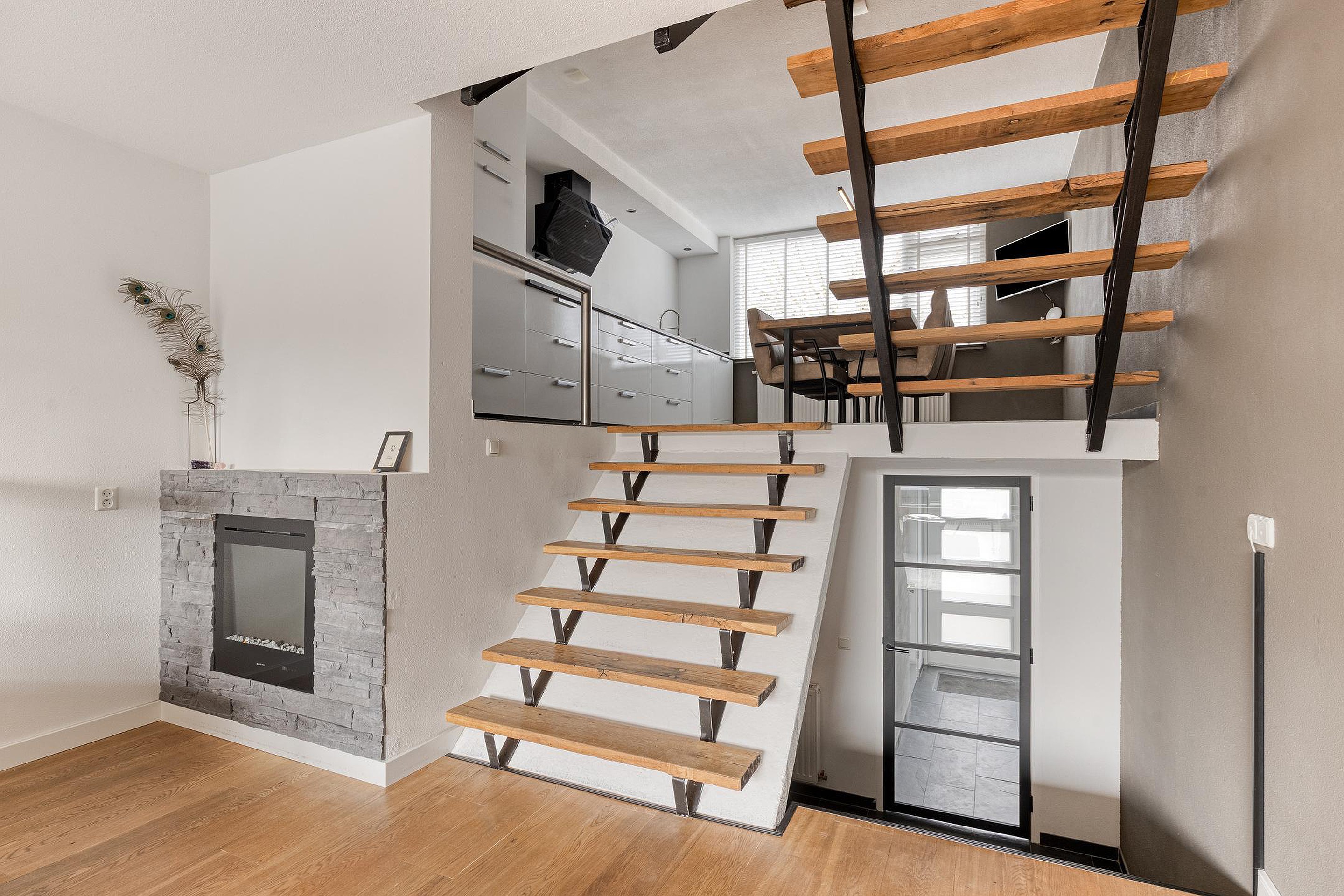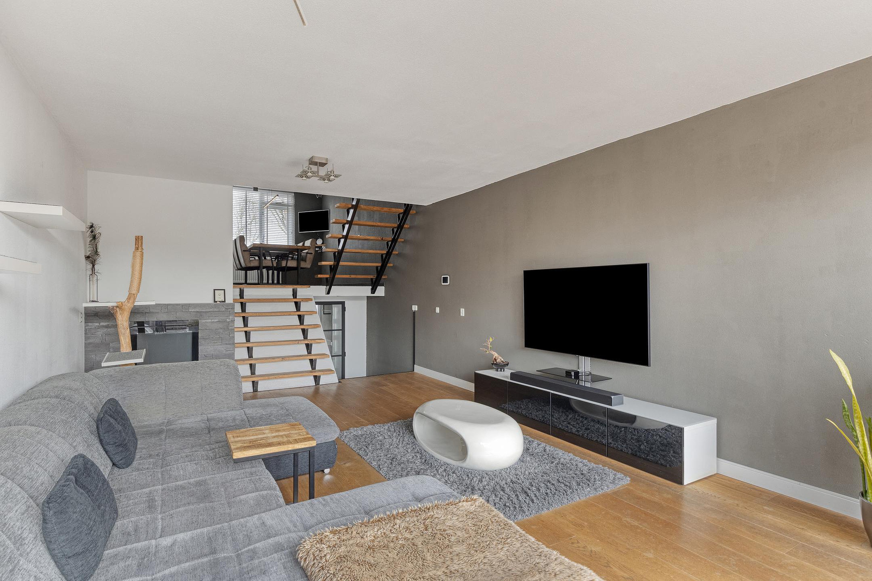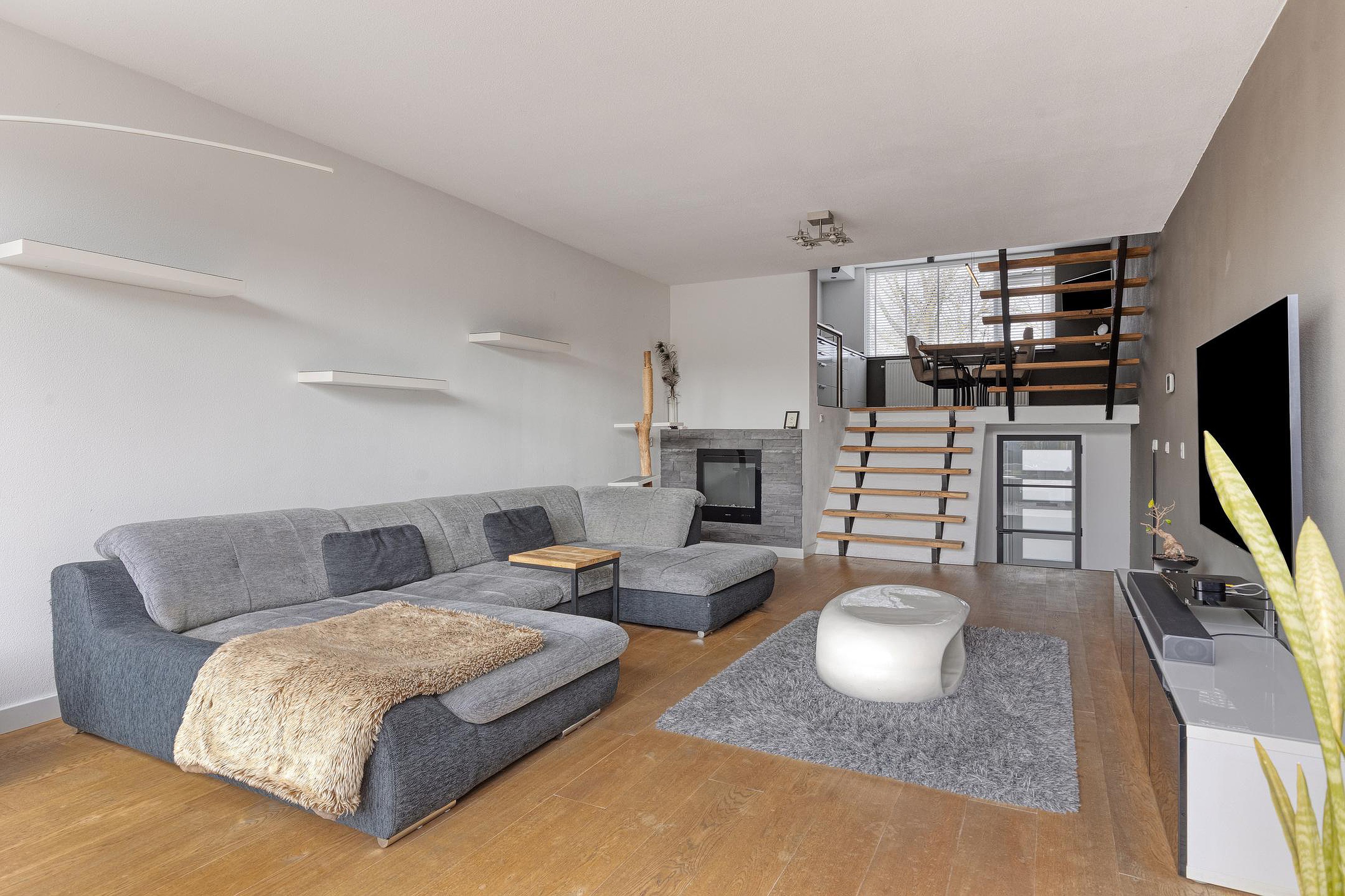 En dan begint het spel van niveaus. Enkele treden brengen u naar de woonkamer, die zich kenmerkt door de open opzet en de prettige lichtinval. De grote schuifpui aan de achterzijde zorgt voor een mooie verbinding met de tuin en maakt dit een fijne plek om te ontspannen. De sfeerhaard en de moderne afwerking geven de ruimte extra warmte en uitstraling.