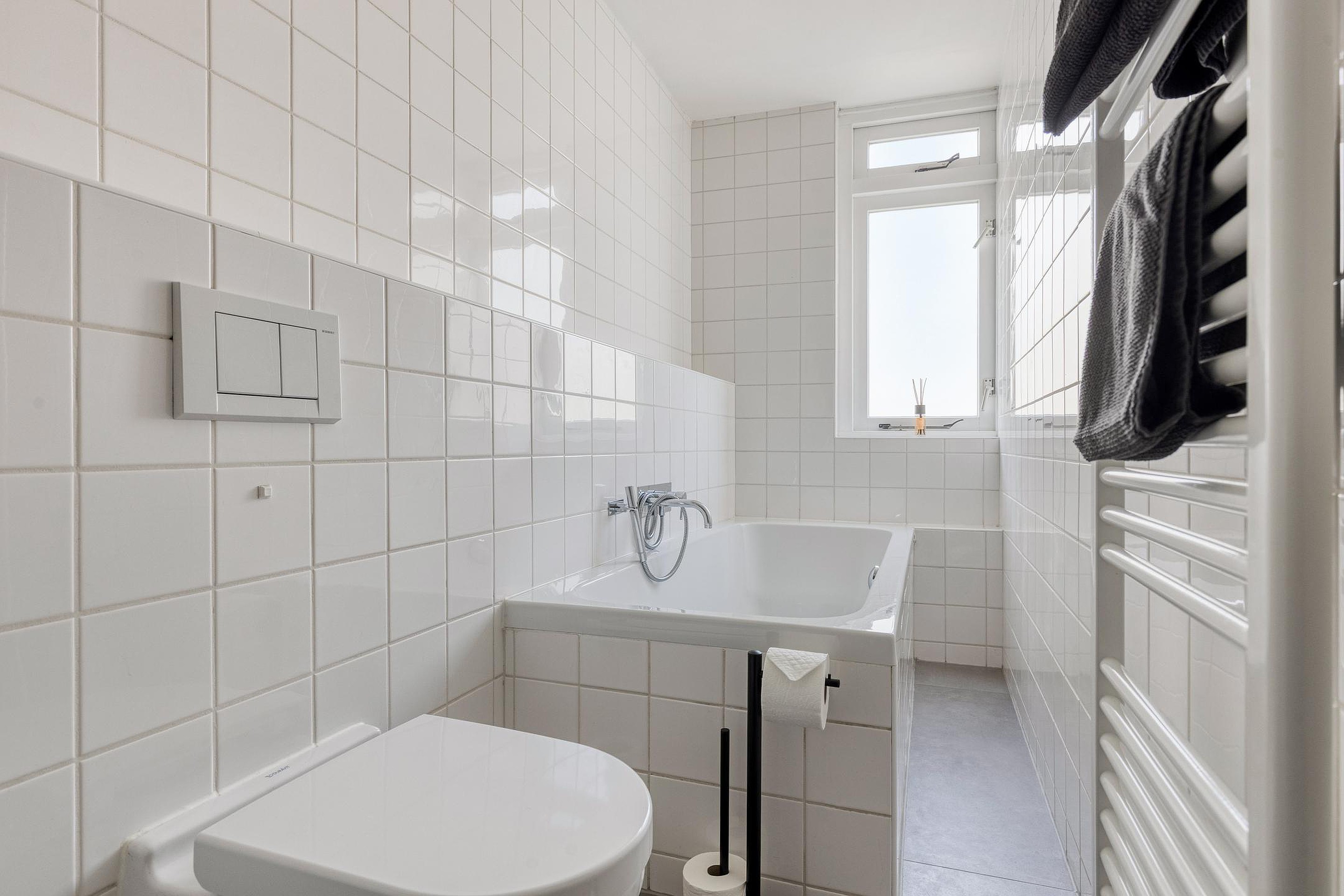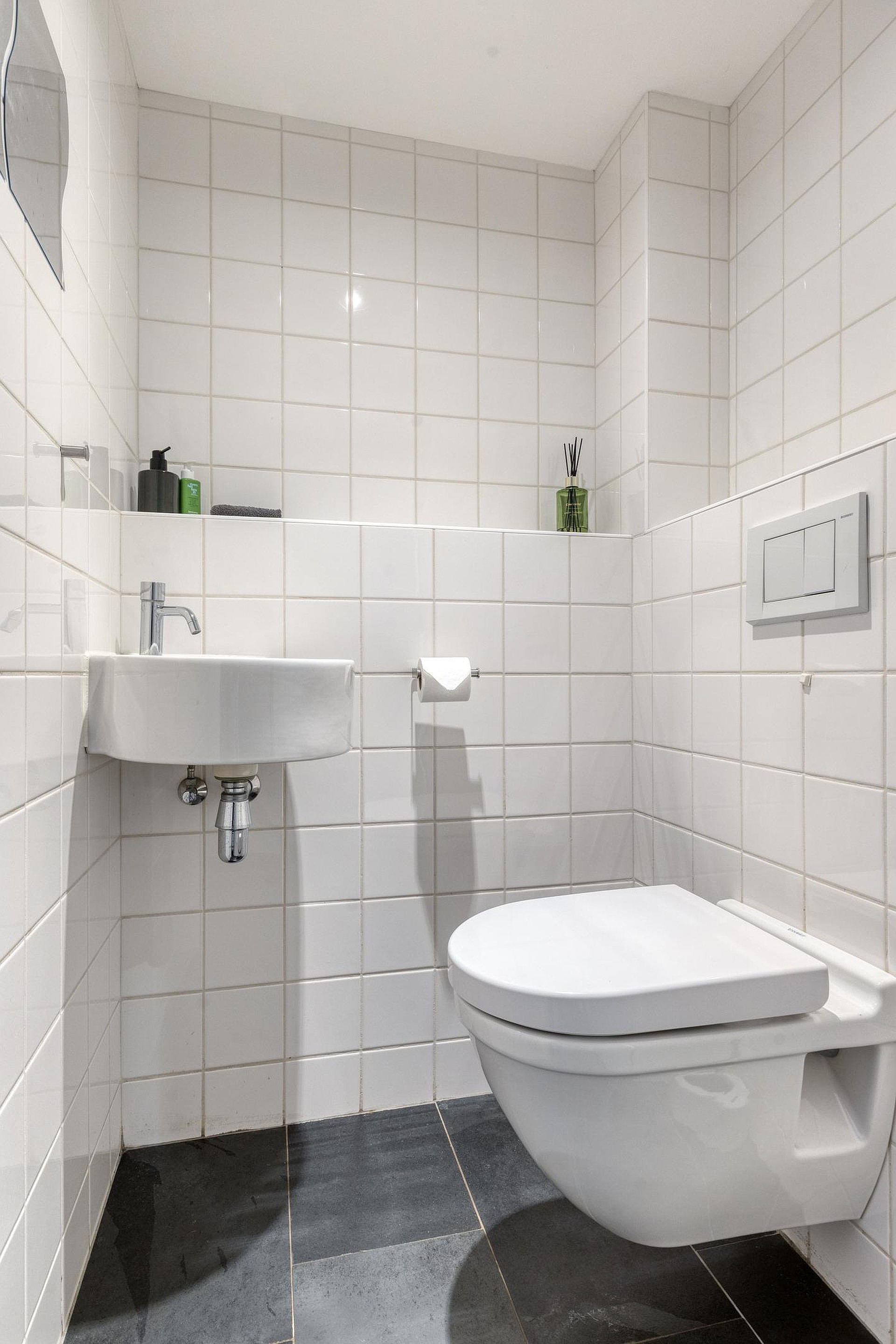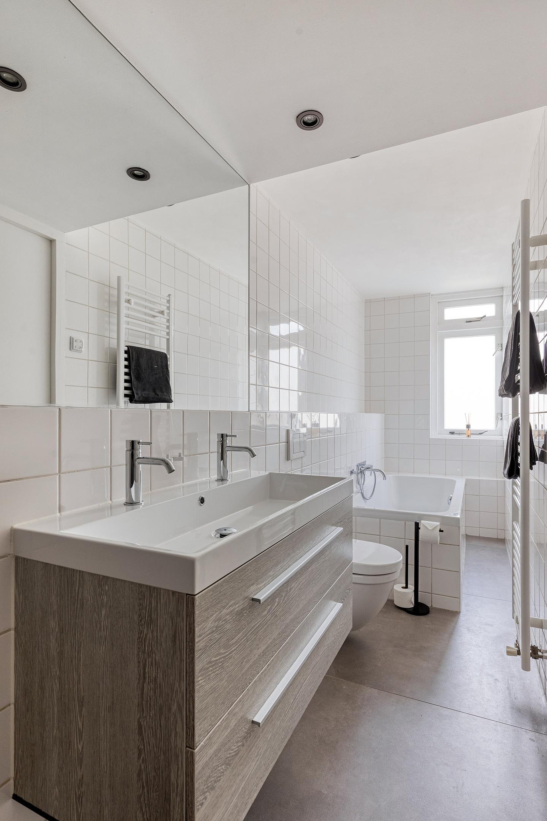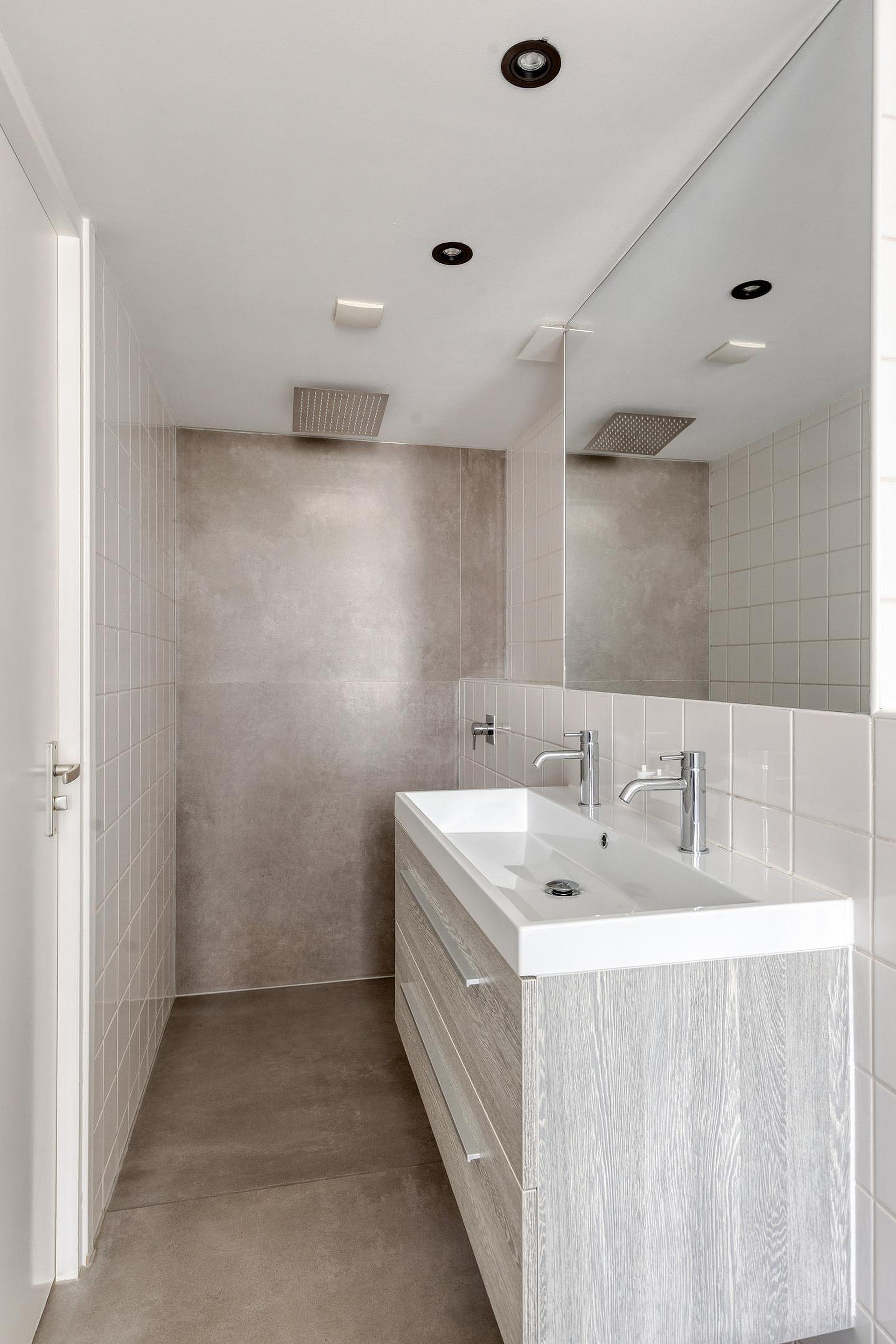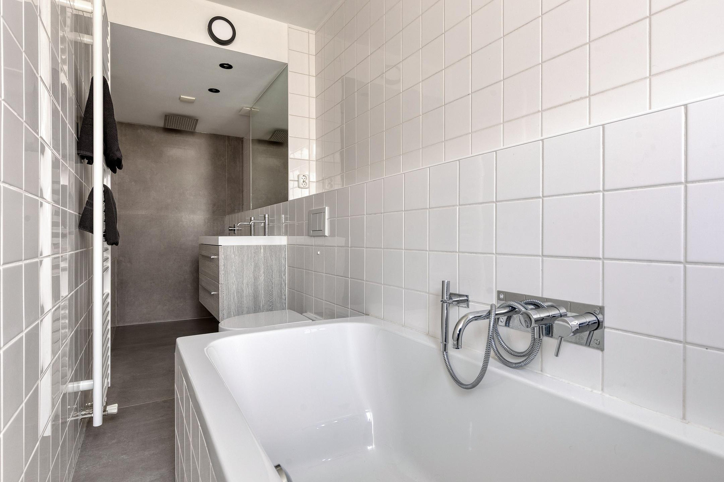 Nog een niveau hoger bereikt u de tweede slaapkamer en de badkamer. De badkamer is strak afgewerkt in betonlook en voorzien van een ligbad, inloop-regendouche, wandcloset en een wastafelmeubel met dubbele kraan. Een lichte en luxueuze ruimte waar comfort centraal staat.