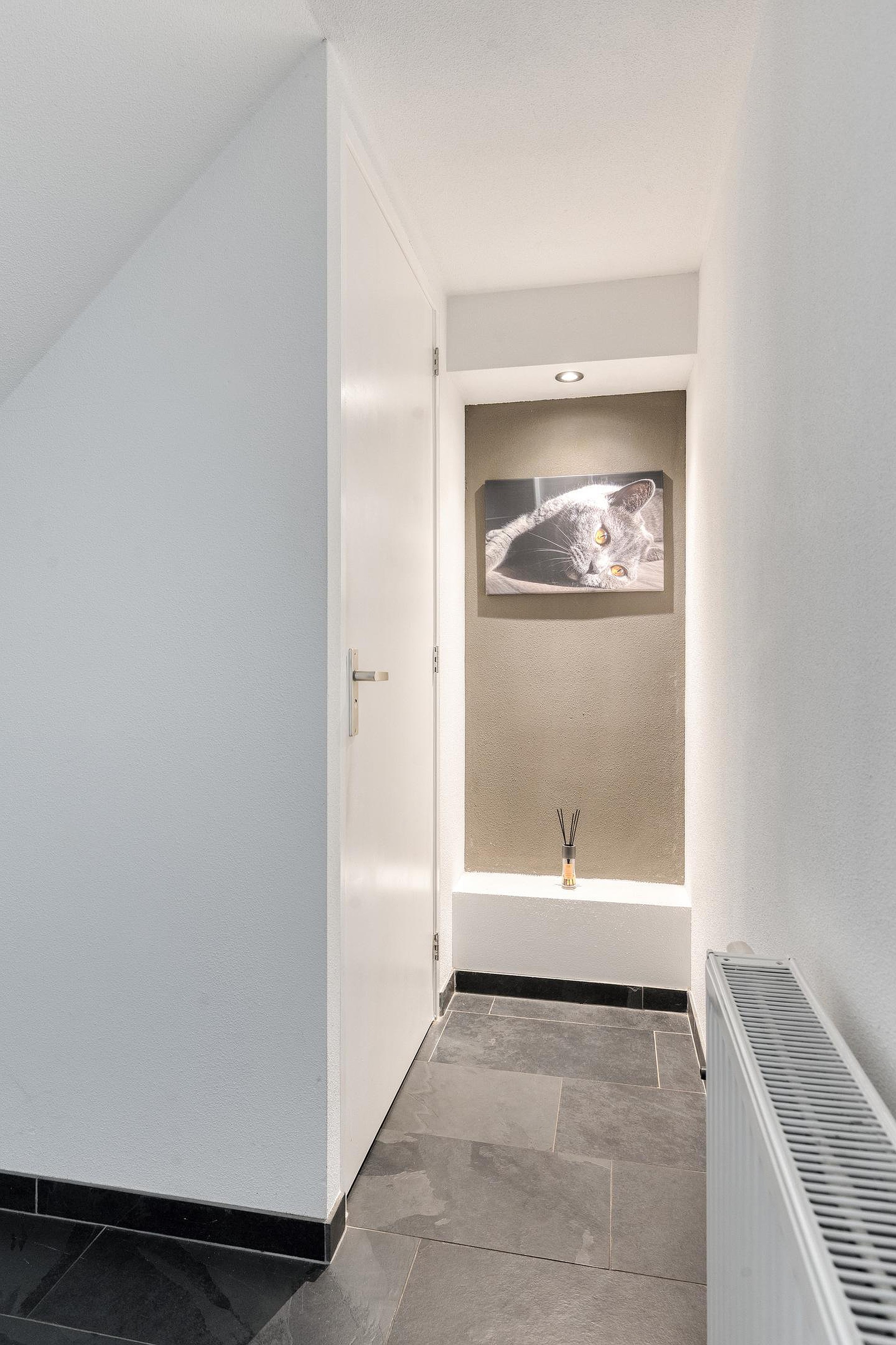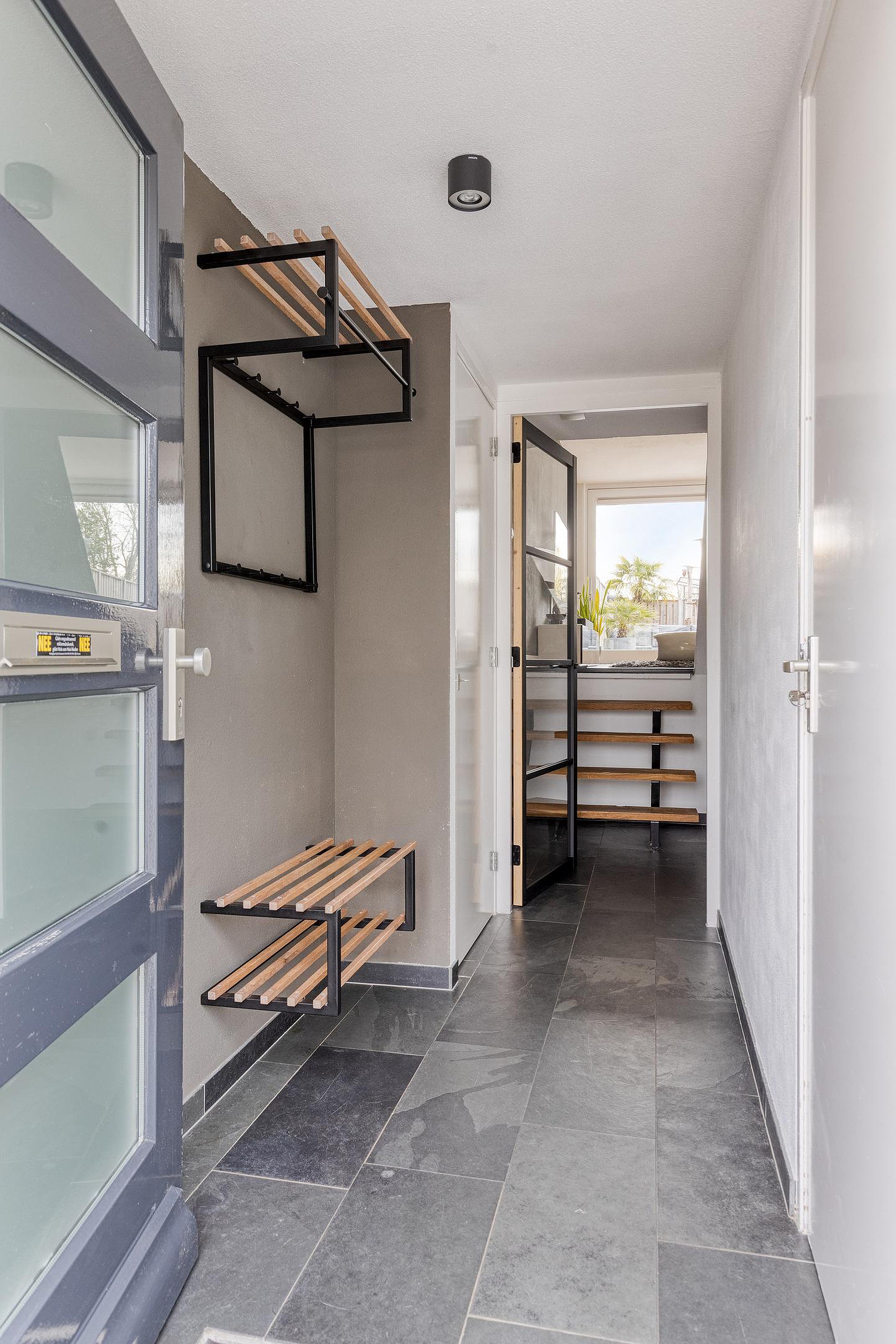 Bij binnenkomst komt u in de entreehal, waar direct de verzorgde afwerking opvalt. Hier heeft u toegang tot de inpandige berging en de leefruimte. Aan de rechterzijde van de hal bevindt zich het toilet.