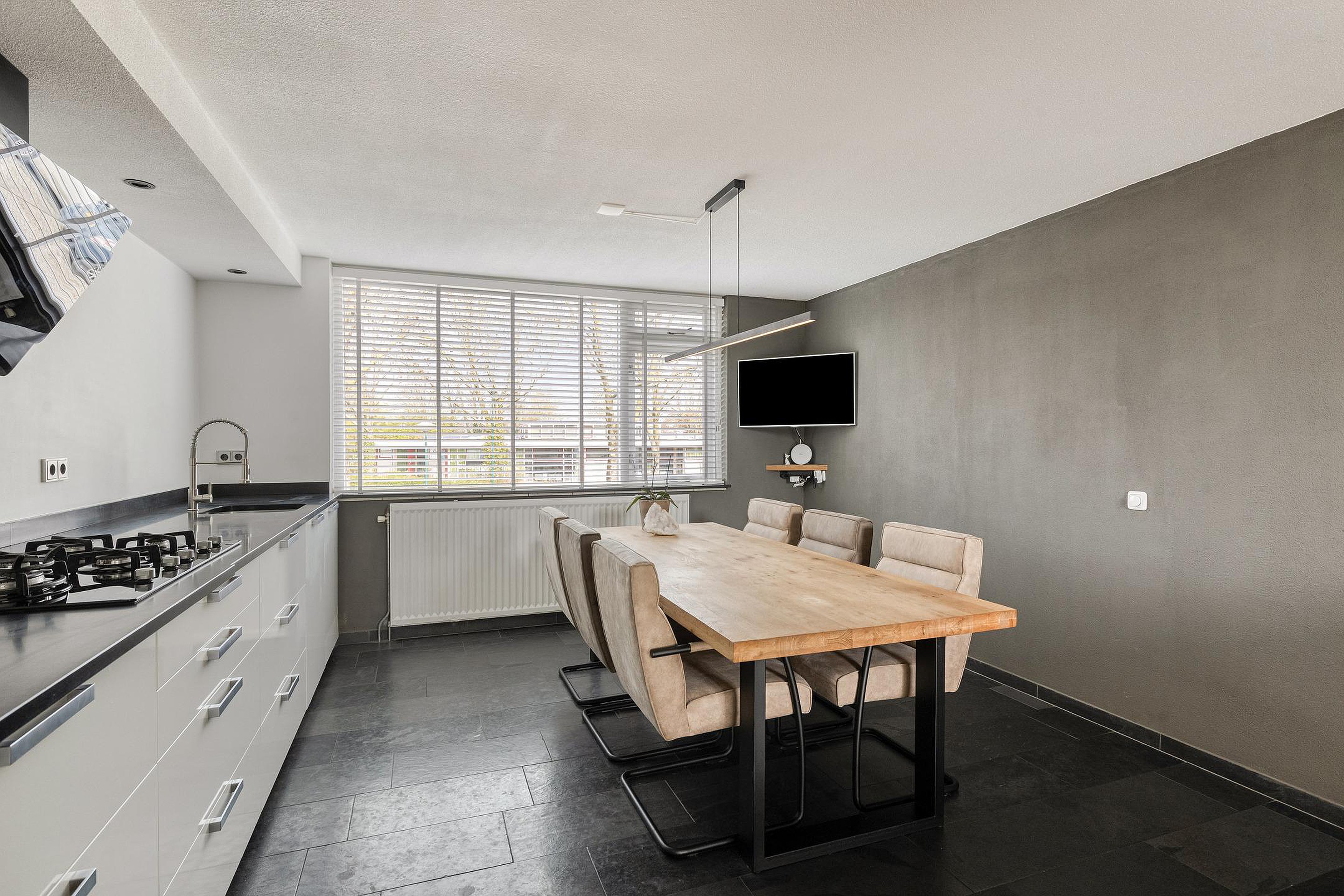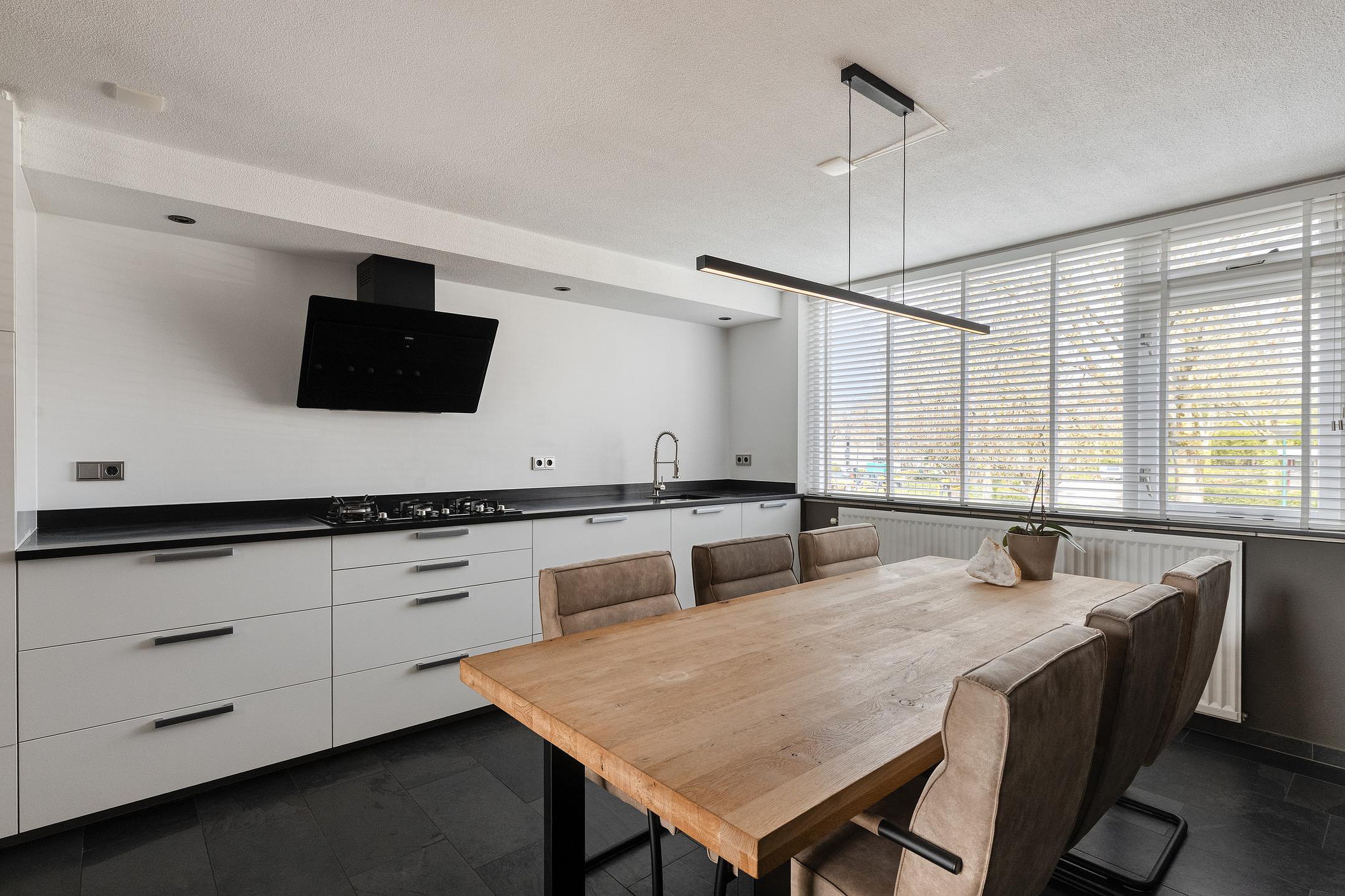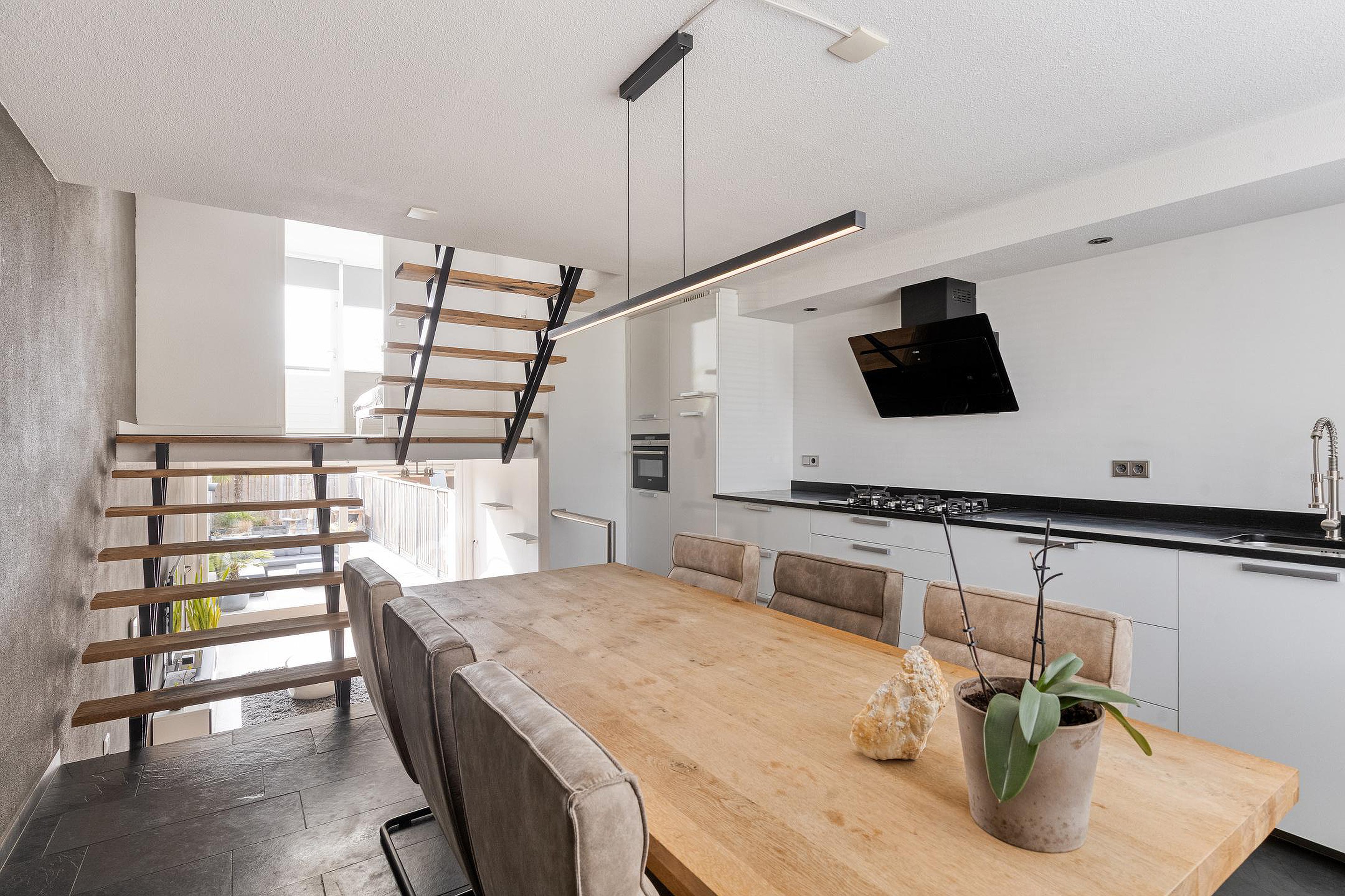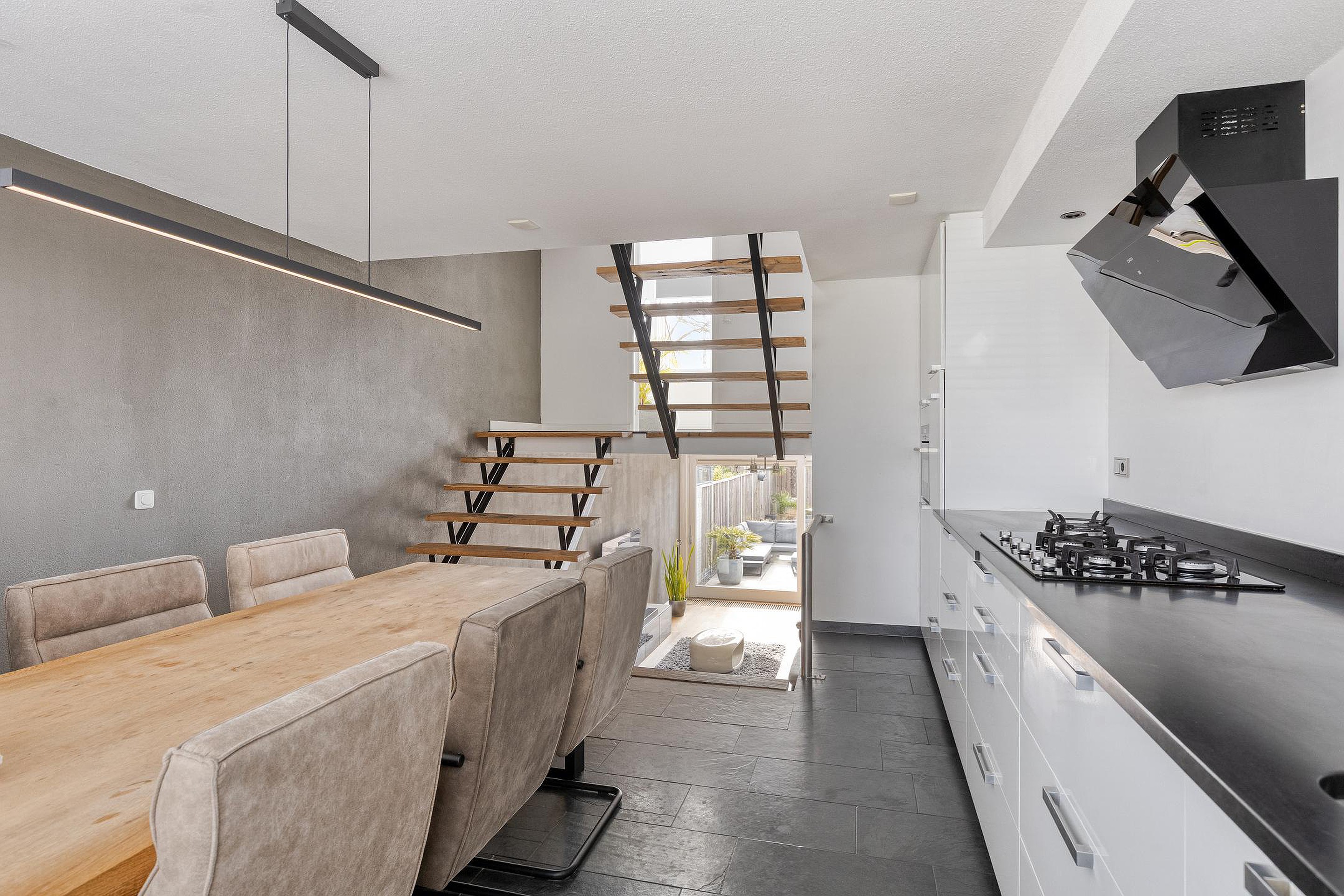 Een halve verdieping hoger bevindt zich de keuken, die ruim is opgezet en voldoende plek biedt voor een grote eettafel. Hier kijkt u uit over de straatzijde, terwijl u toch een fijne, rustige plek heeft om uitgebreid te tafelen. De keuken is modern uitgevoerd en sluit mooi aan bij de rest van de woning.