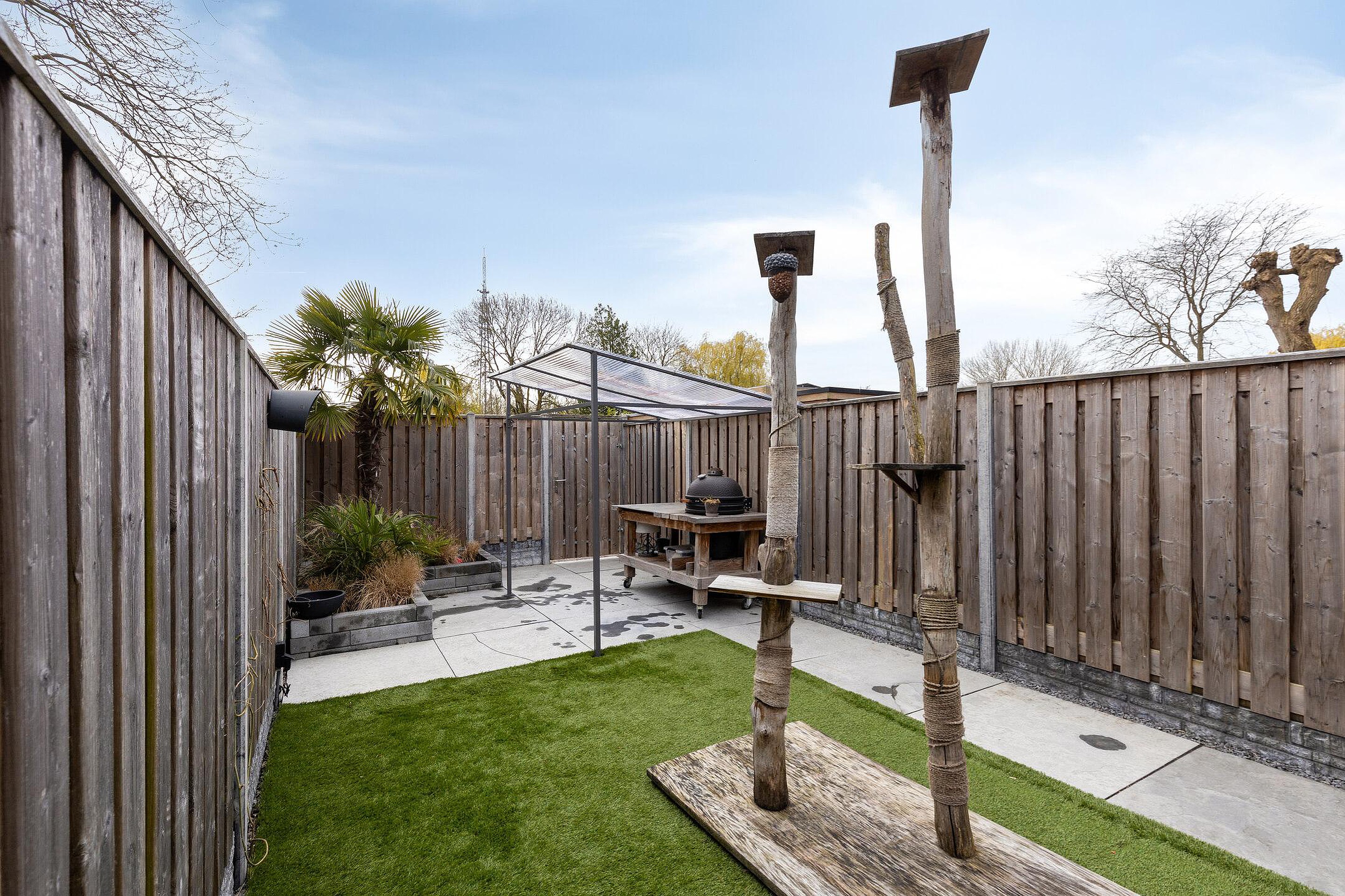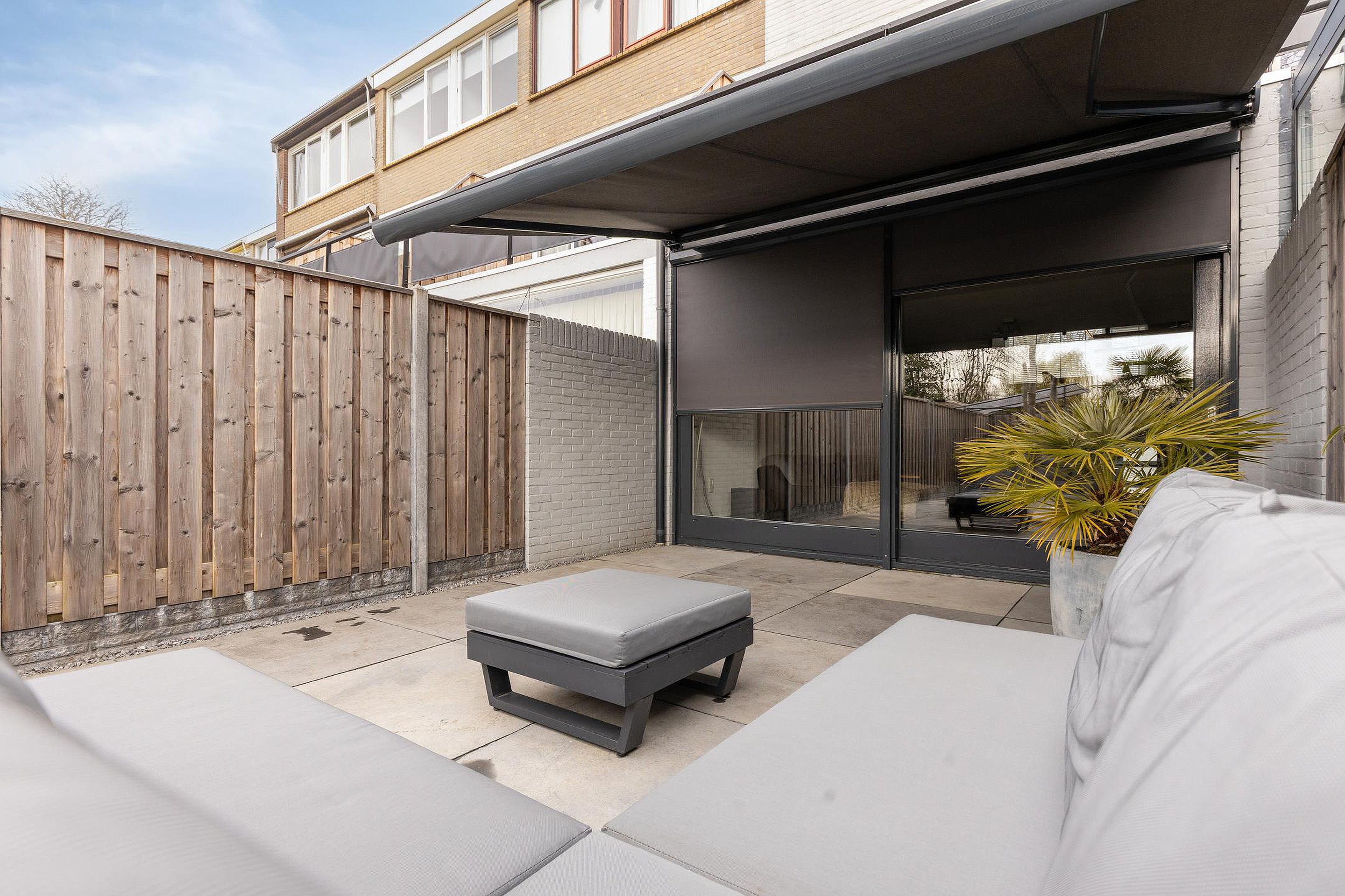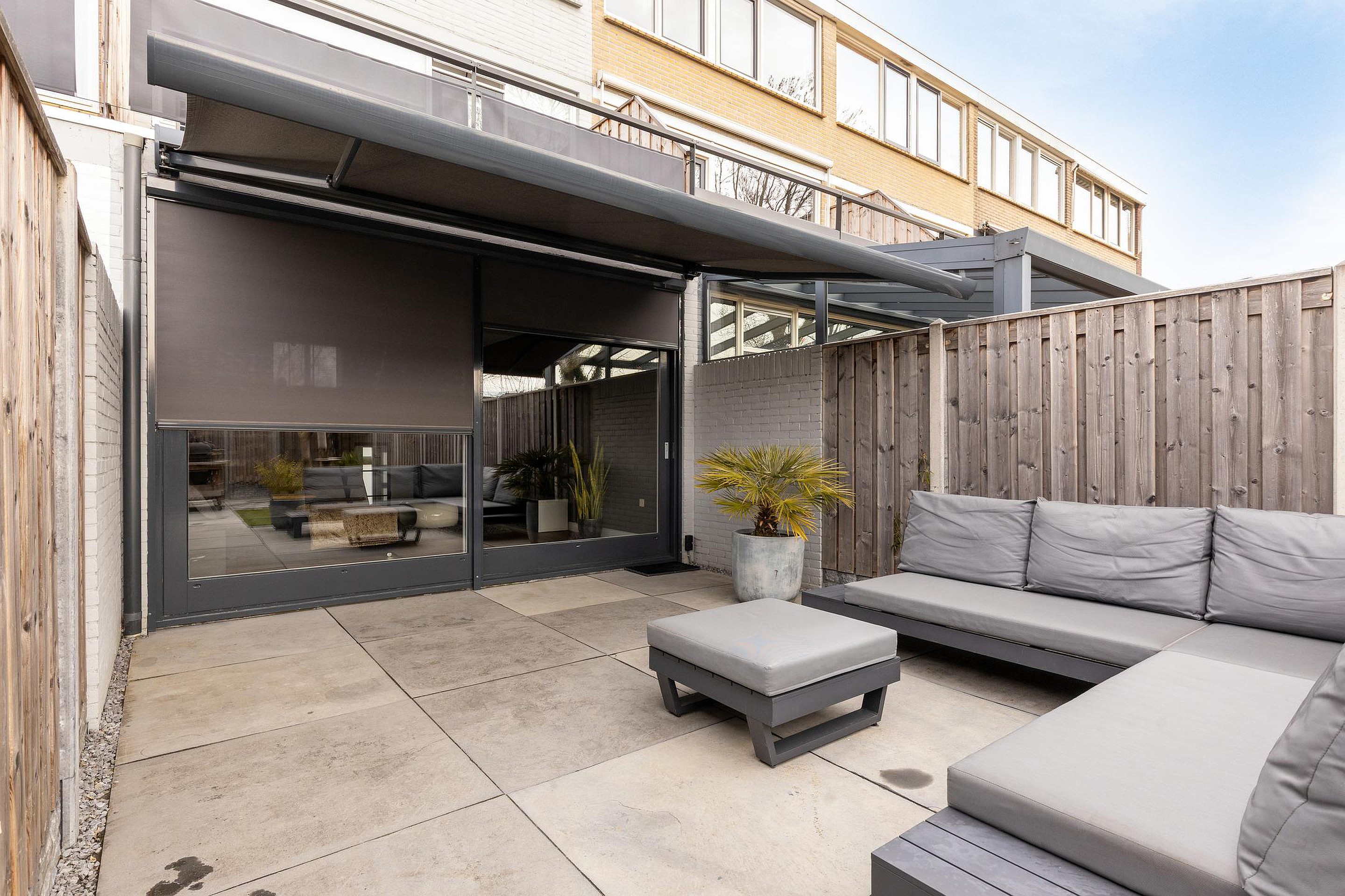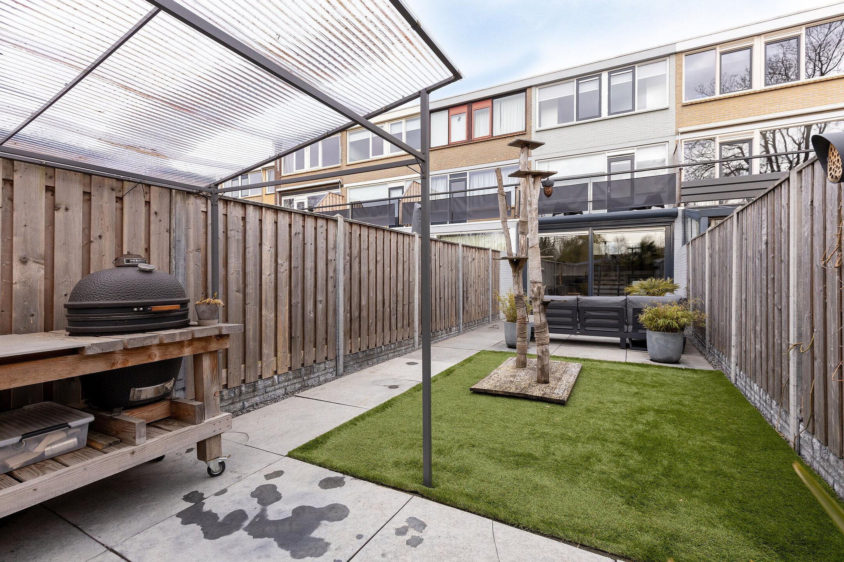 De diepe achtertuin is strak en onderhoudsvriendelijk aangelegd, met een combinatie van bestrating en groen. Het ruime terras is voorzien van een uitvalscherm en achterin is een overkapping gerealiseerd, ideaal voor een barbecue. De tuin is verzorgd en biedt voldoende privacy. Aan de voorzijde beschikt u over parkeergelegenheid op eigen terrein, wat het dagelijkse gemak compleet maakt.
