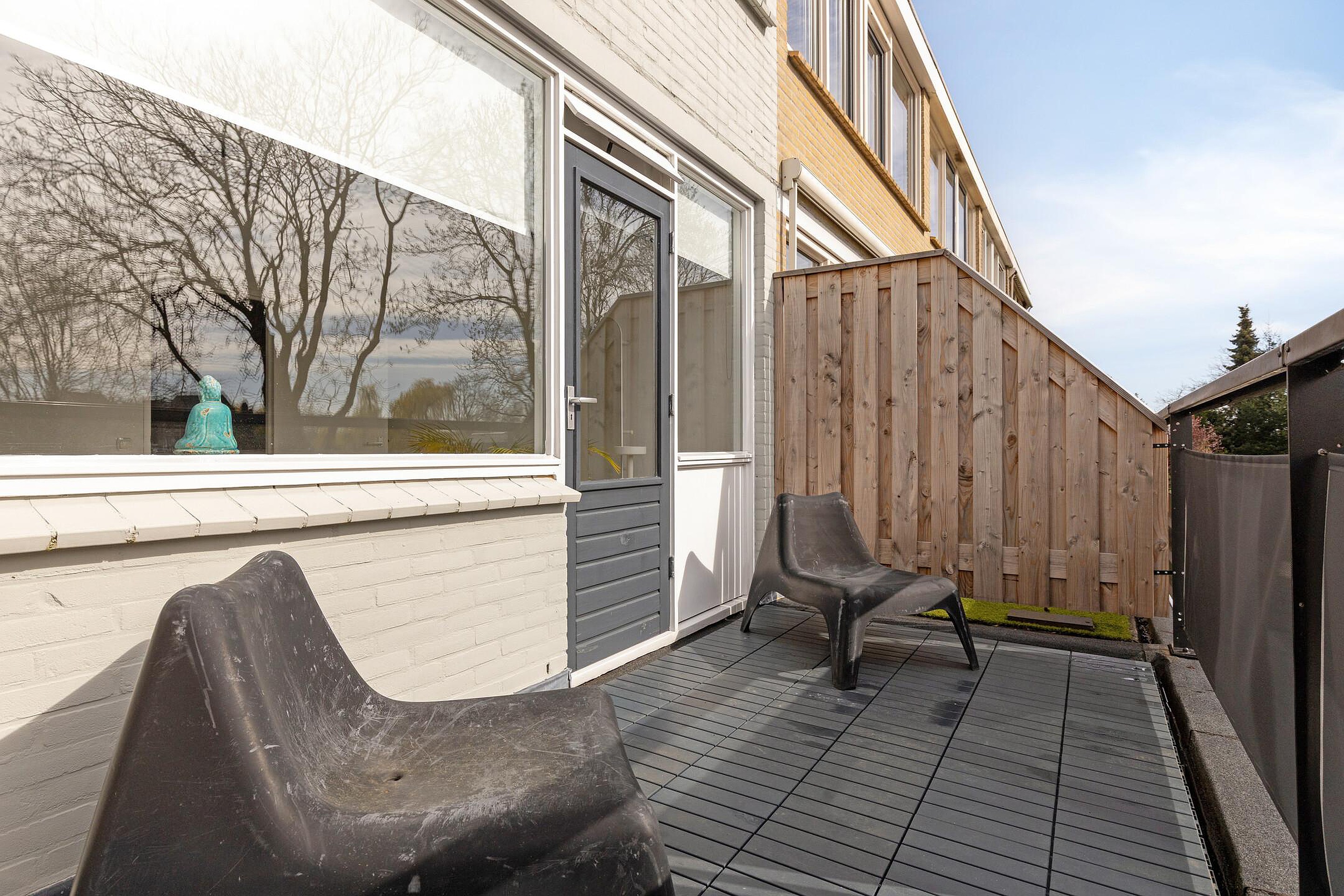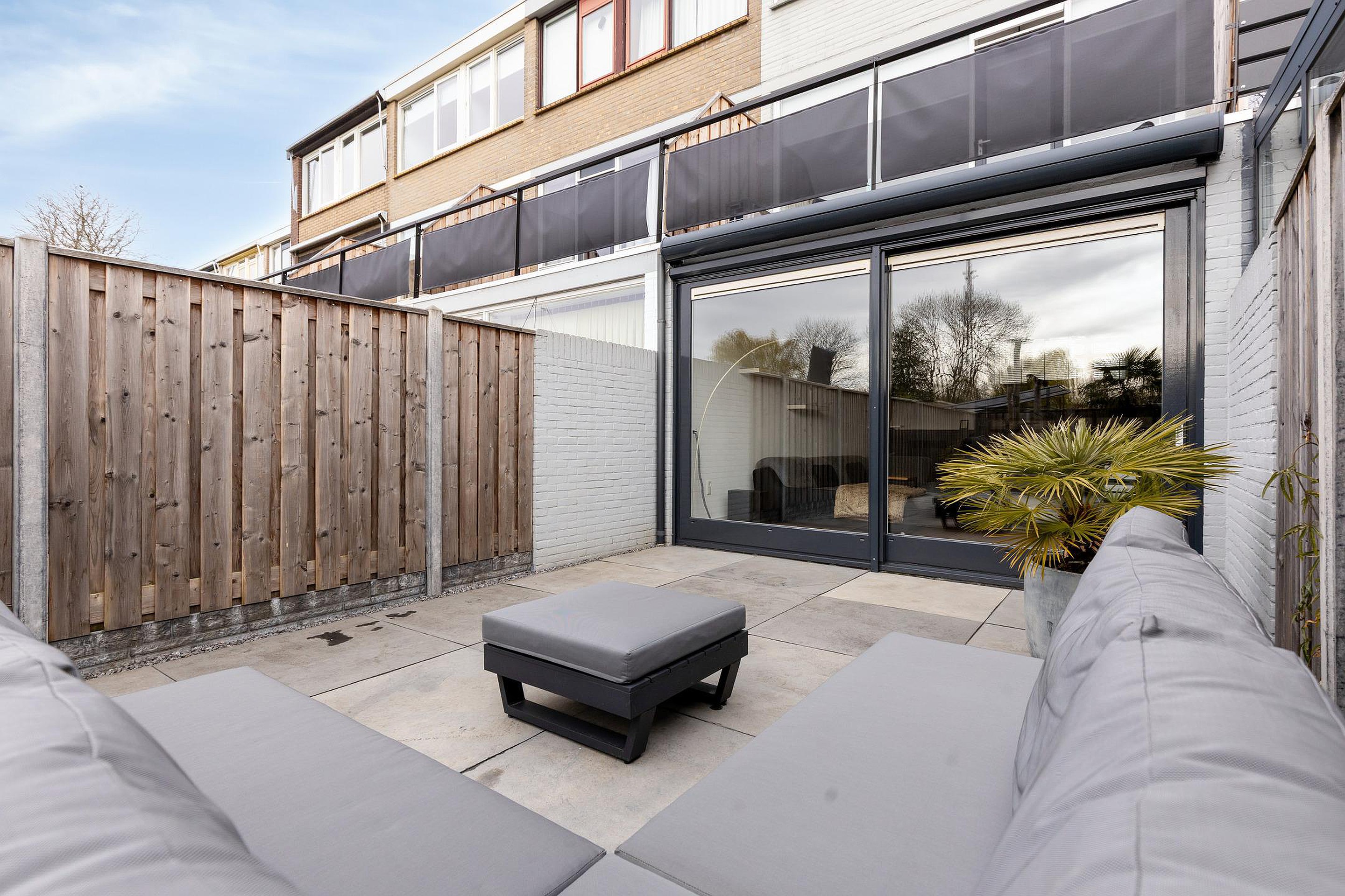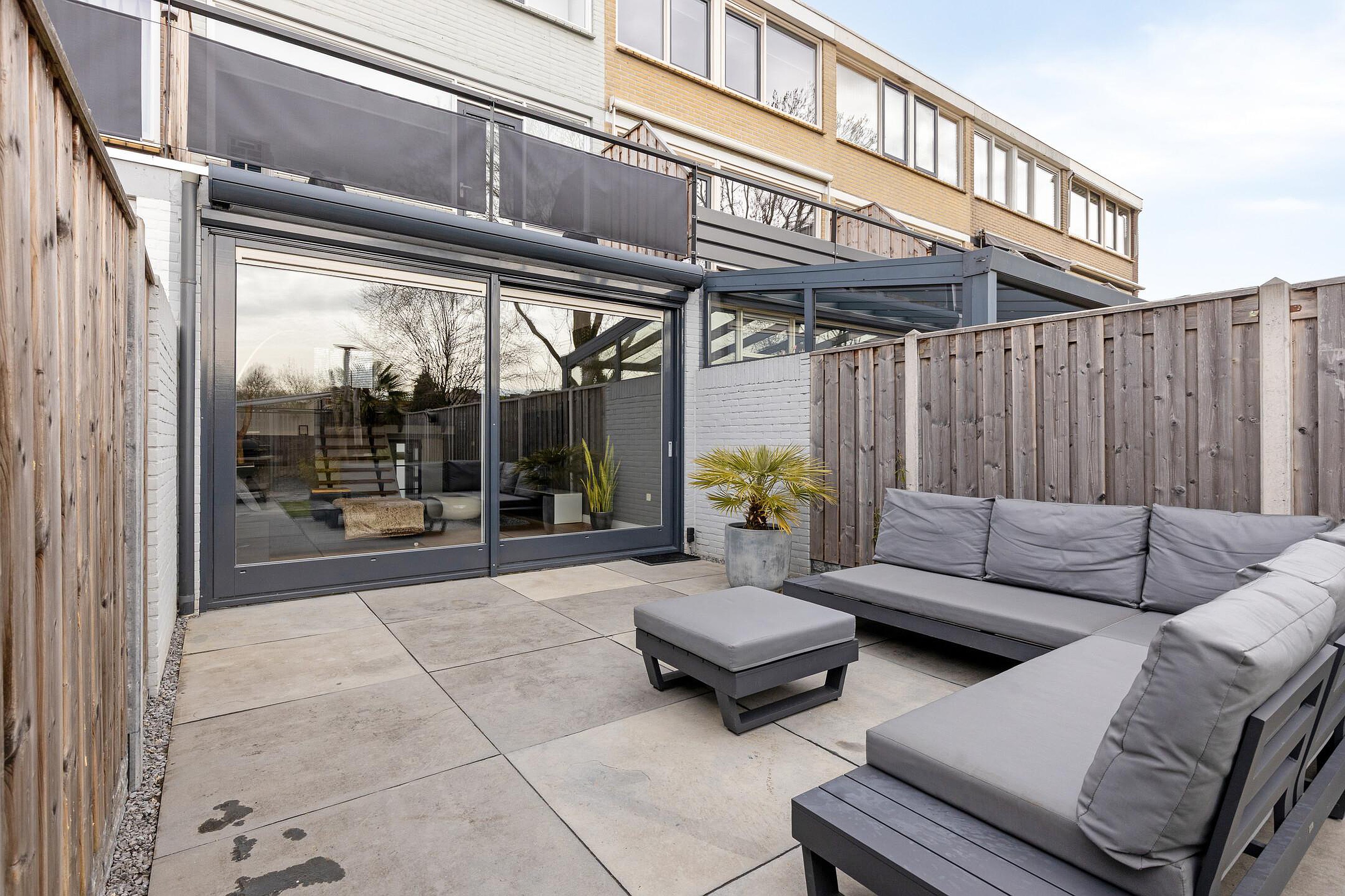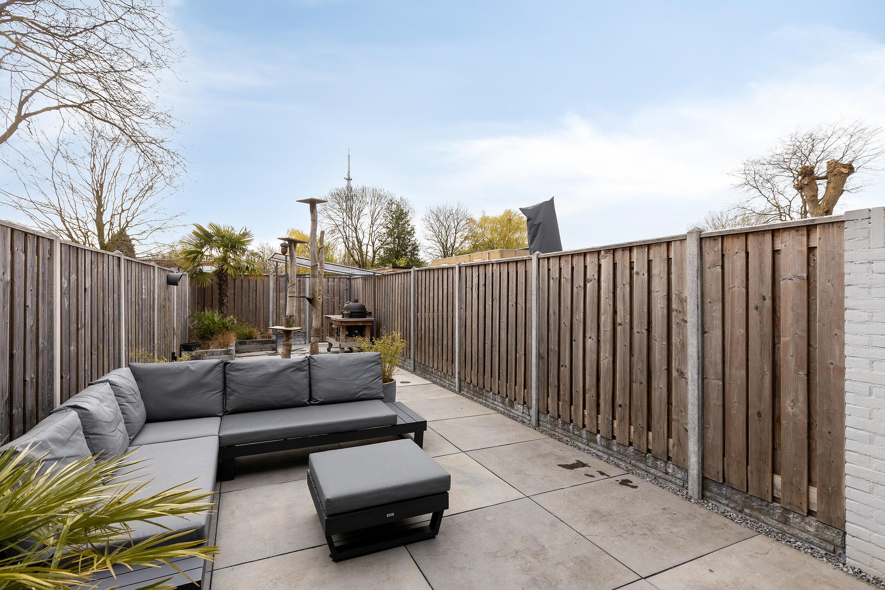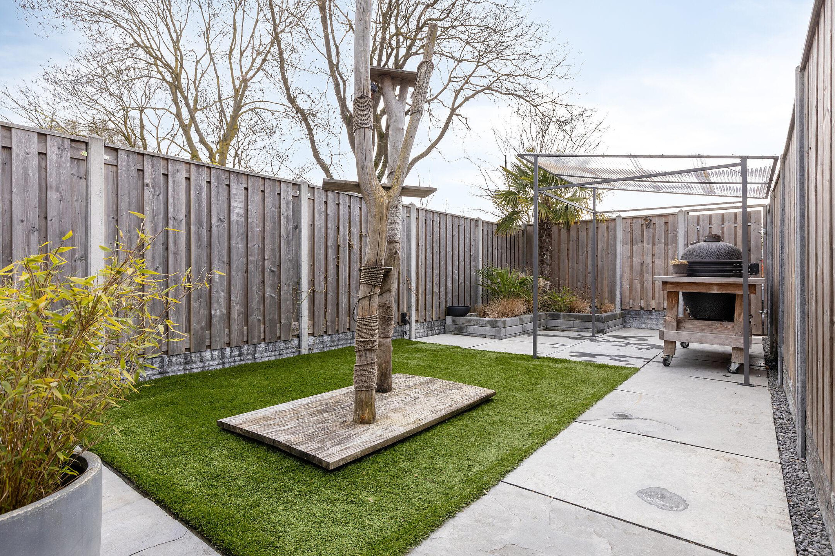 De diepe achtertuin is strak en onderhoudsvriendelijk aangelegd, met een combinatie van bestrating en groen. Het ruime terras is voorzien van een uitvalscherm en achterin is een overkapping gerealiseerd, ideaal voor een barbecue. De tuin is verzorgd en biedt voldoende privacy. Aan de voorzijde beschikt u over parkeergelegenheid op eigen terrein, wat het dagelijkse gemak compleet maakt.