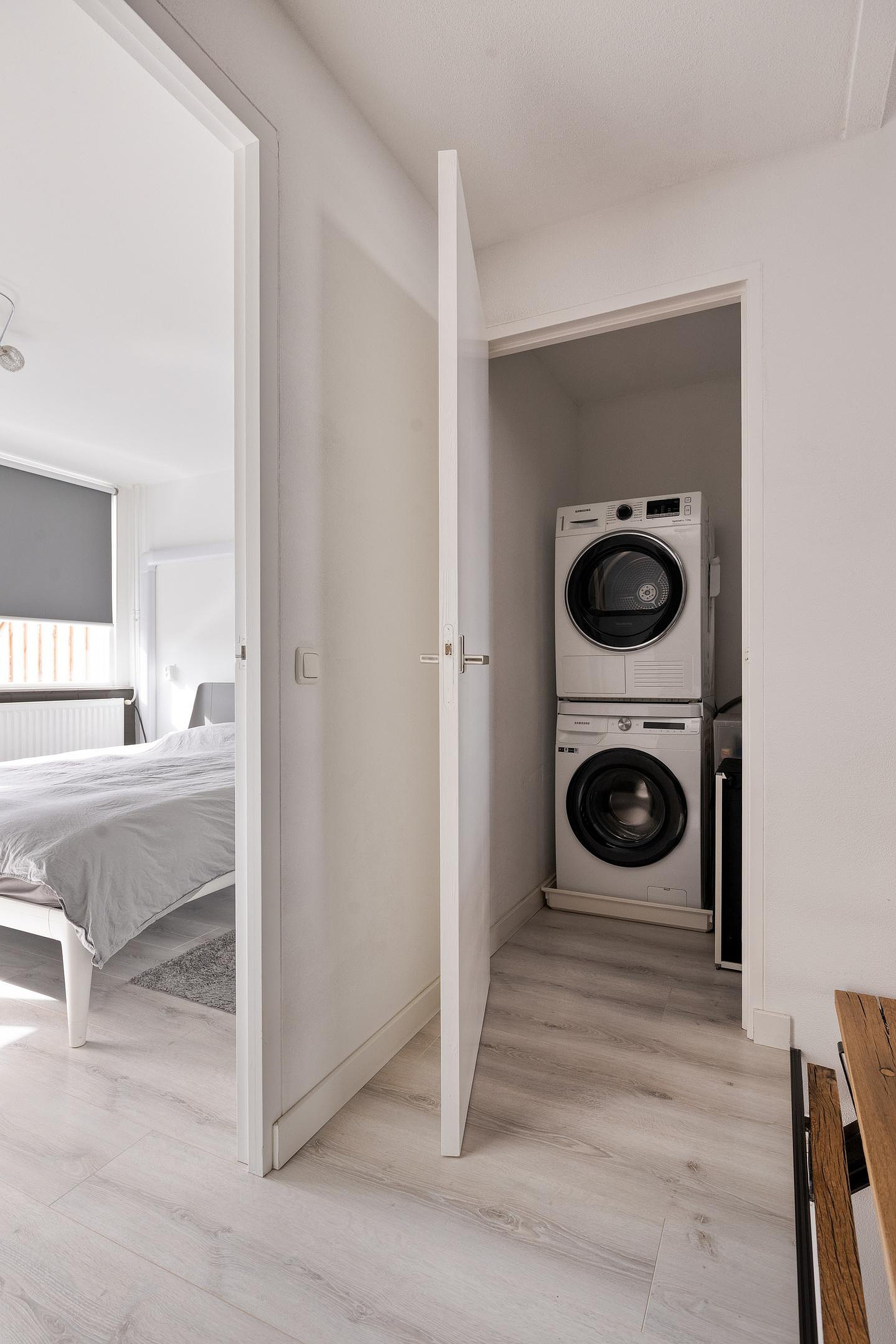 Weer een niveau hoger treft u een praktische berging met witgoedaansluitingen en de eerste slaapkamer. Deze kamer heeft direct toegang tot het terras, wat zorgt voor een fijne en zonnige plek om even naar buiten te stappen.