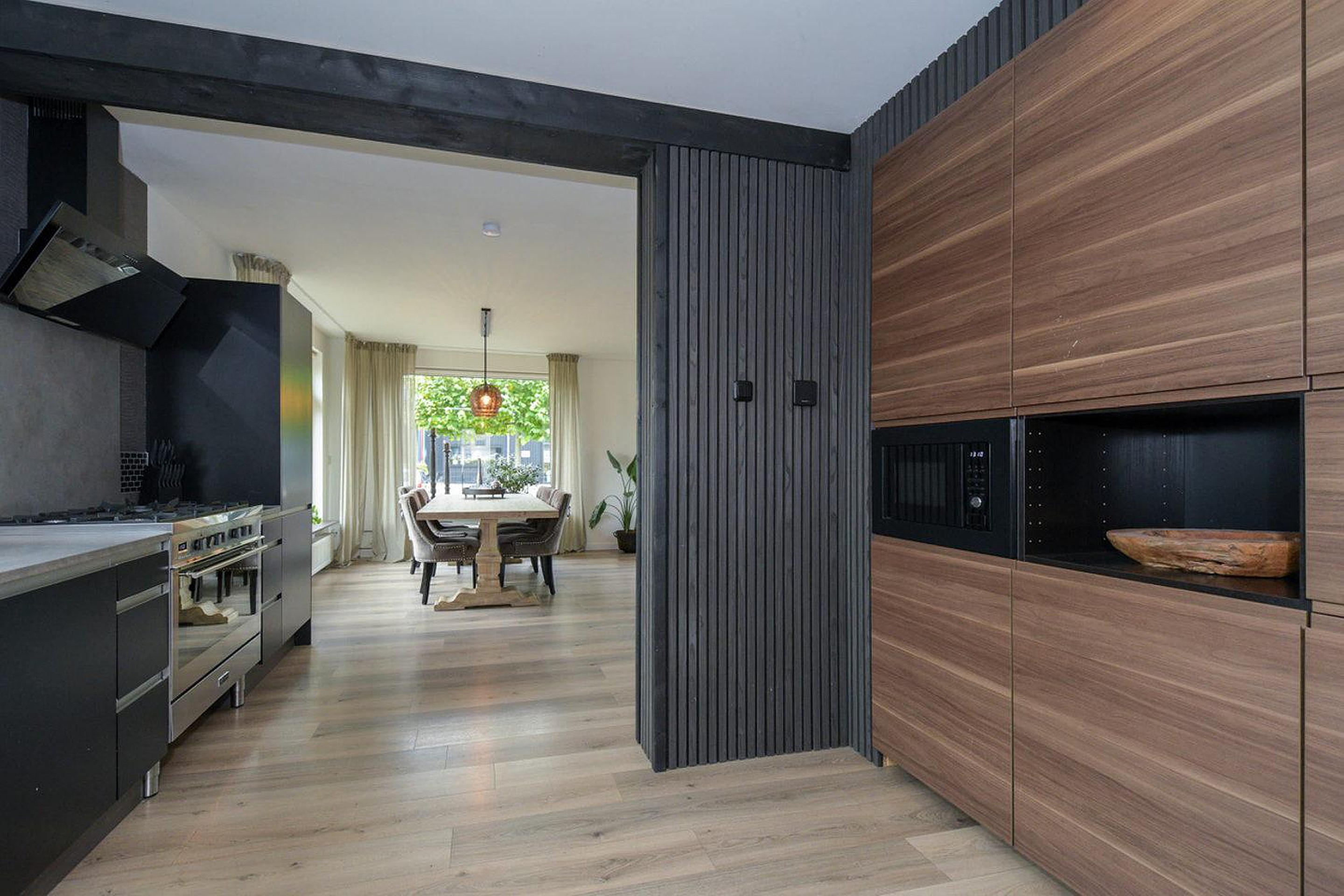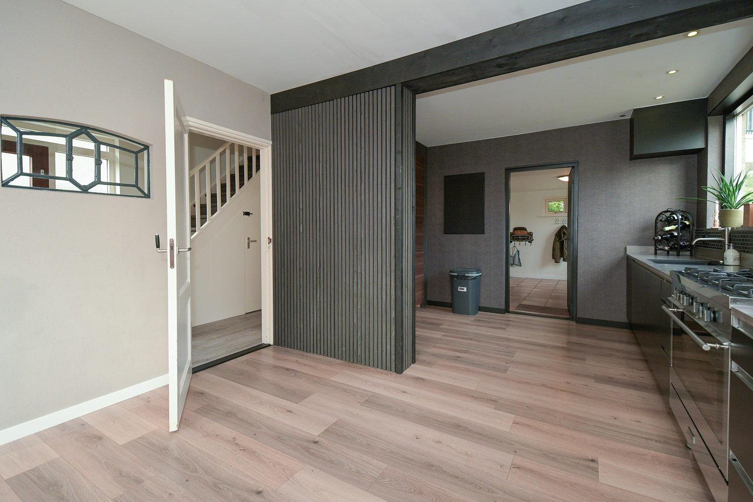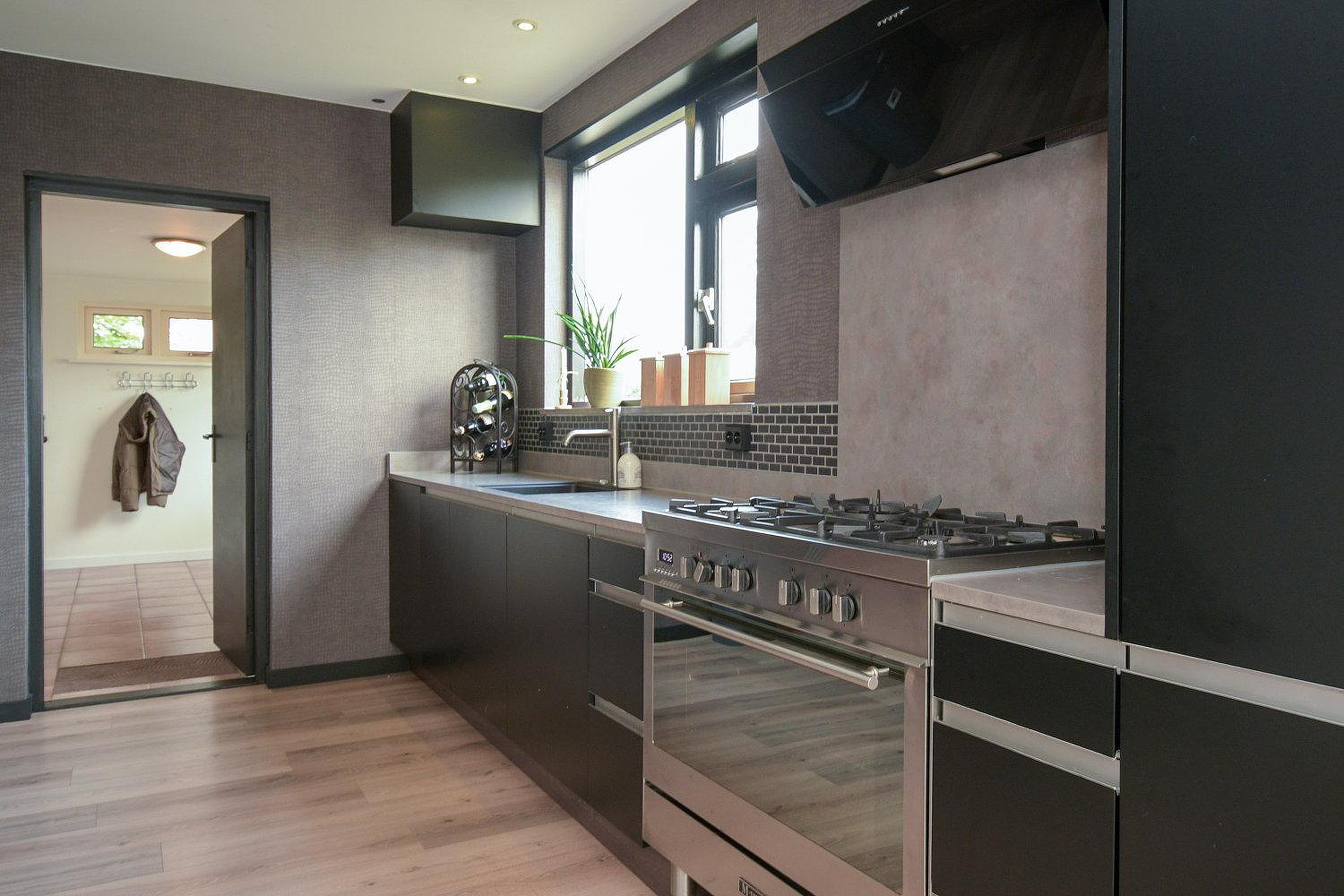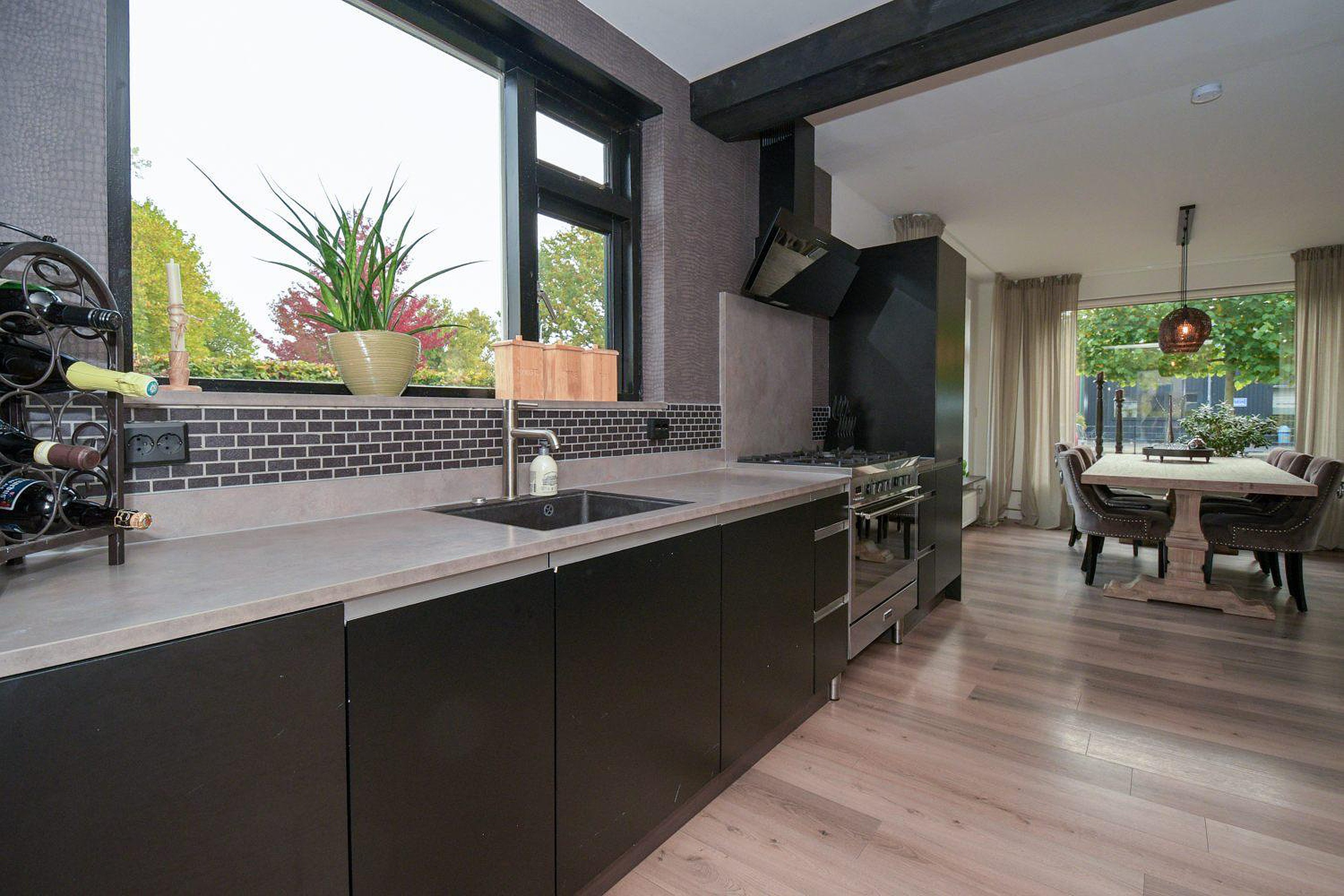 De mooie lichte woonkamer heeft een open verbinding met de moderne luxe keuken, welke beschikt over diverse inbouwapparatuur; combimagnetron, koel-vries combinatie, vaatwasser en een grote vijf-pits gasfornuis met oven. Vanuit de keuken is er nog toegang tot de bijkeuken waar de CV ketel, merk Daalderop met bouwjaar 2006 en de witgoedaansluitingen staan opgesteld.