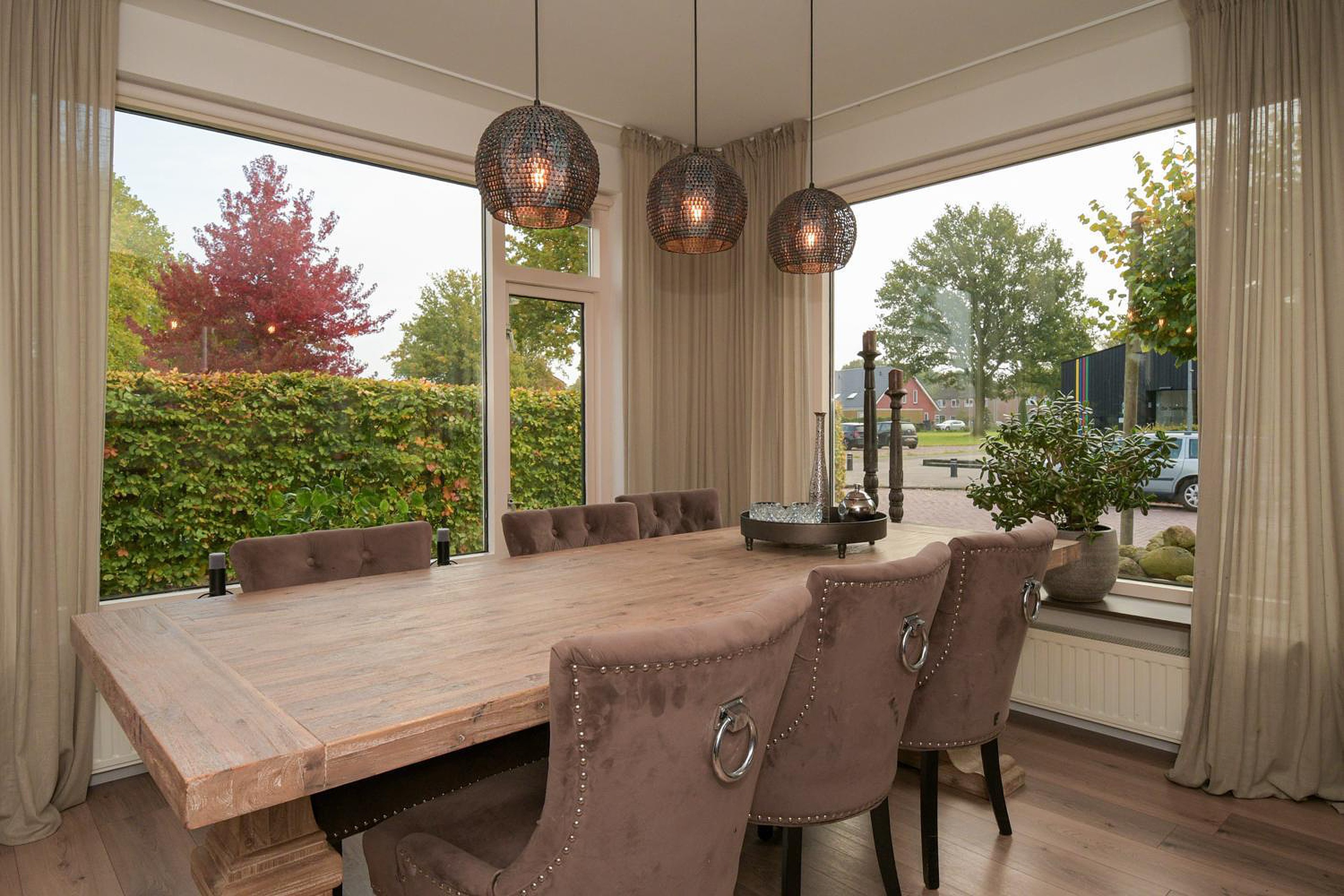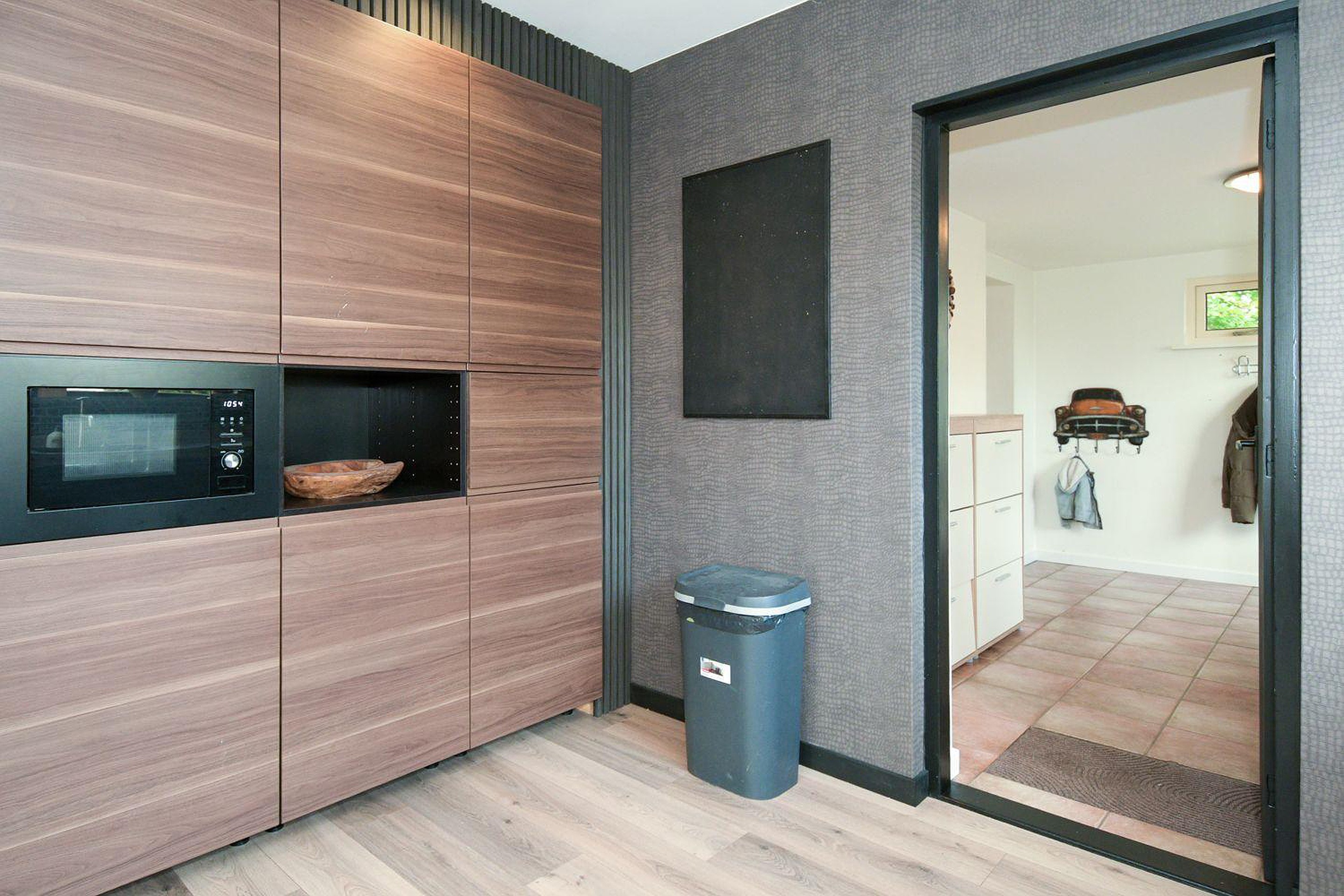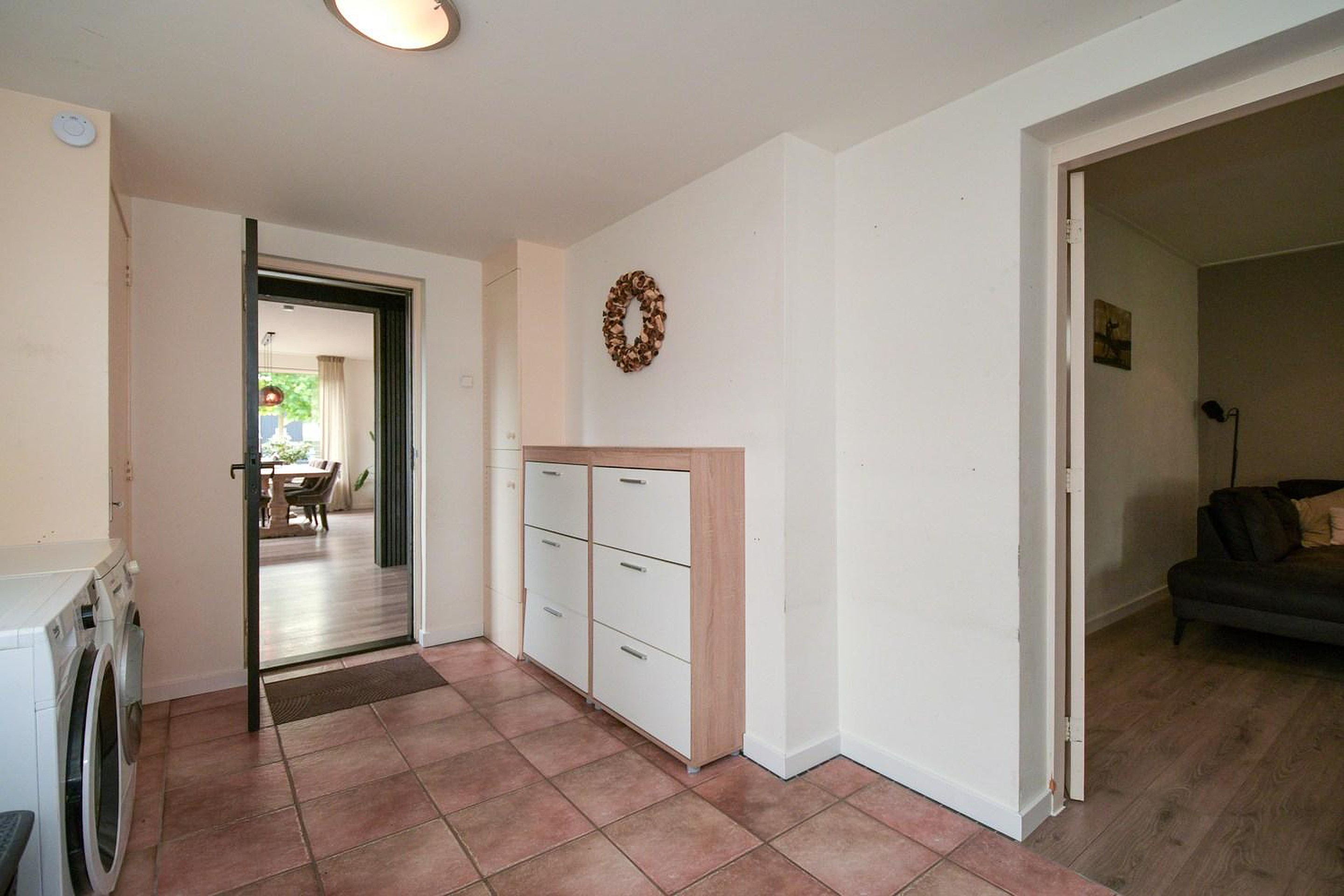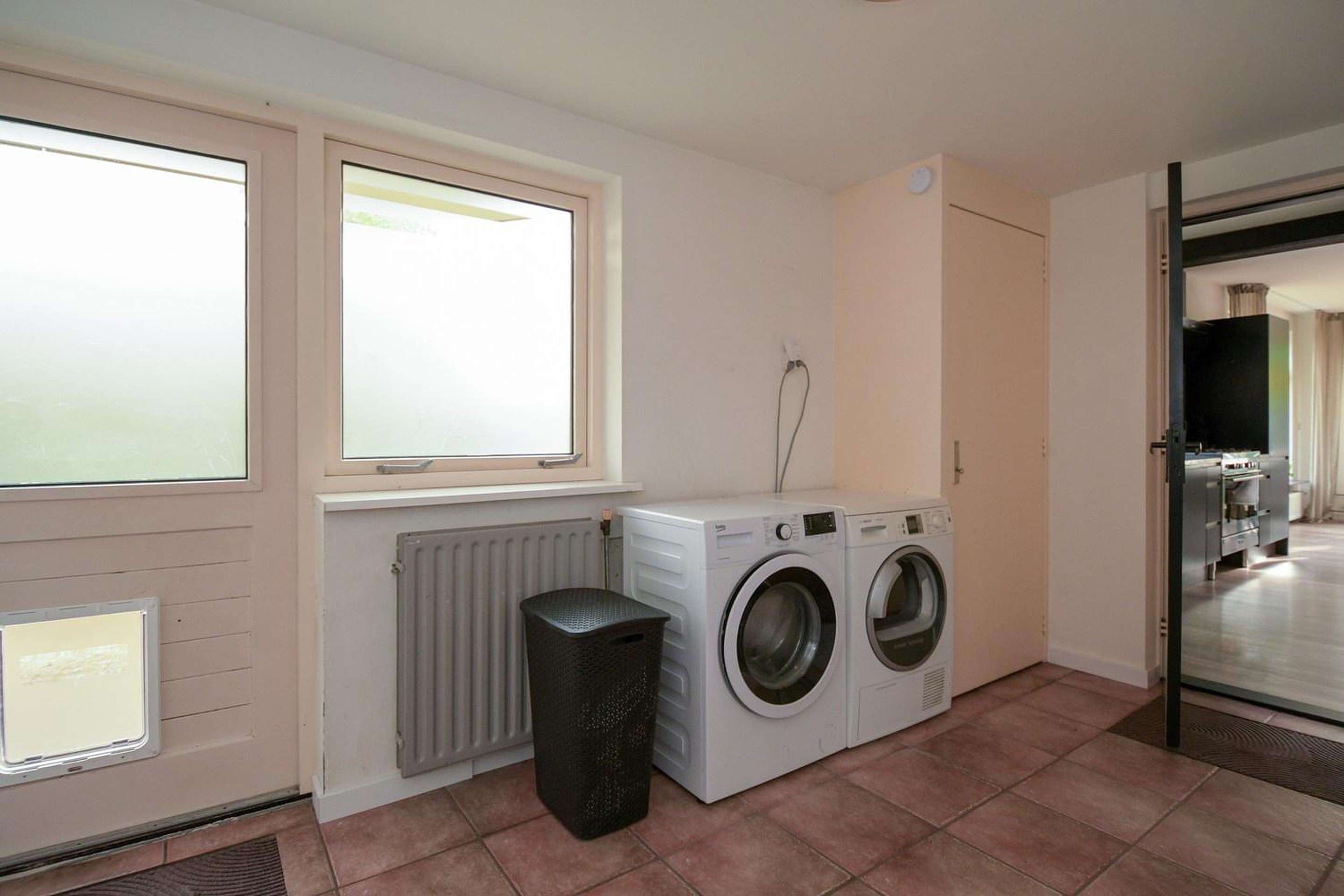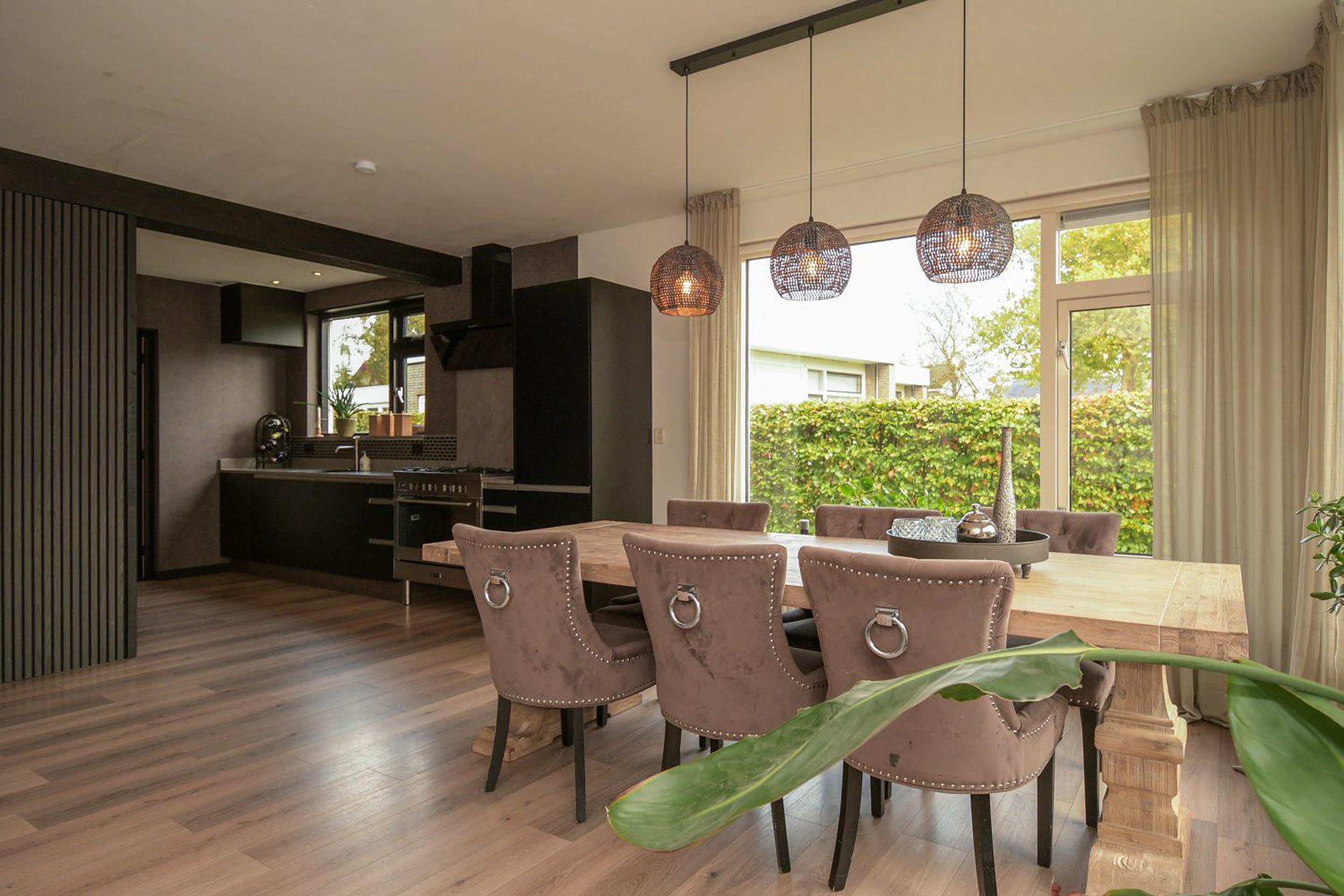 De mooie lichte woonkamer heeft een open verbinding met de moderne luxe keuken, welke beschikt over diverse inbouwapparatuur; combimagnetron, koel-vries combinatie, vaatwasser en een grote vijf-pits gasfornuis met oven. Vanuit de keuken is er nog toegang tot de bijkeuken waar de CV ketel, merk Daalderop met bouwjaar 2006 en de witgoedaansluitingen staan opgesteld.