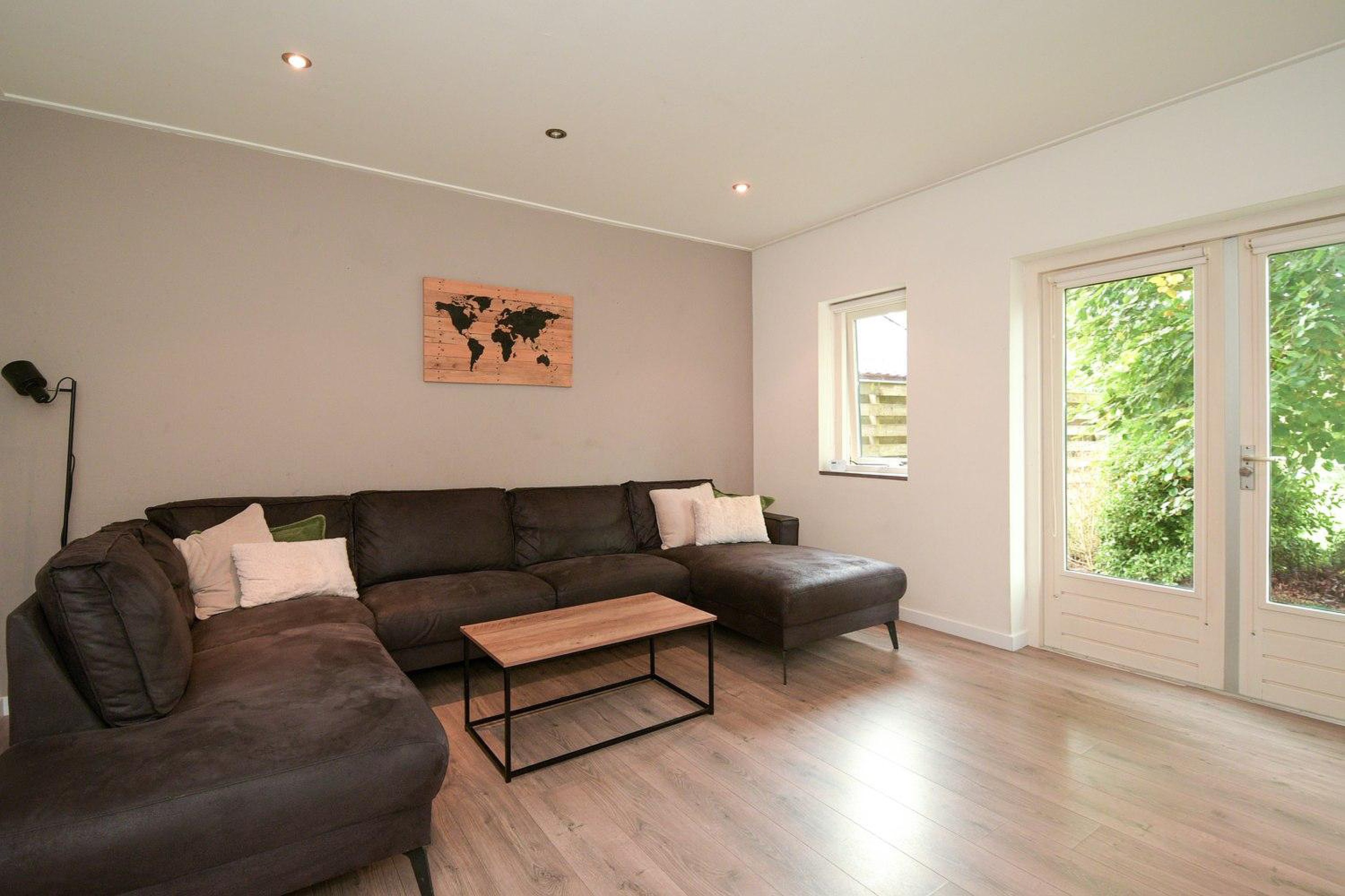 Begane grond Entree, hal, meterkast met voldoende groepen (vernieuwd) en krachtstroom, trapopgang naar de verdieping. Onder de trap bevindt zich de kelder met een oppervlakte van ca 7 m2. Vanuit de hal heb je toegang tot ruime moderne badkamer met ligbad, inloopdouche en dubbel wastafelmeubel en modern toilet (wandcloset). De slaapkamer en badkamer hebben vloerverwarming. Vanuit de badkamer kom je in de slaapkamer, welke nu in gebruik is als tuinkamer. Hier bevindt zich een sfeervolle houtkachel. Tuindeuren geven toegang tot het terras. De bijkeuken is toegankelijk vanuit de slaapkamer.
