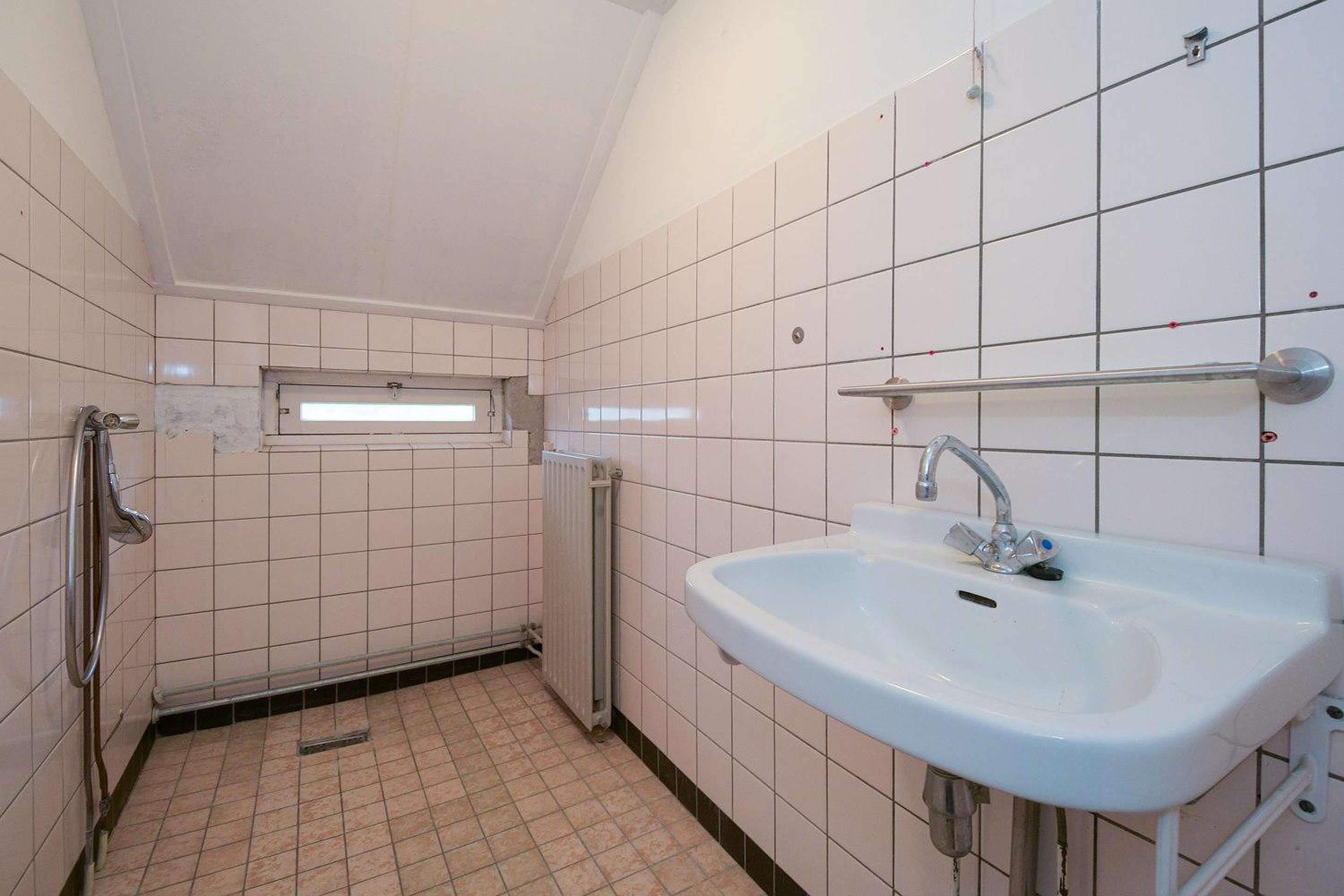 Eerste verdieping Op de eerste verdieping zijn 4 slaapkamer met een oppervlakte van respectievelijk ca 14 m2, 9 m2, 8 m2 en 10 m2, waarvan één toegang heeft tot een groot dakterras. De badkamer is eenvoudig en heeft de beschikking over een douche en een wastafel. Momenteel is de badkamer niet meer in gebruik, maar kan weer in gebruik worden genomen als afvoer en wateraanvoer weer zijn aangesloten.