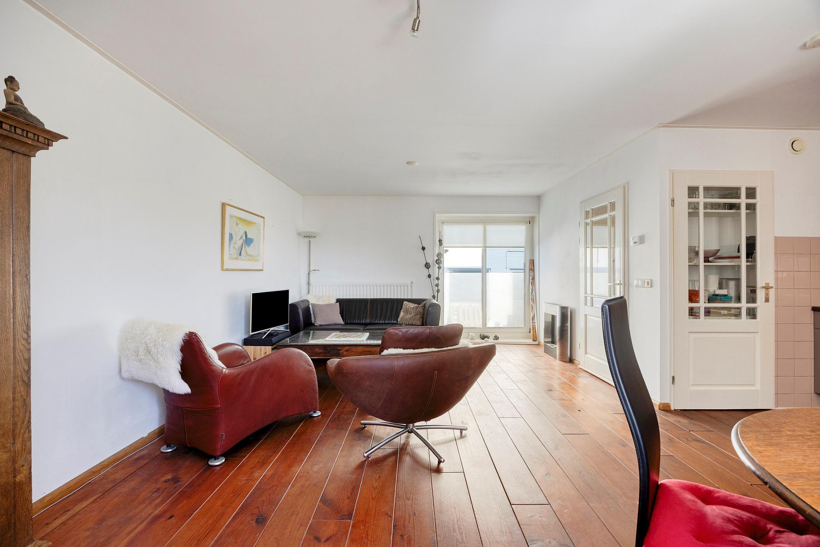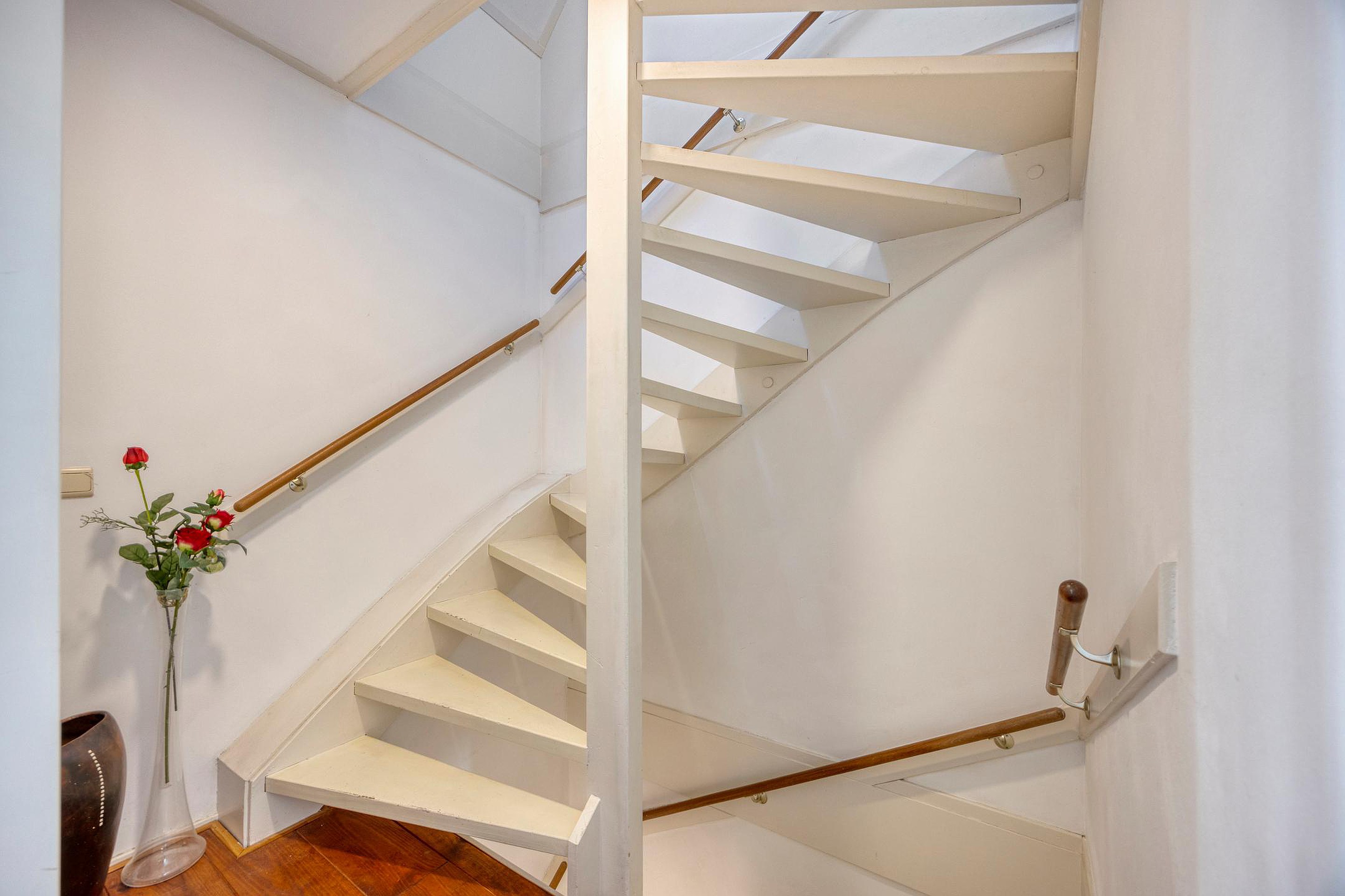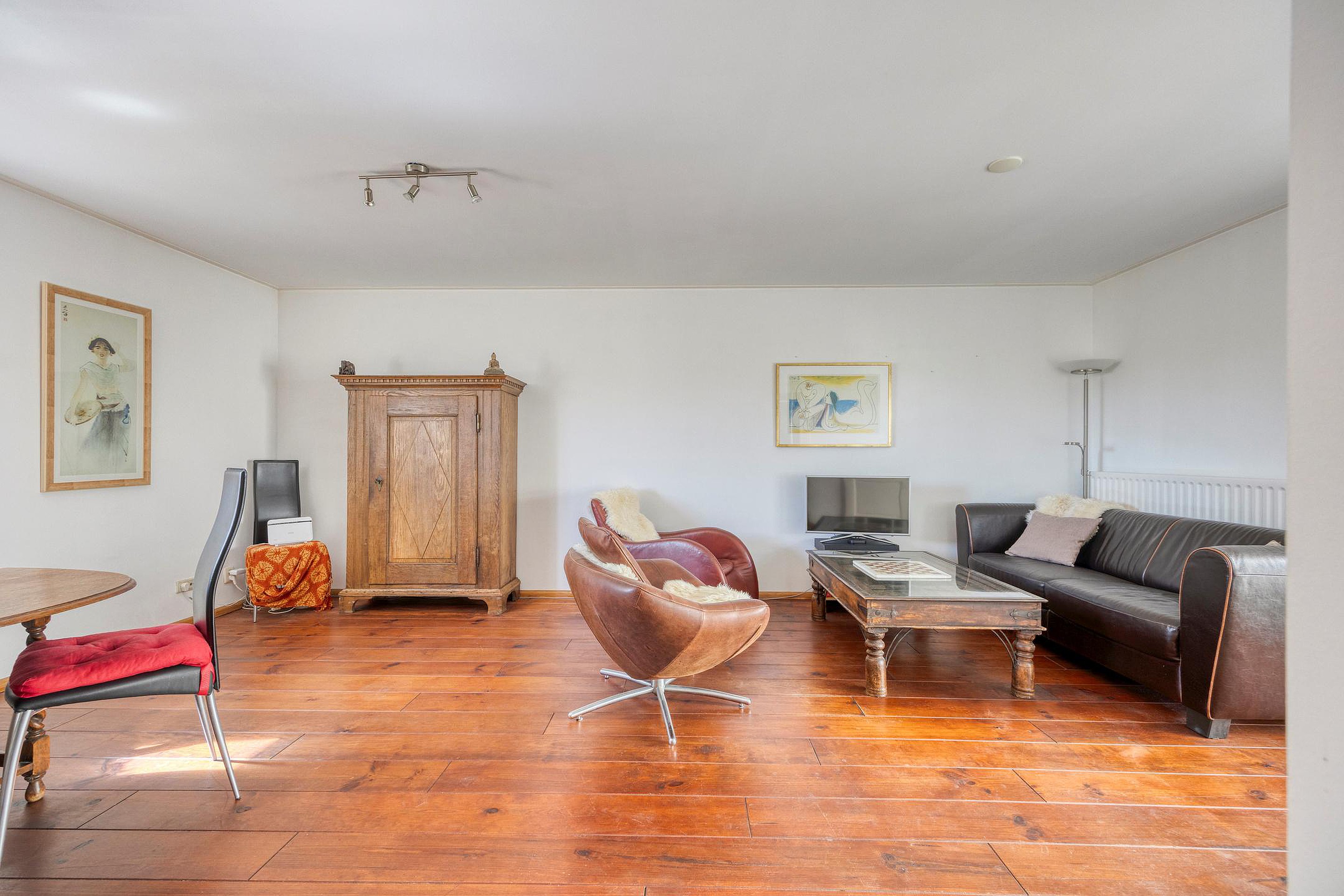 Eerste verdieping Via de trap in de hal bereiken we de eerste verdieping: een lichte, open woonkamer met een praktisch hoog geplaatst (verhuis)raam - aan de zijde van de Bovenkade - dat mooi uitzicht biedt en extra daglicht binnenlaat.