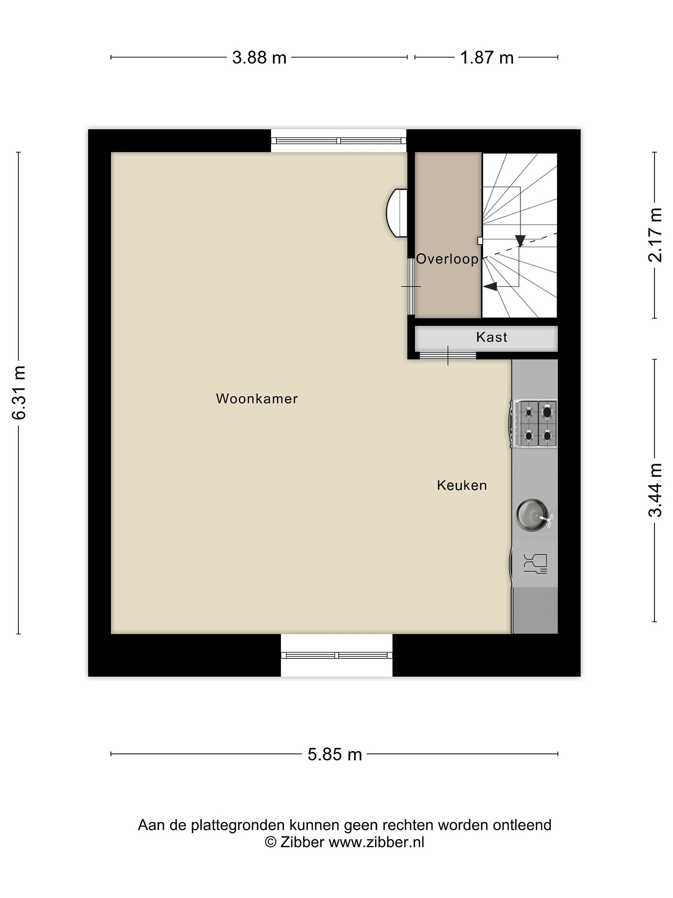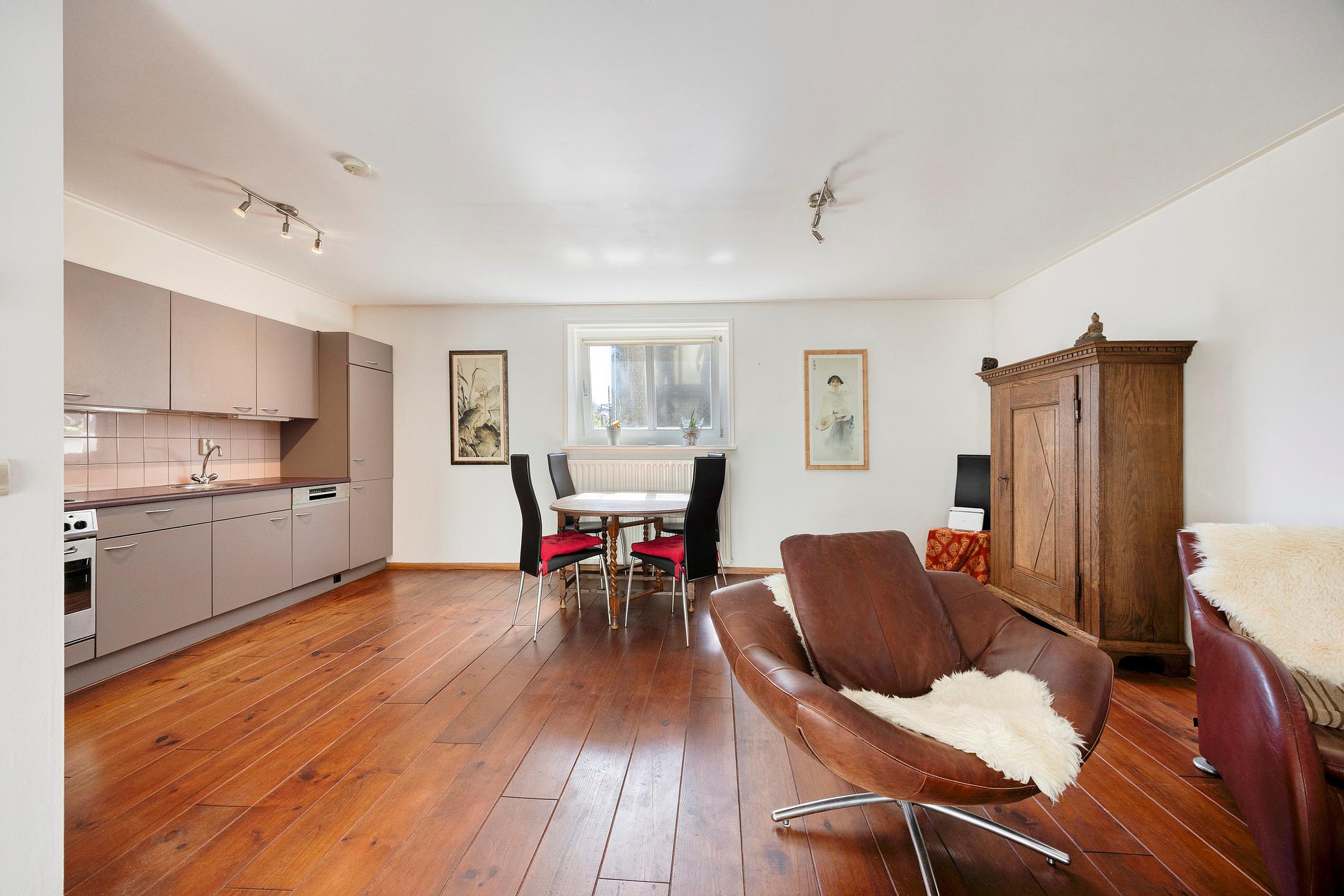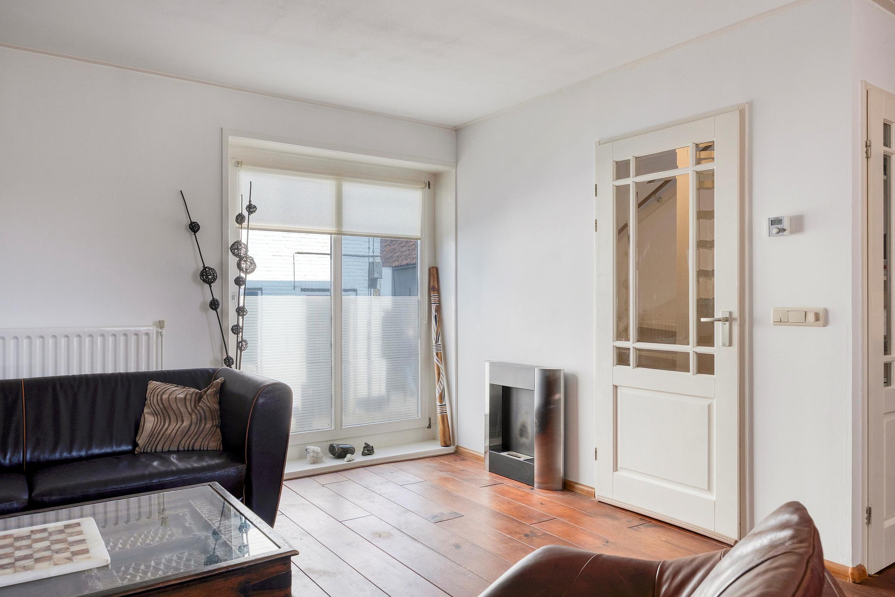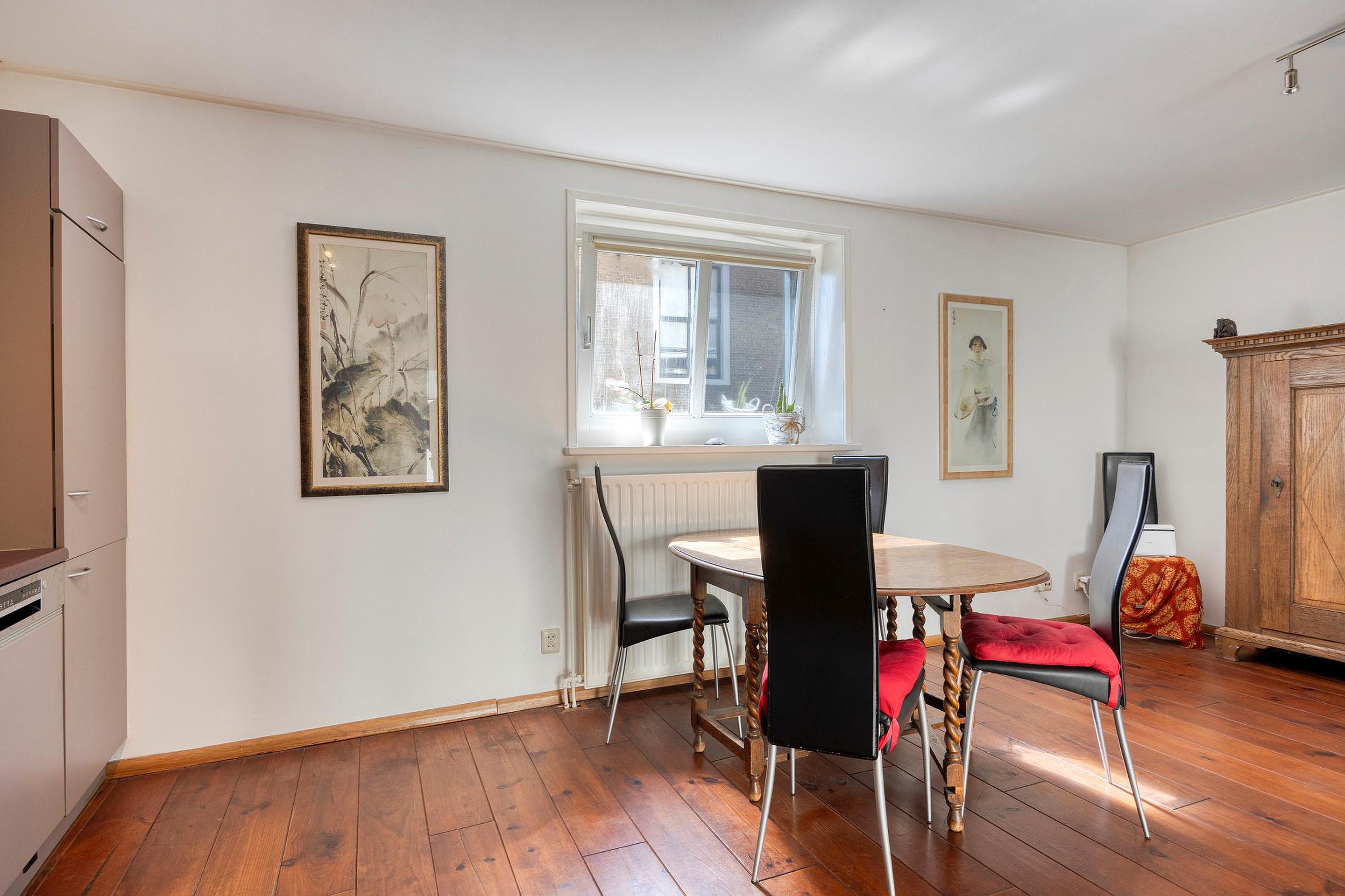 Eerste verdieping Via de trap in de hal bereiken we de eerste verdieping: een lichte, open woonkamer met een praktisch hoog geplaatst (verhuis)raam - aan de zijde van de Bovenkade - dat mooi uitzicht biedt en extra daglicht binnenlaat.